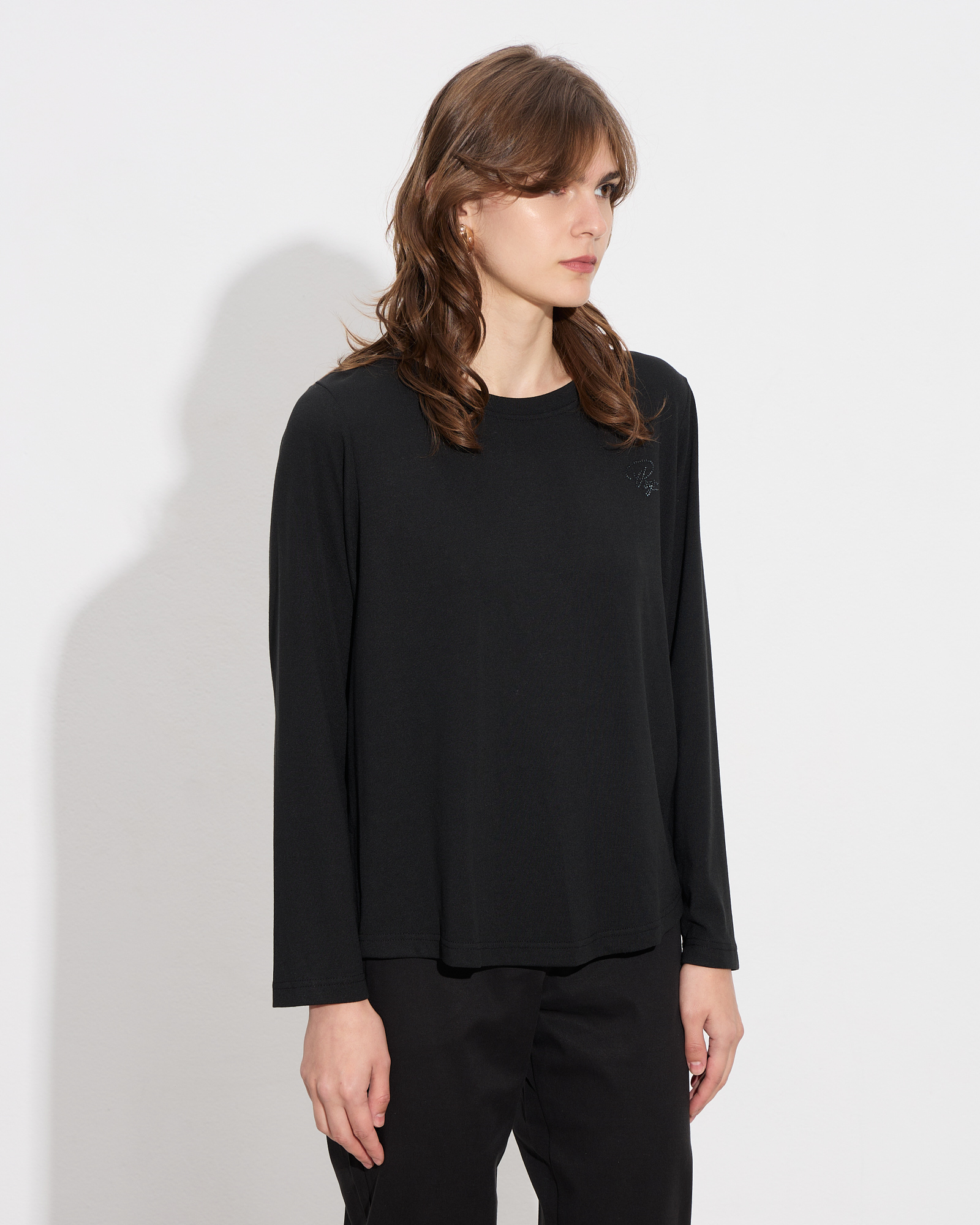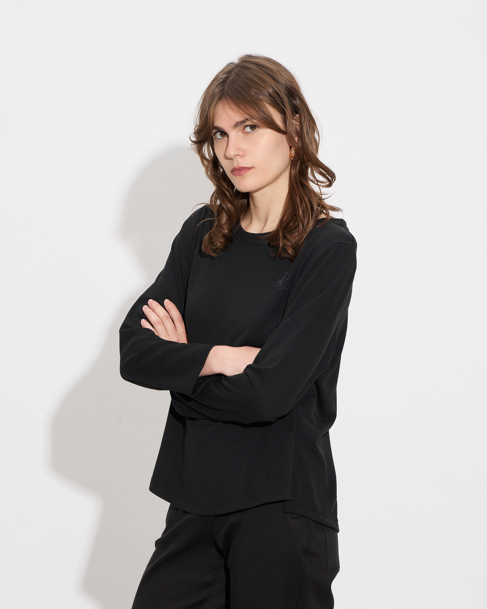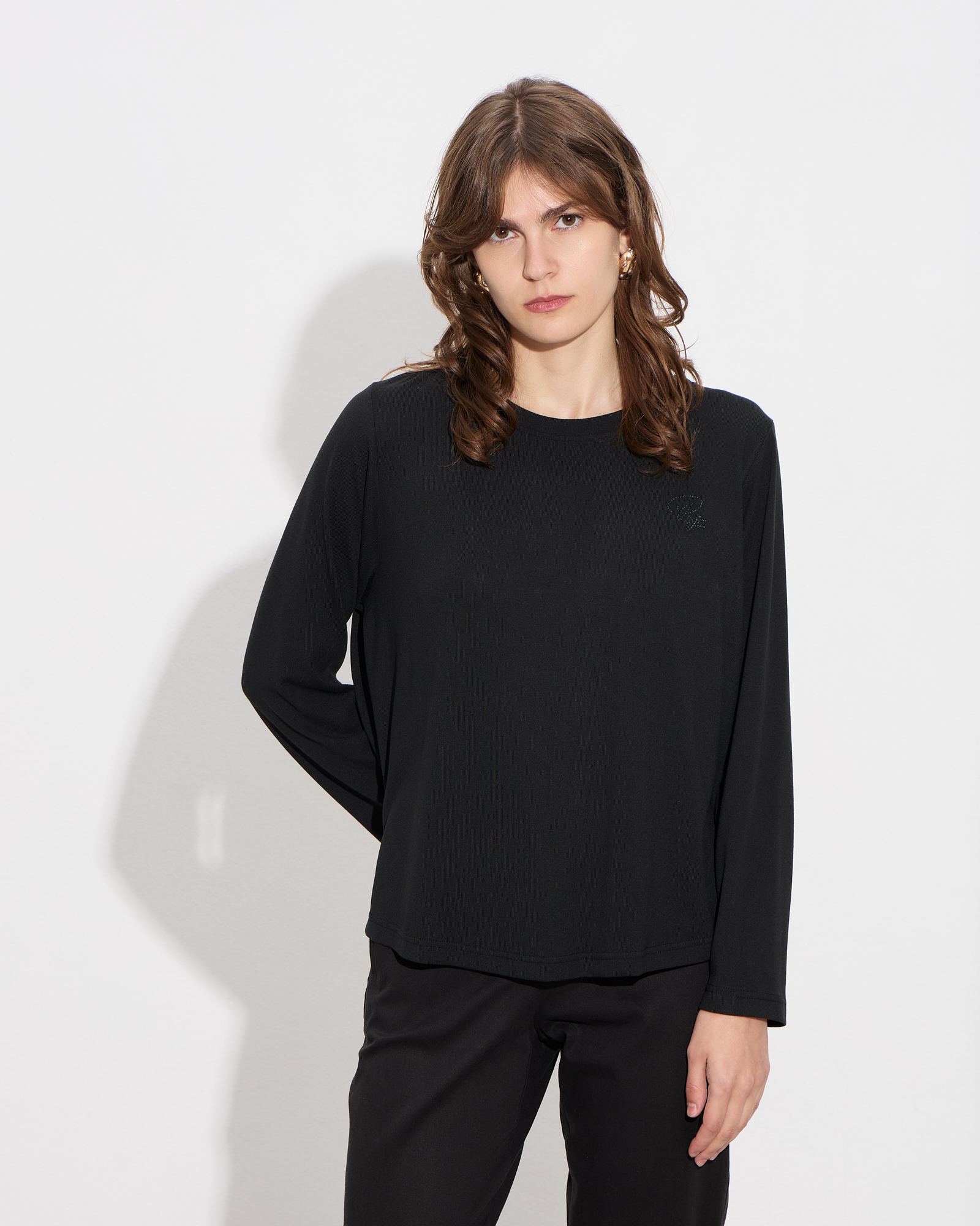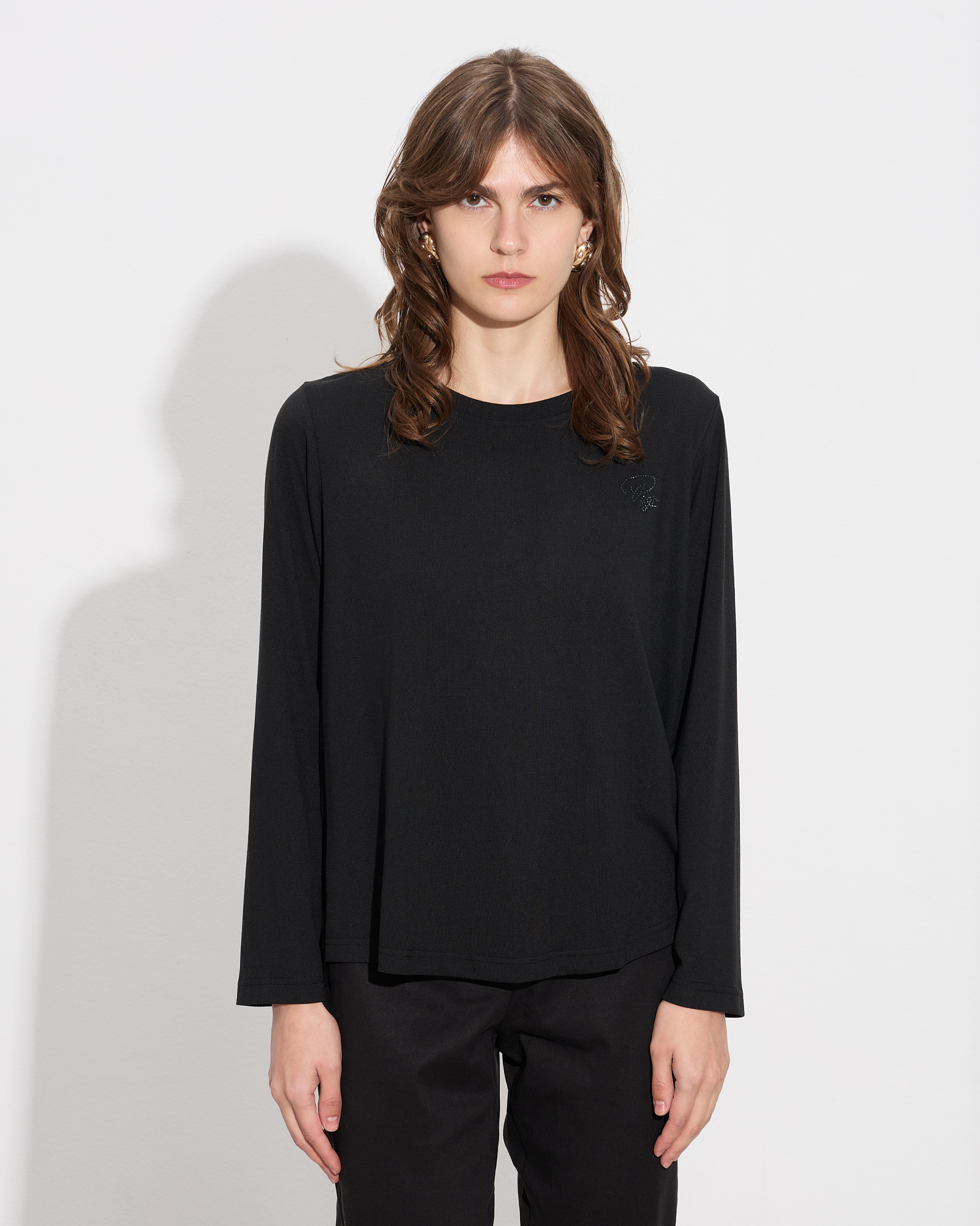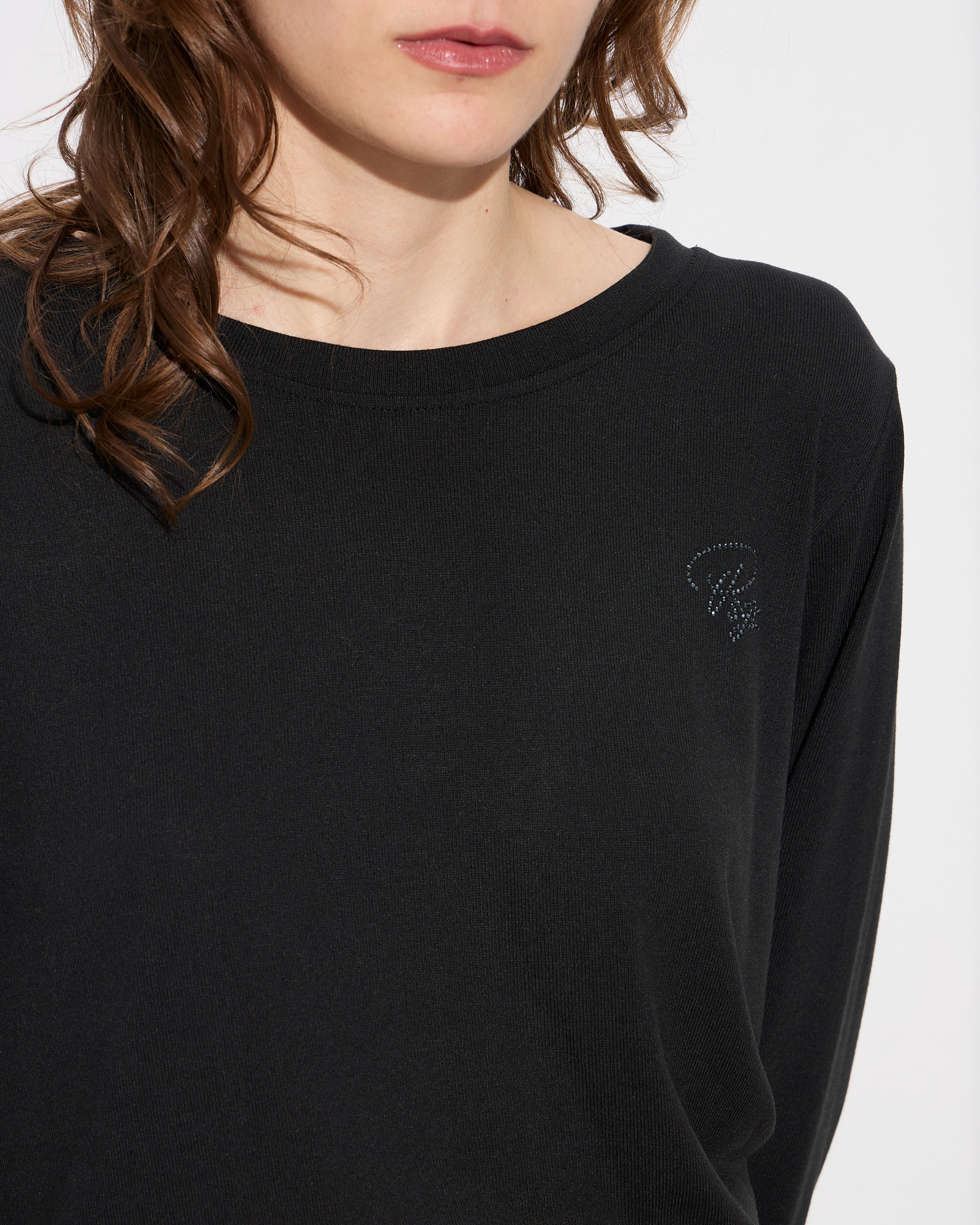 Μπλούζα με στρογγυλή λαιμόκοψη, μακρύ μανίκι, κουφόπιετα στο πίσω μέρος, λογότυπο με στρας μπροστά, διακριτικά σκισίματα στο τελείωμα σε άνετη γραμμή
