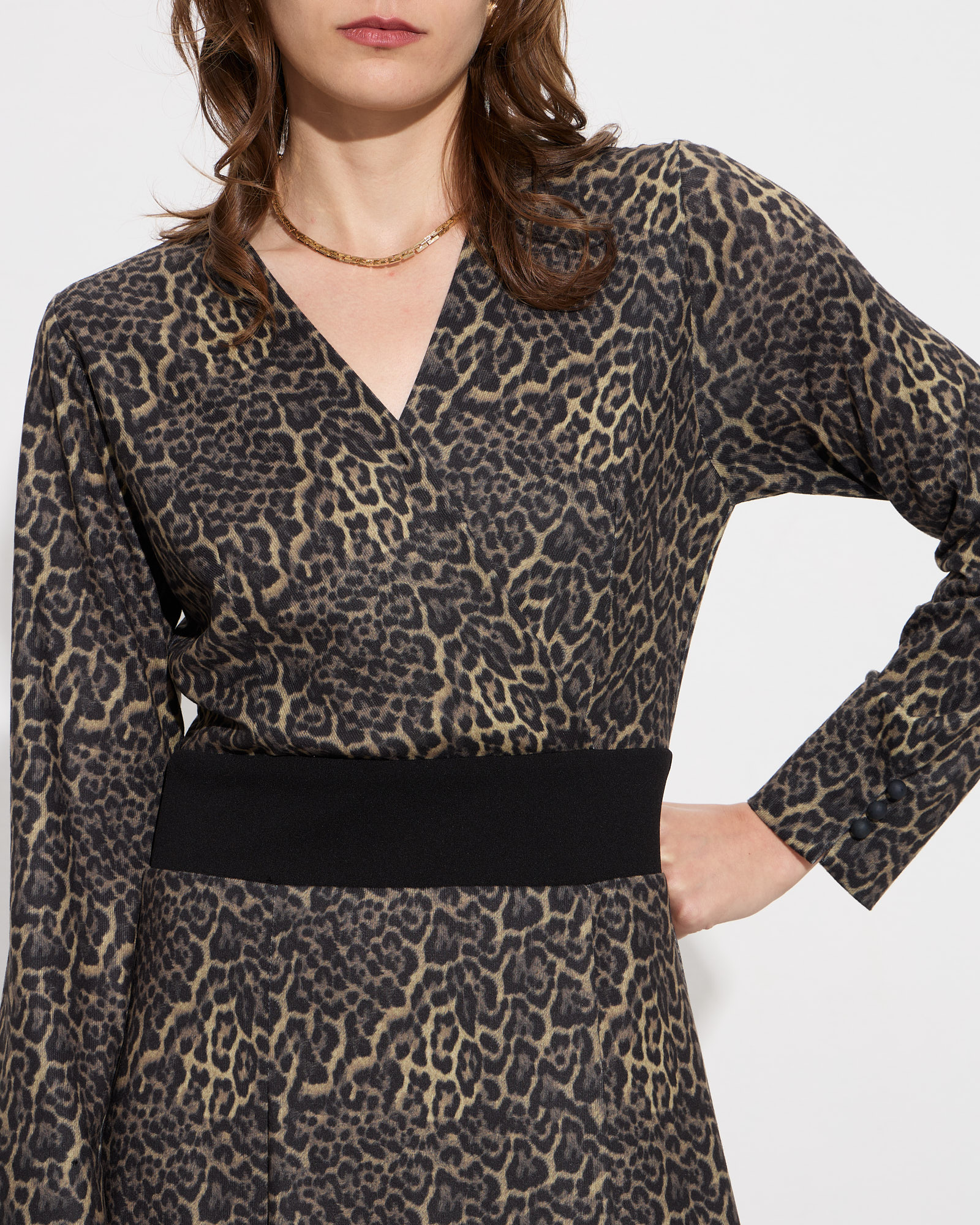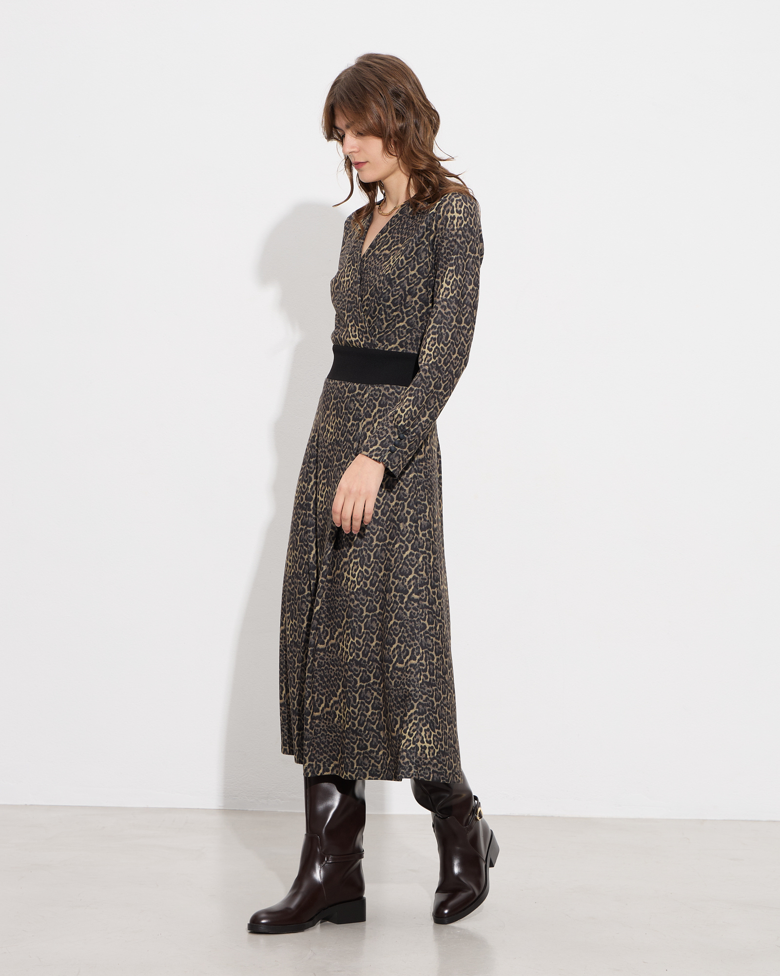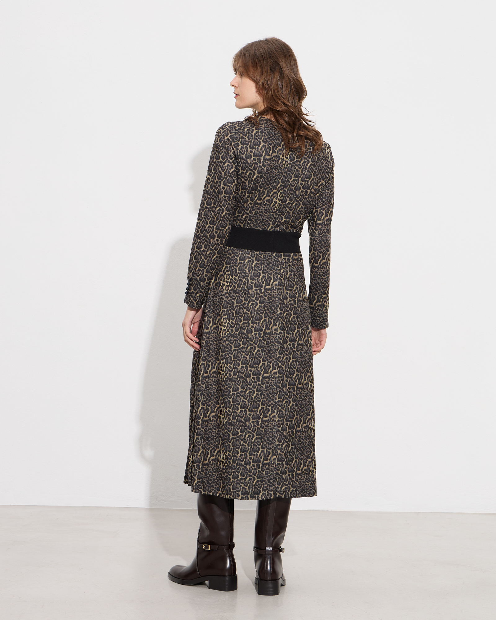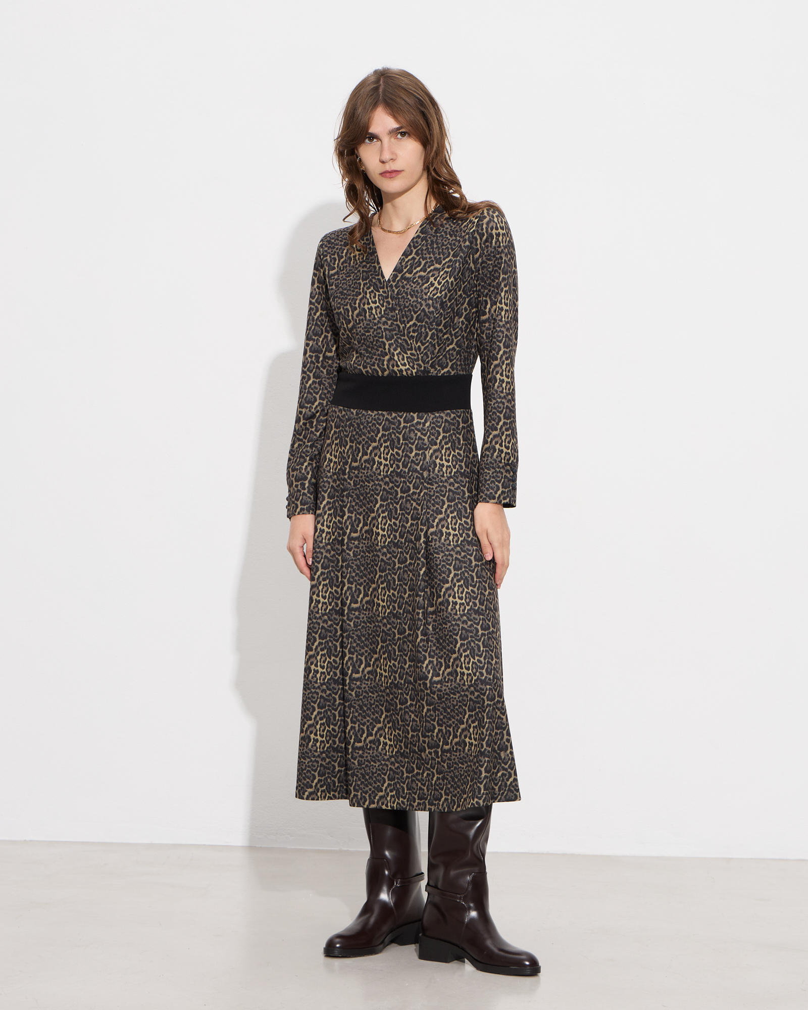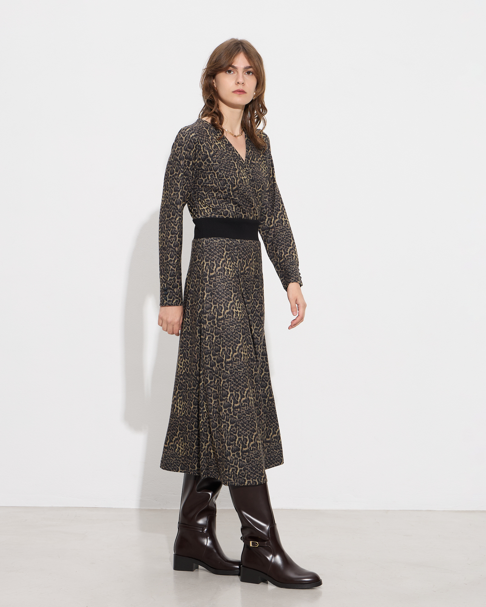 Φόρεμα midi λεοπάρ με V λαιμόκοψη, κρουαζέ, κλείσιμο με φερμουάρ στο πίσω μέρος, μαλακό ύφασμα με ελαστικότητα