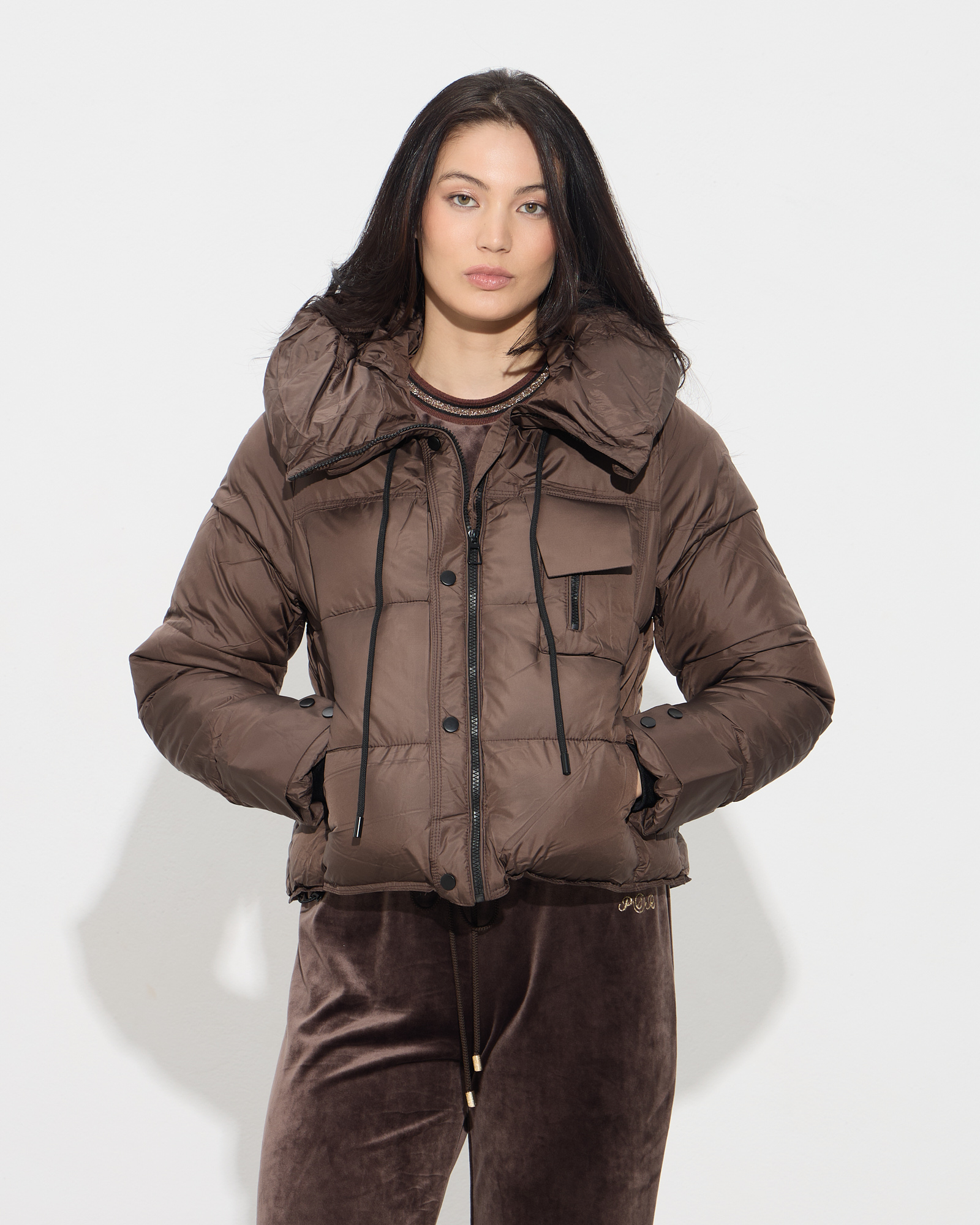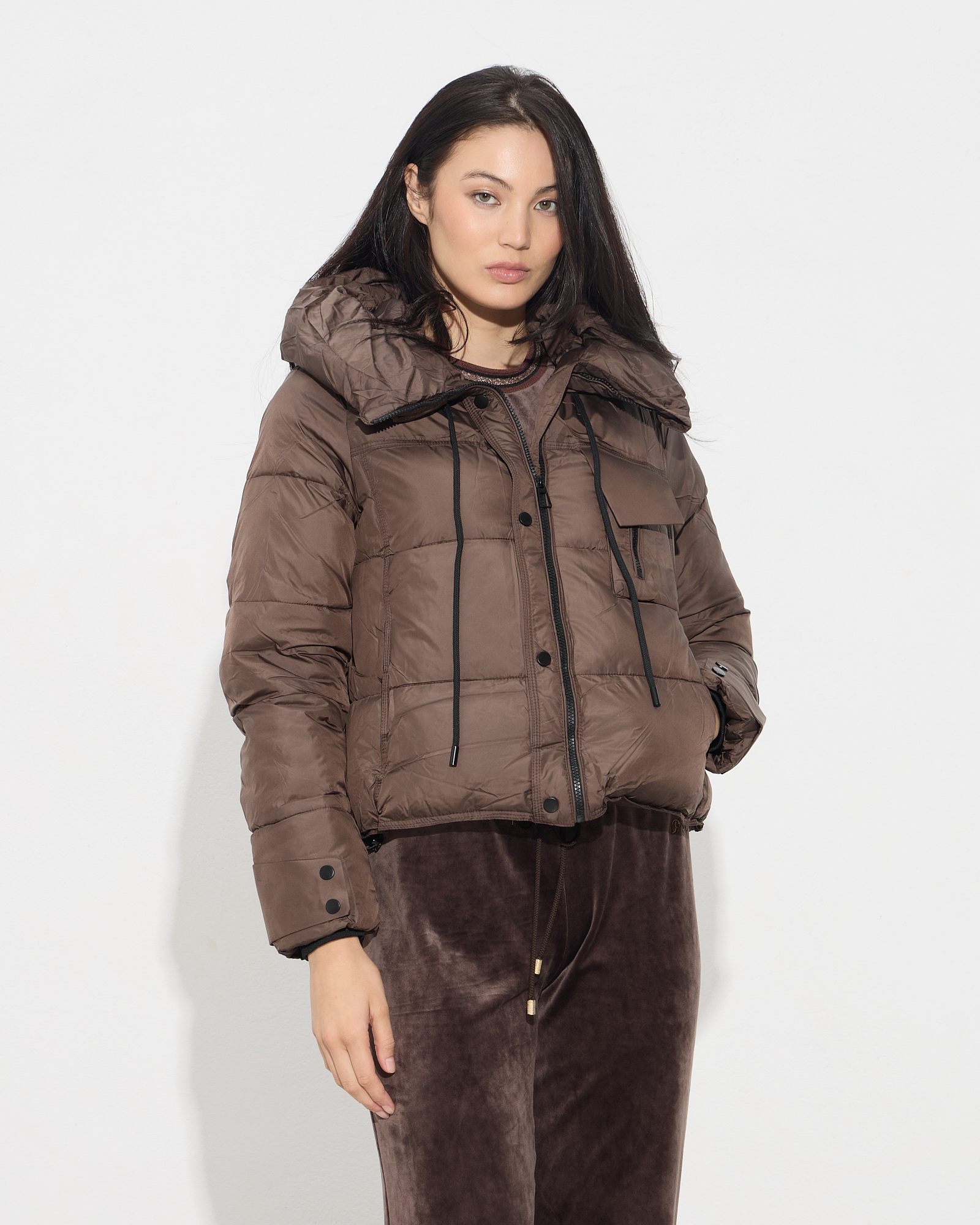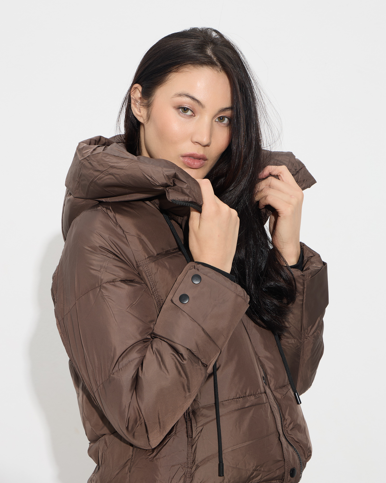 Κοντό puffer μπουφάν με κουκούλα και κορδόνια, μπροστινό κλείσιμο με φερμουάρ και κουμπιά, πλαϊνές τσέπες, λεπτομέρεια κουμπιών στα μανίκια, σε κανονική γραμμή