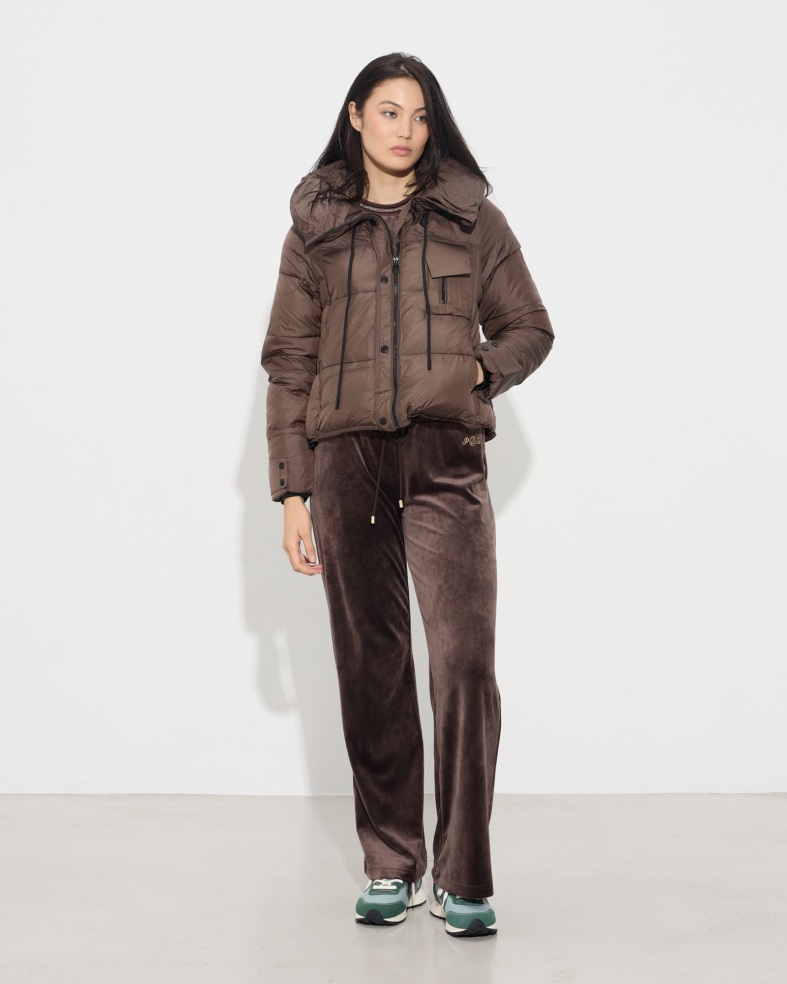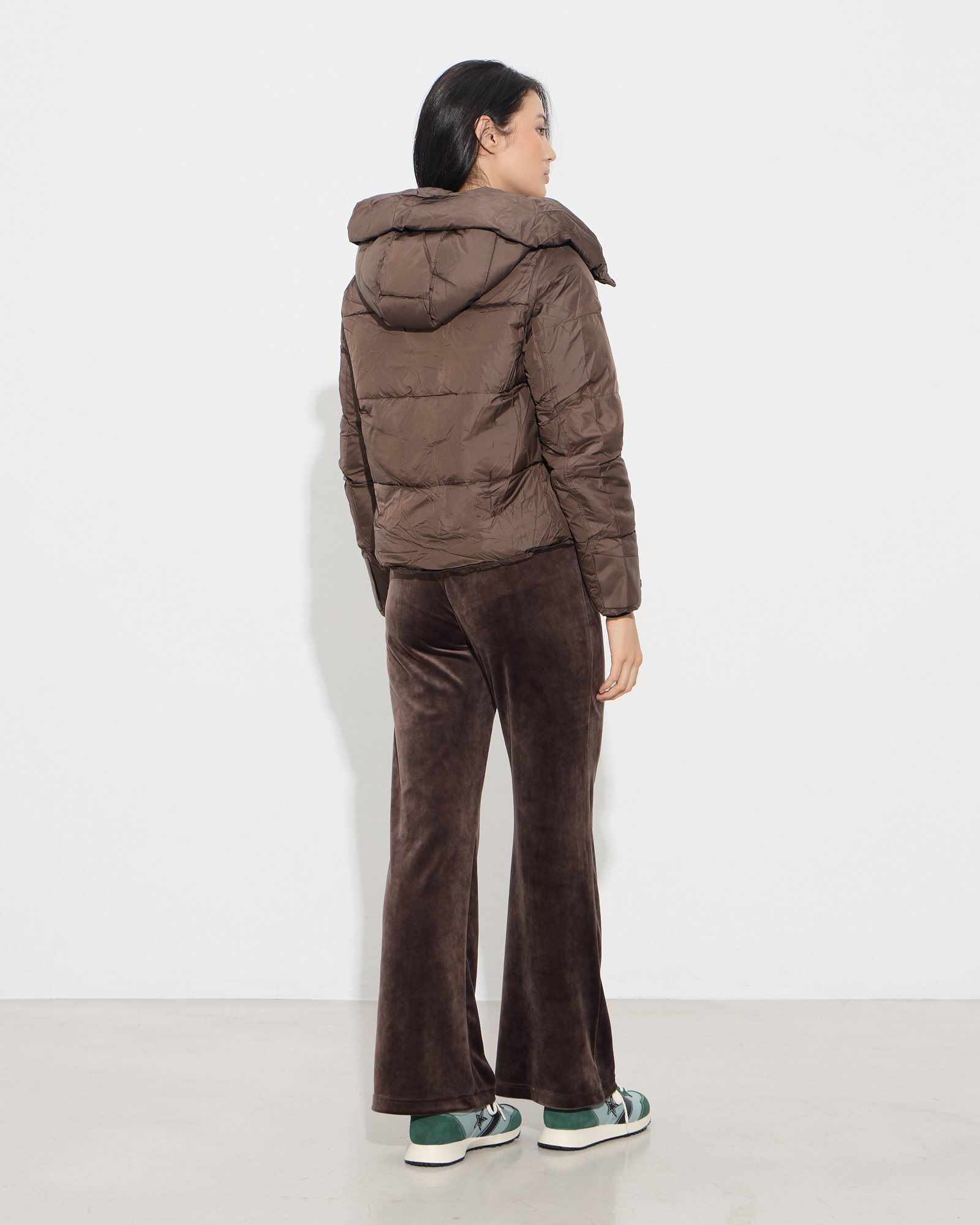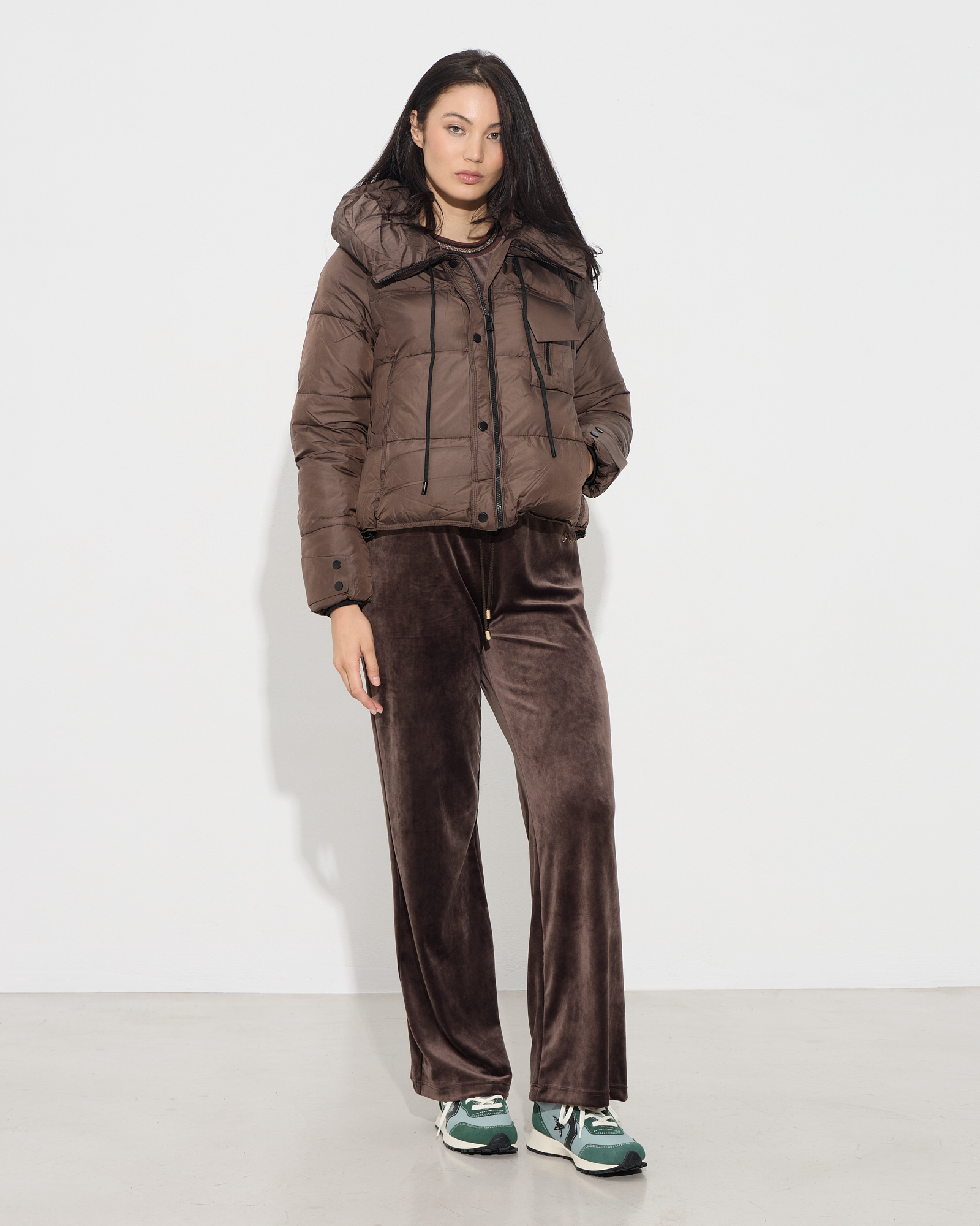 Κοντό puffer μπουφάν με κουκούλα και κορδόνια, μπροστινό κλείσιμο με φερμουάρ και κουμπιά, πλαϊνές τσέπες, λεπτομέρεια κουμπιών στα μανίκια, σε κανονική γραμμή