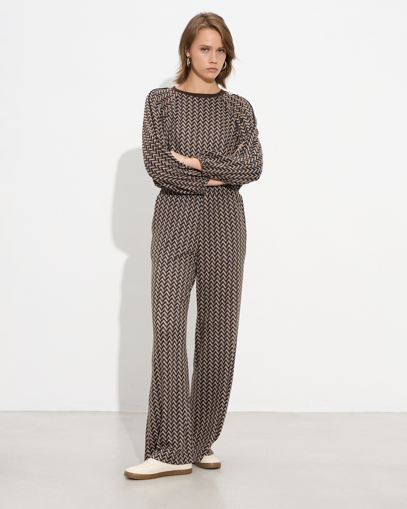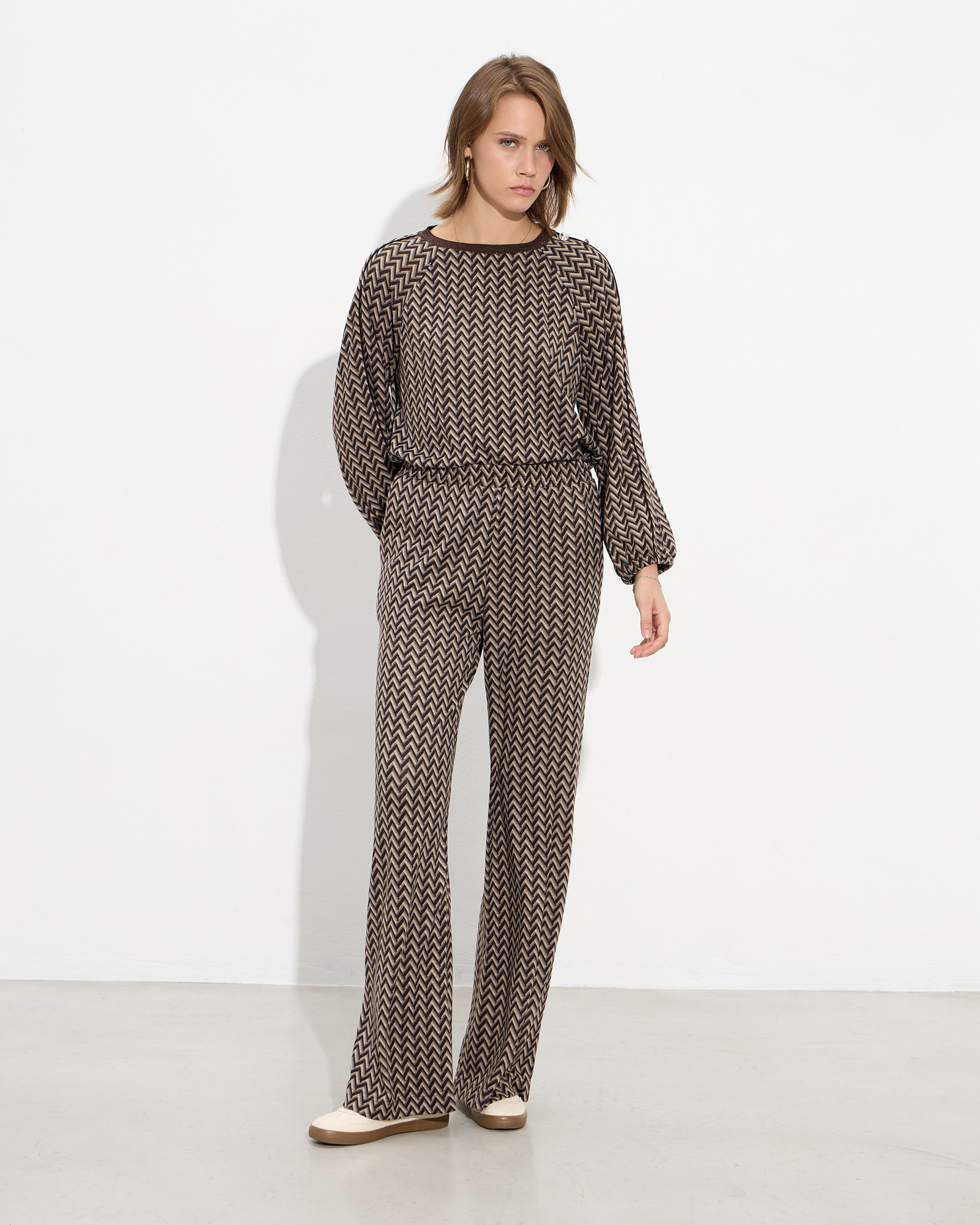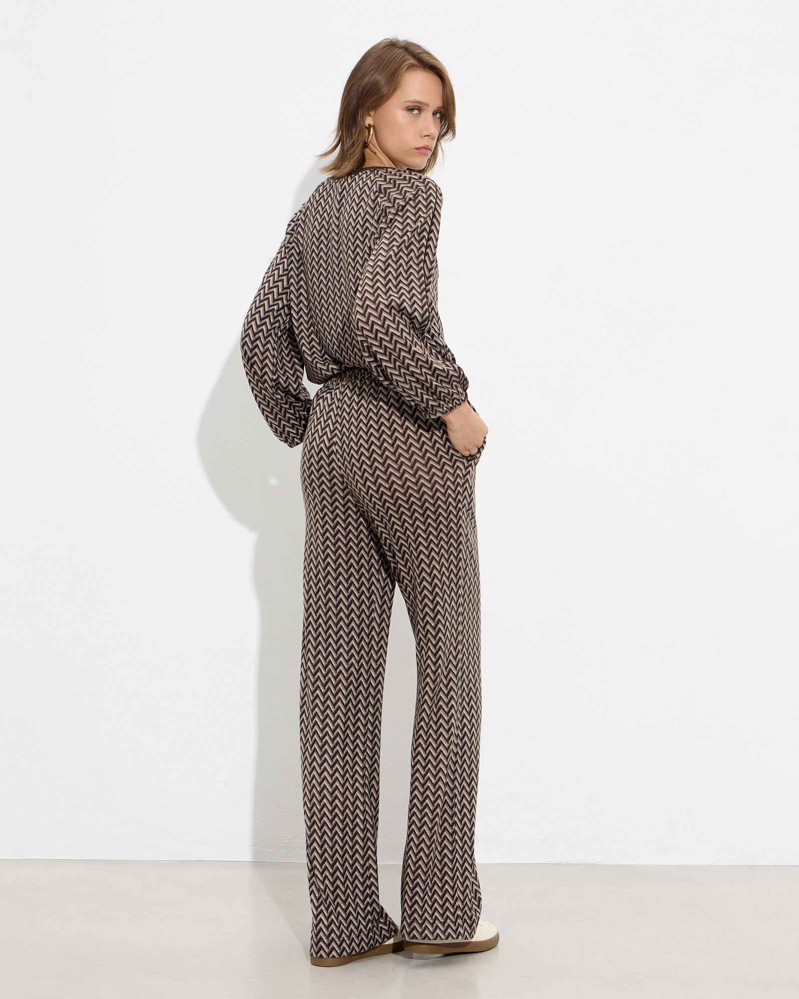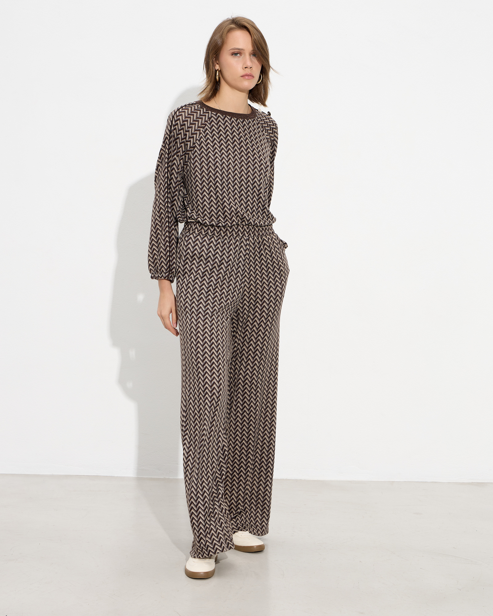 Παντελόνα εμπριμέ με λάστιχο στη μέση, με πλαϊνές τσέπες σε πλεκτό ελαστικό πανί, σε κανονική εφαρμογή