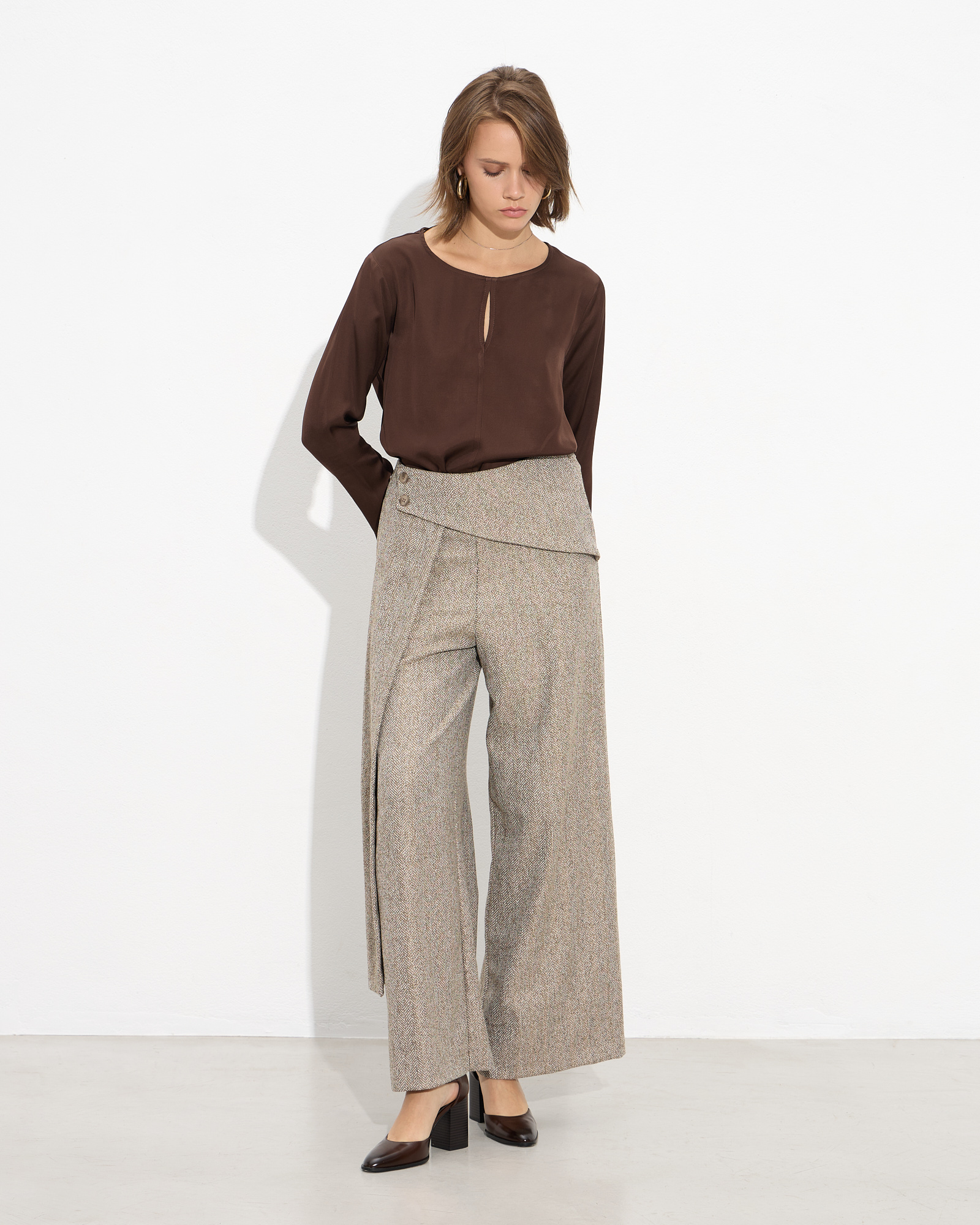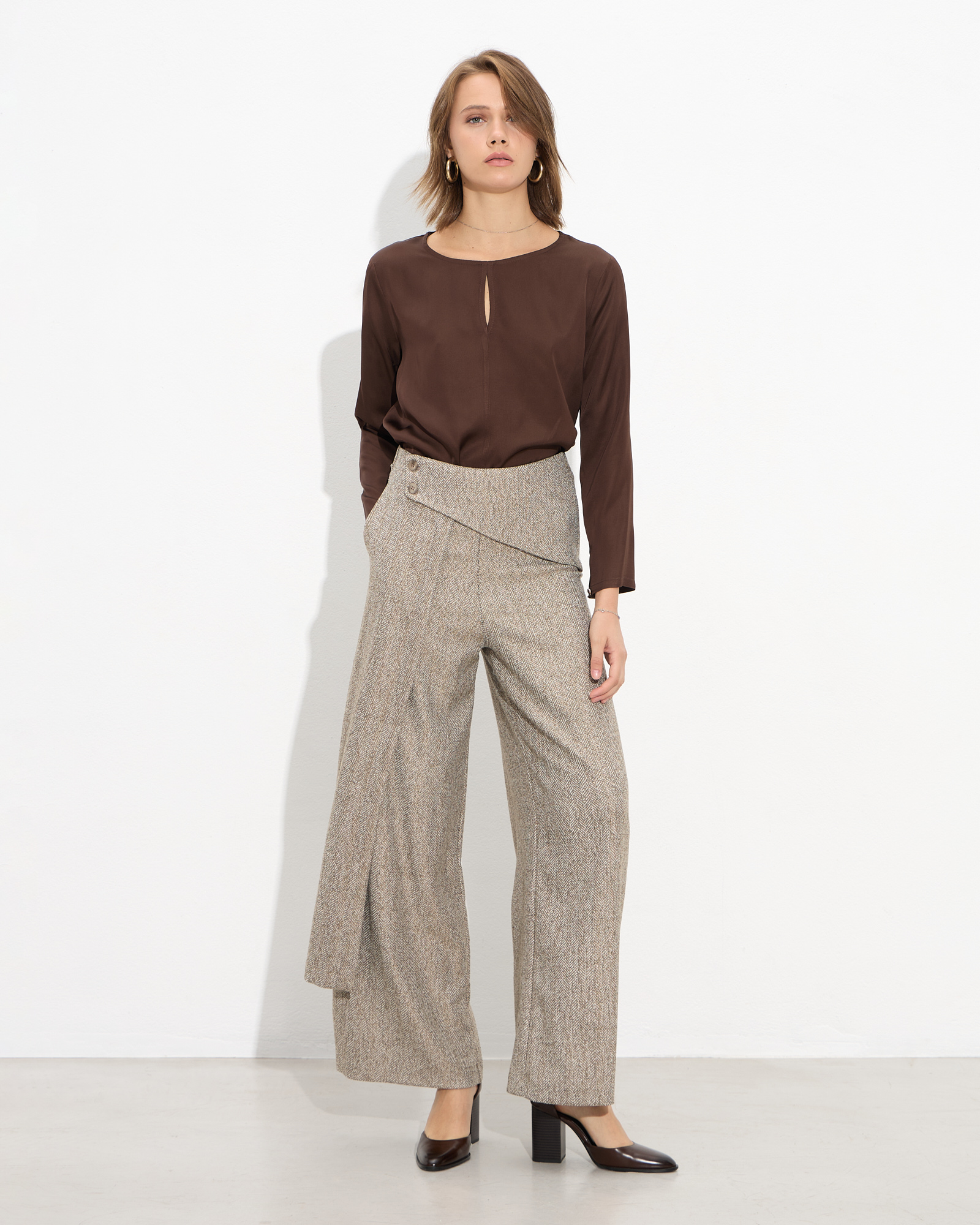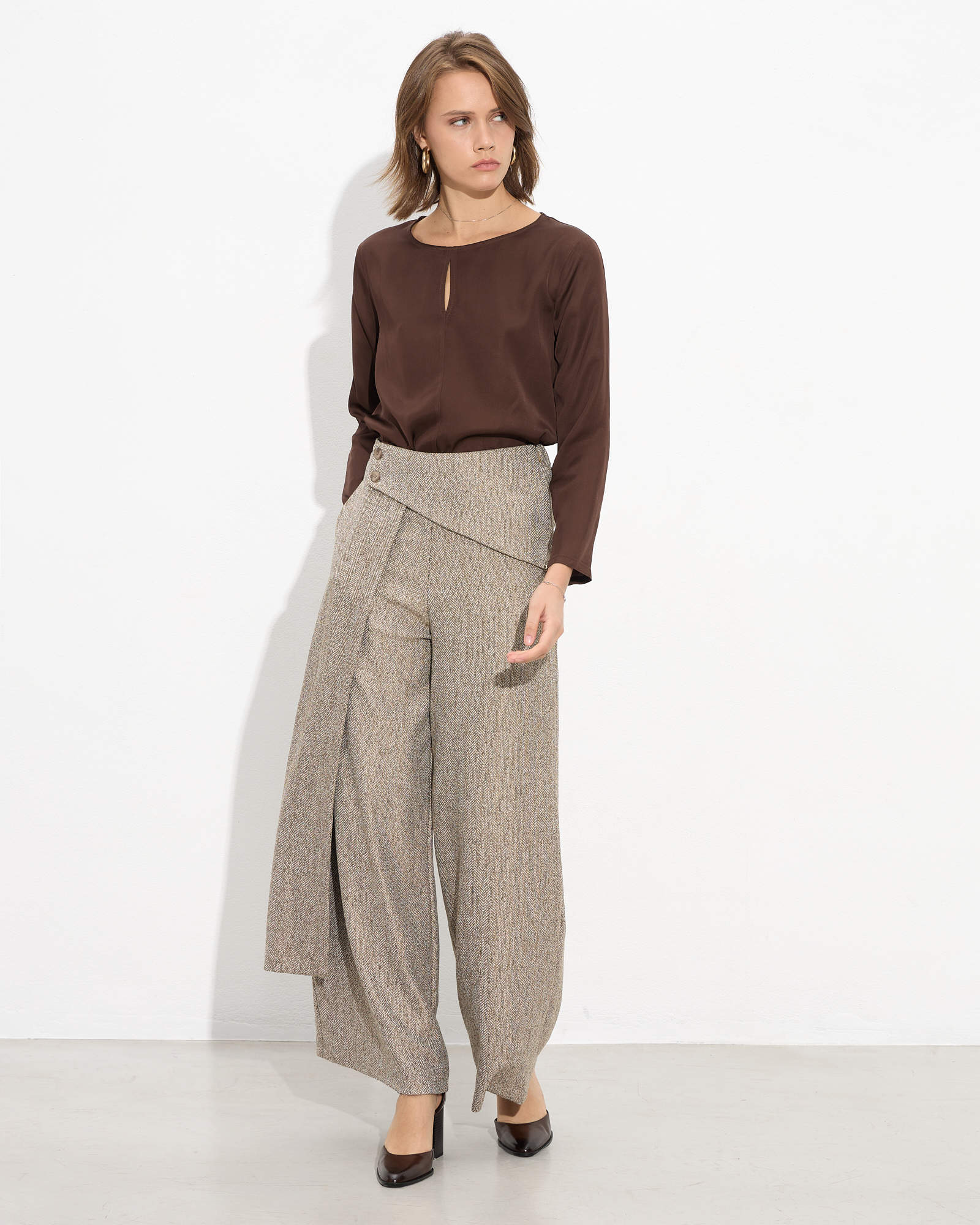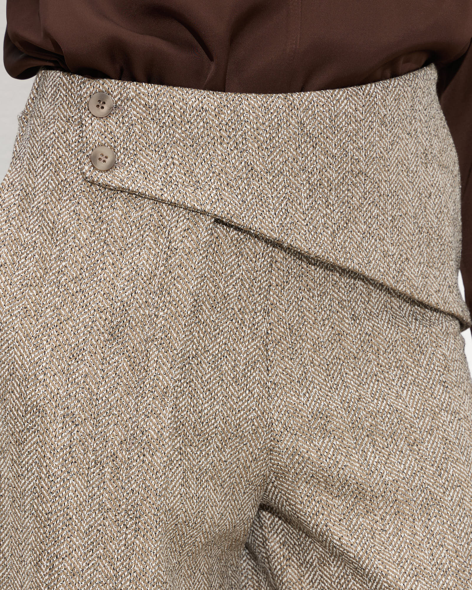 Παντελόνα ψαροκόκκαλο ψηλόμεση, με εξωτερικό πανό με κίνηση και κουμπιά στη μέση, με φερμουάρ στο πλάι και τσέπη στο πλαί, σε κανονική γραμμή