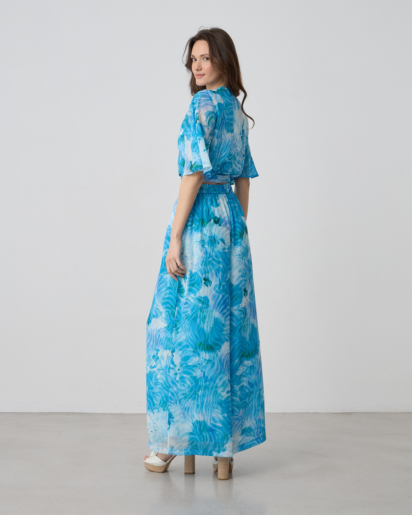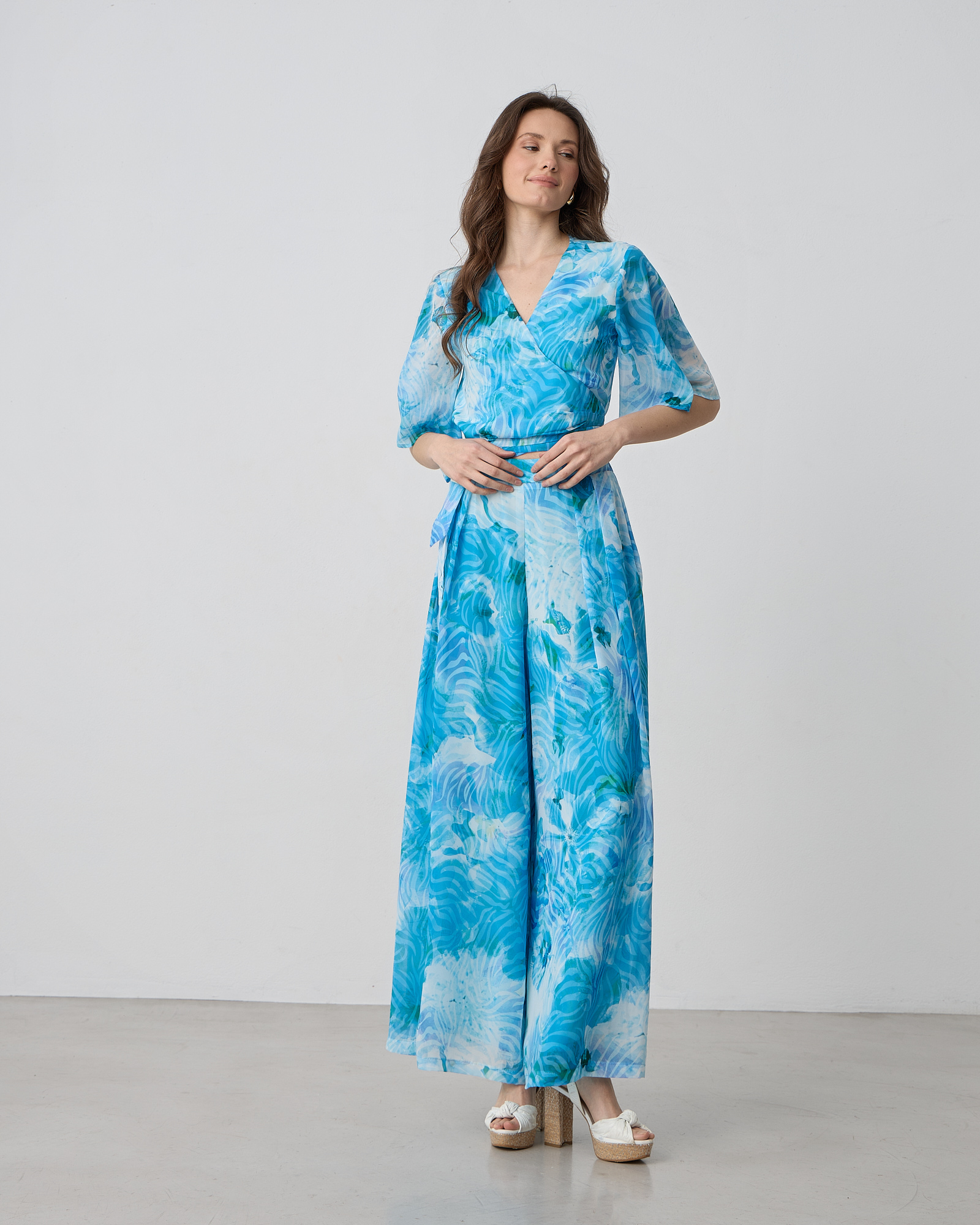 Παντελόνα εμπριμέ με πιέτες, κλείσιμο με φερμουάρ στο πλάι, λάστιχο στο πίσω μέρος, σε αέρινο ύφασμα μουσελίνα σε άνετη εφαρμογή