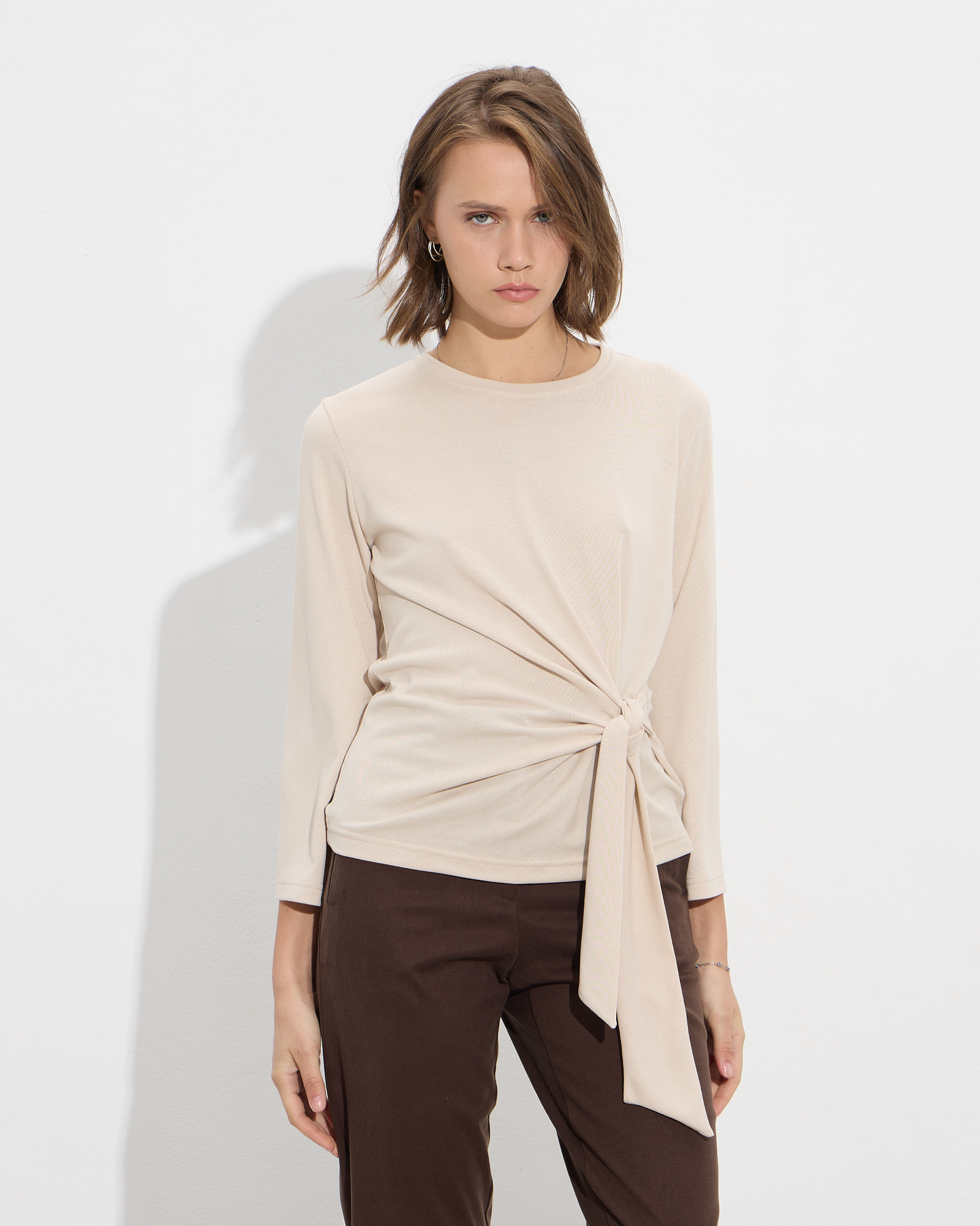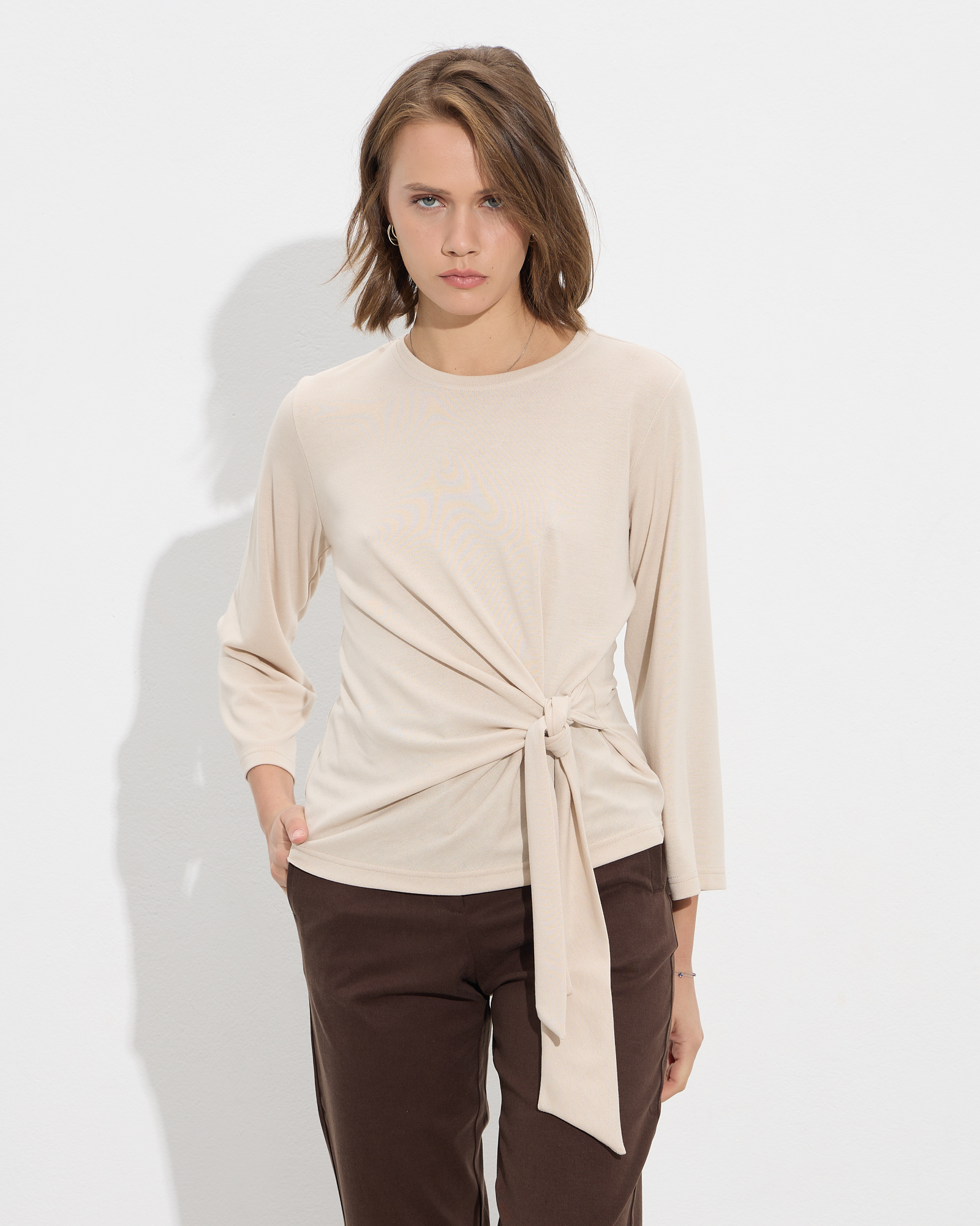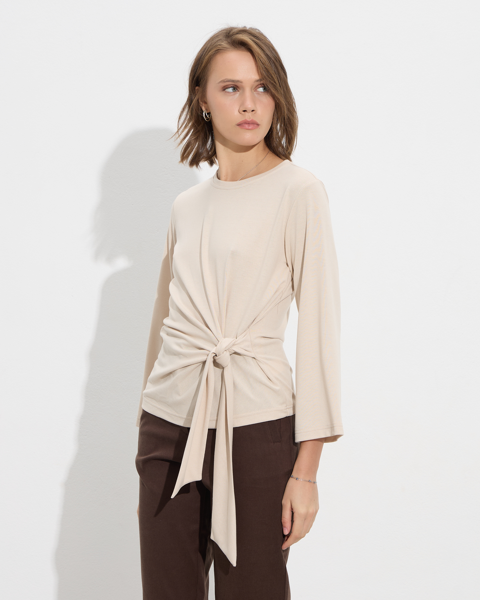 Μπλούζα μακρυμάνικη με στρογγυλή λαιμόκοψη, δέσιμο στη μέση σε μαλακό και ελαστικό ύφασμα