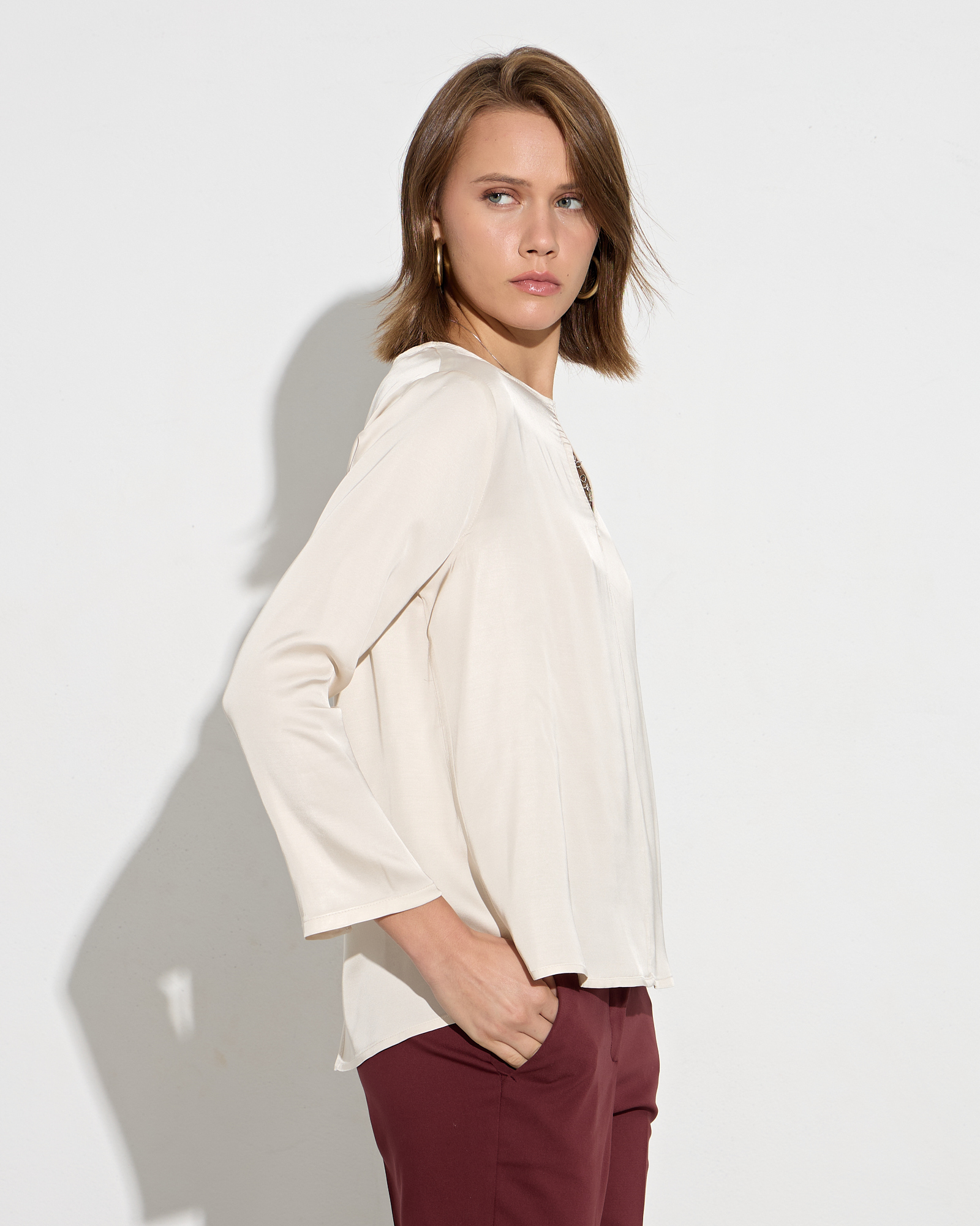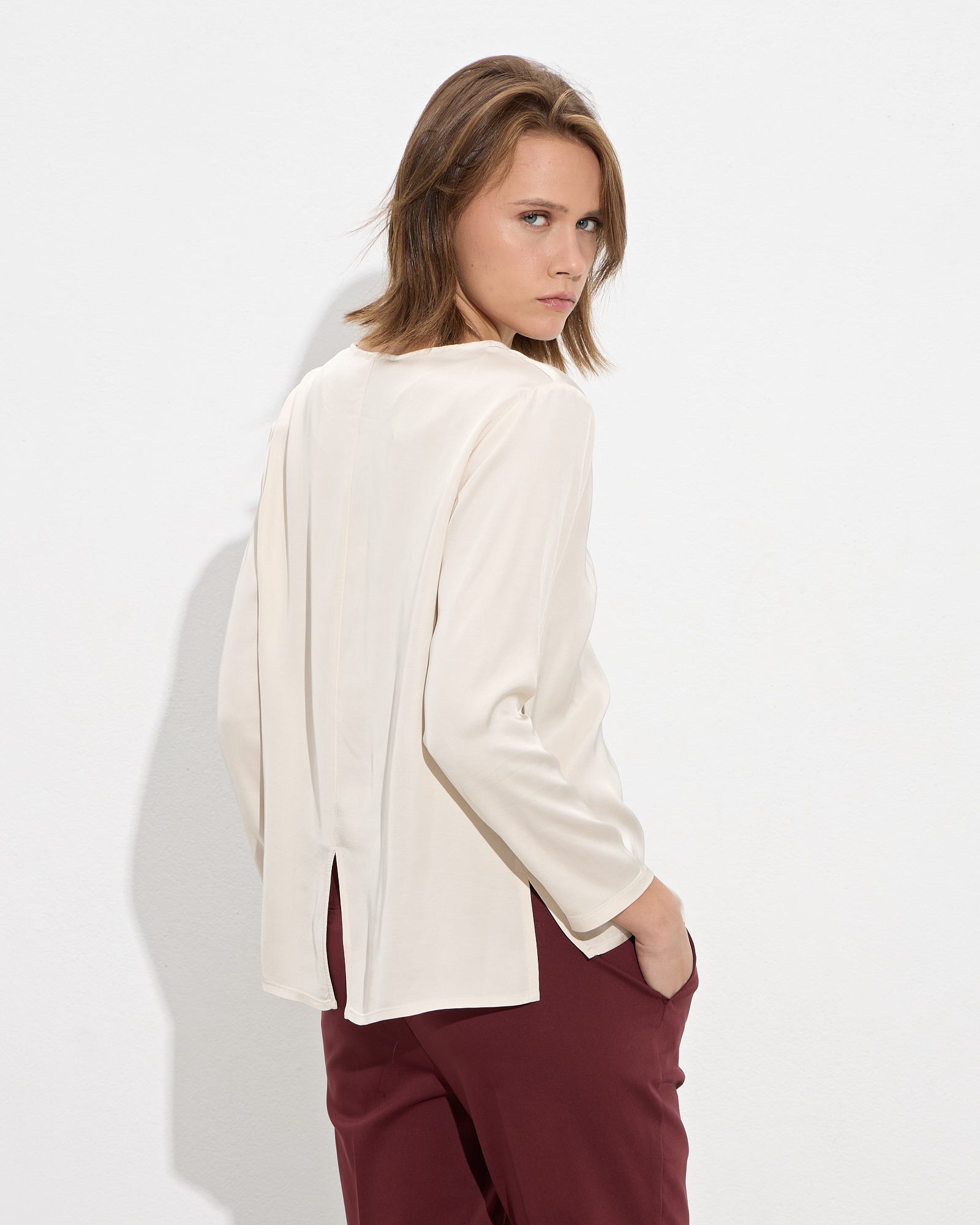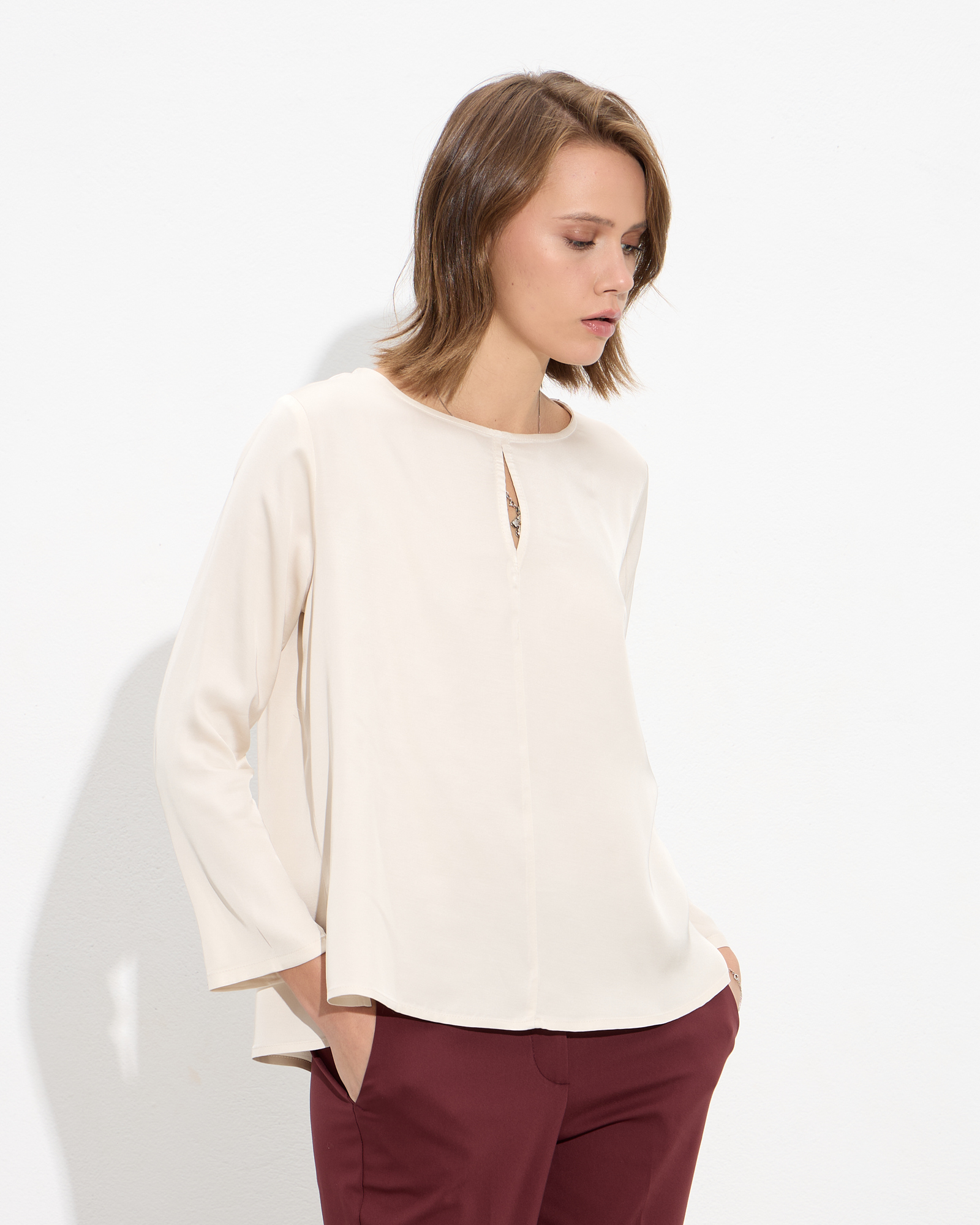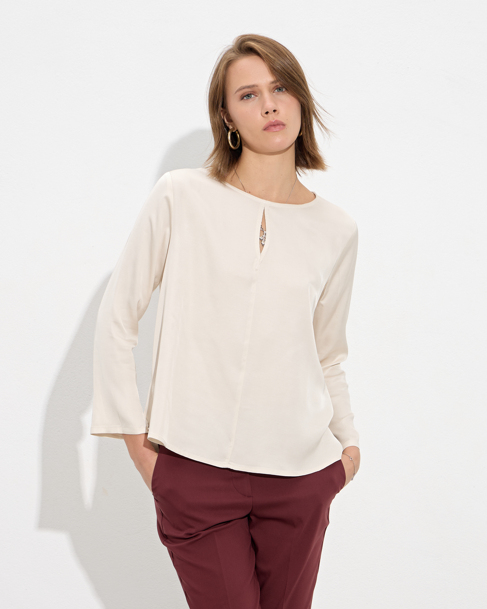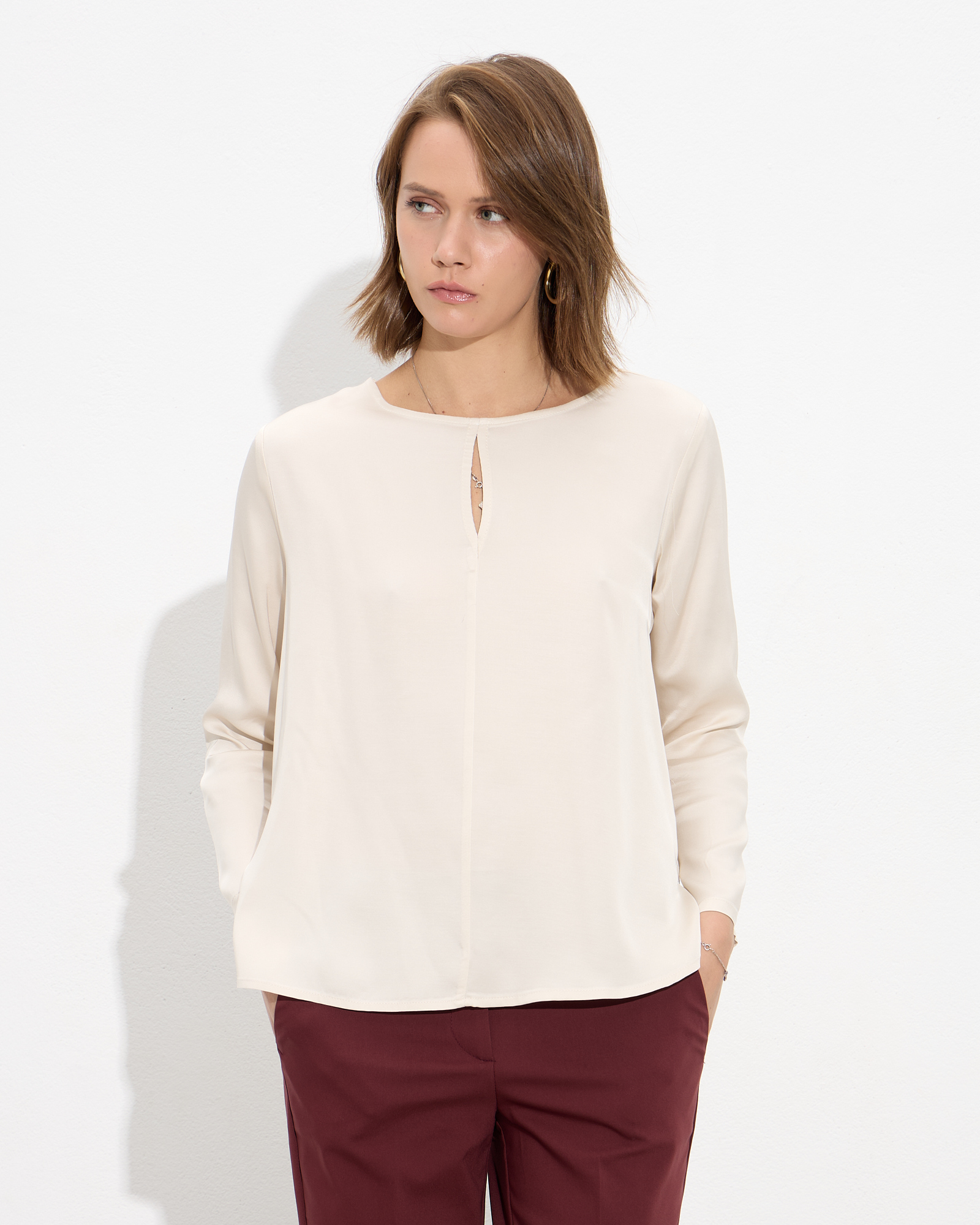 Μπλούζα μακρυμάνικη με στρογγυλή λαιμόκοψη, με άνοιγμα στο λαιμό σε σατέν-βισκόζ ύφασμα, σε άνετη γραμμή