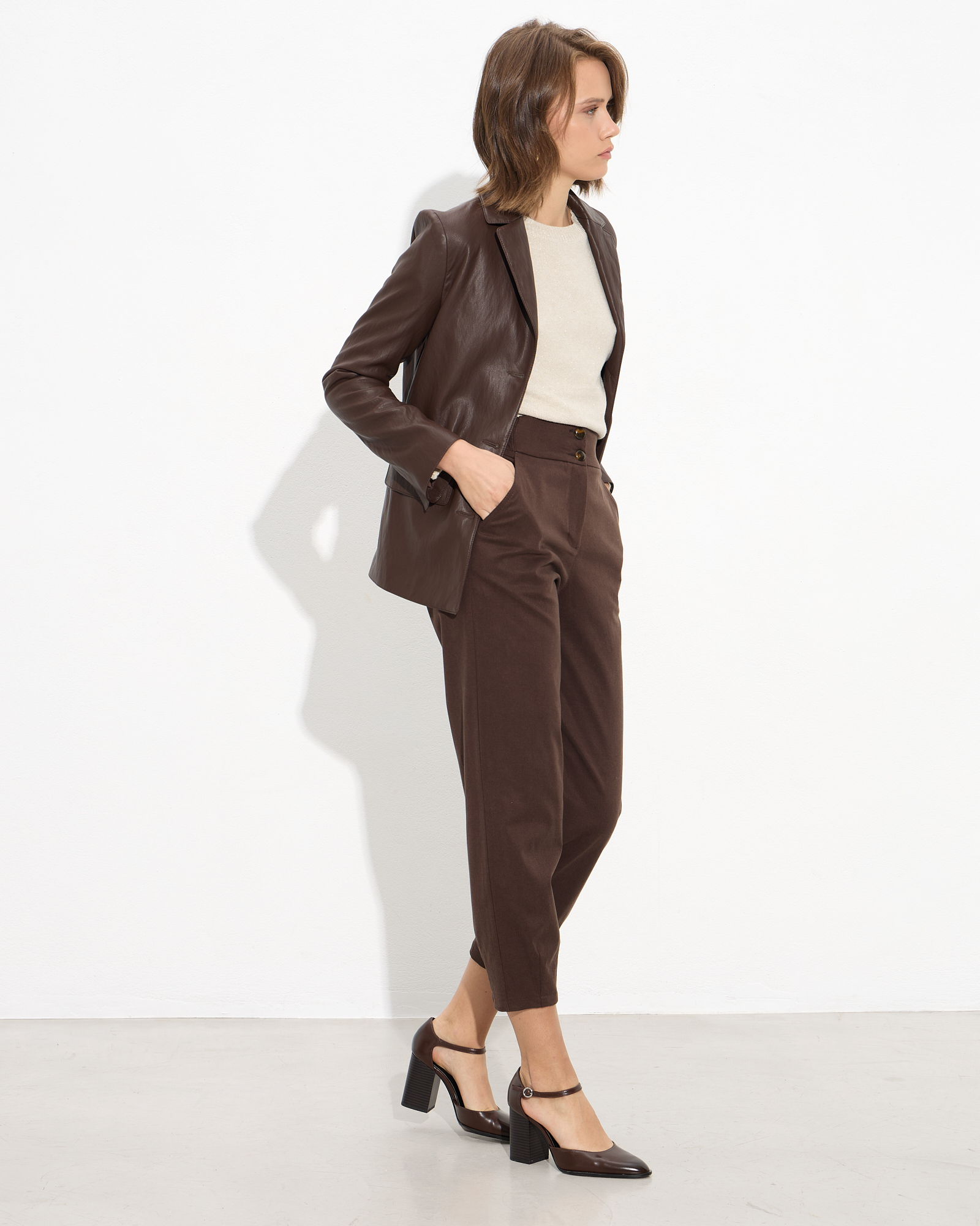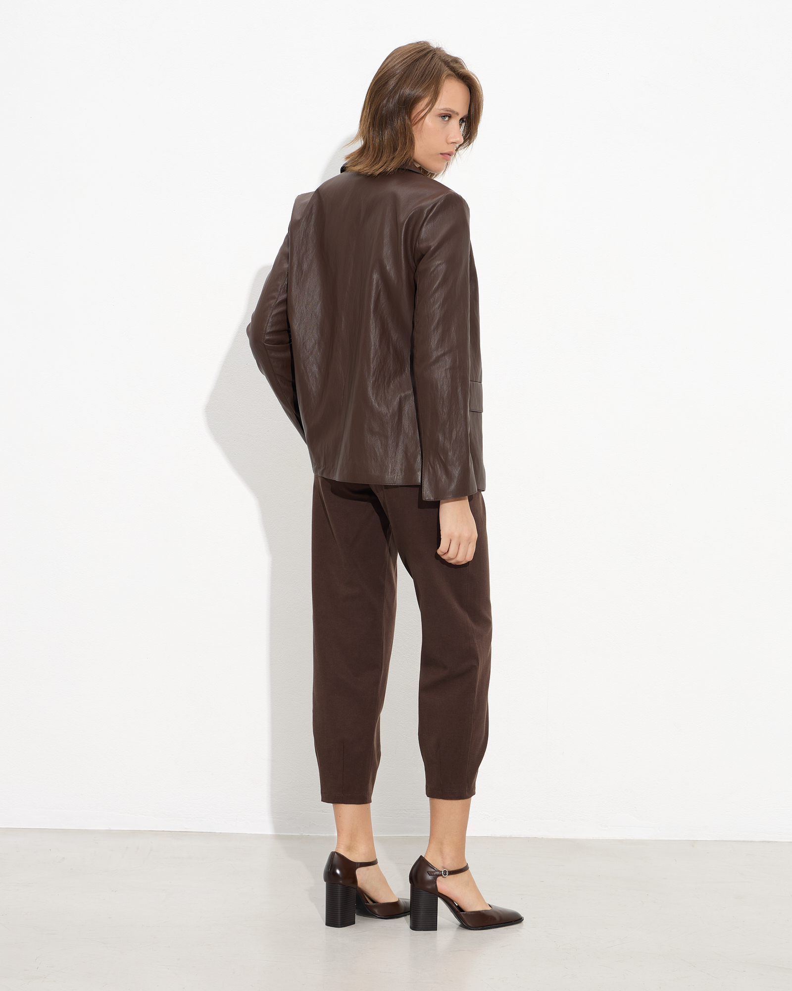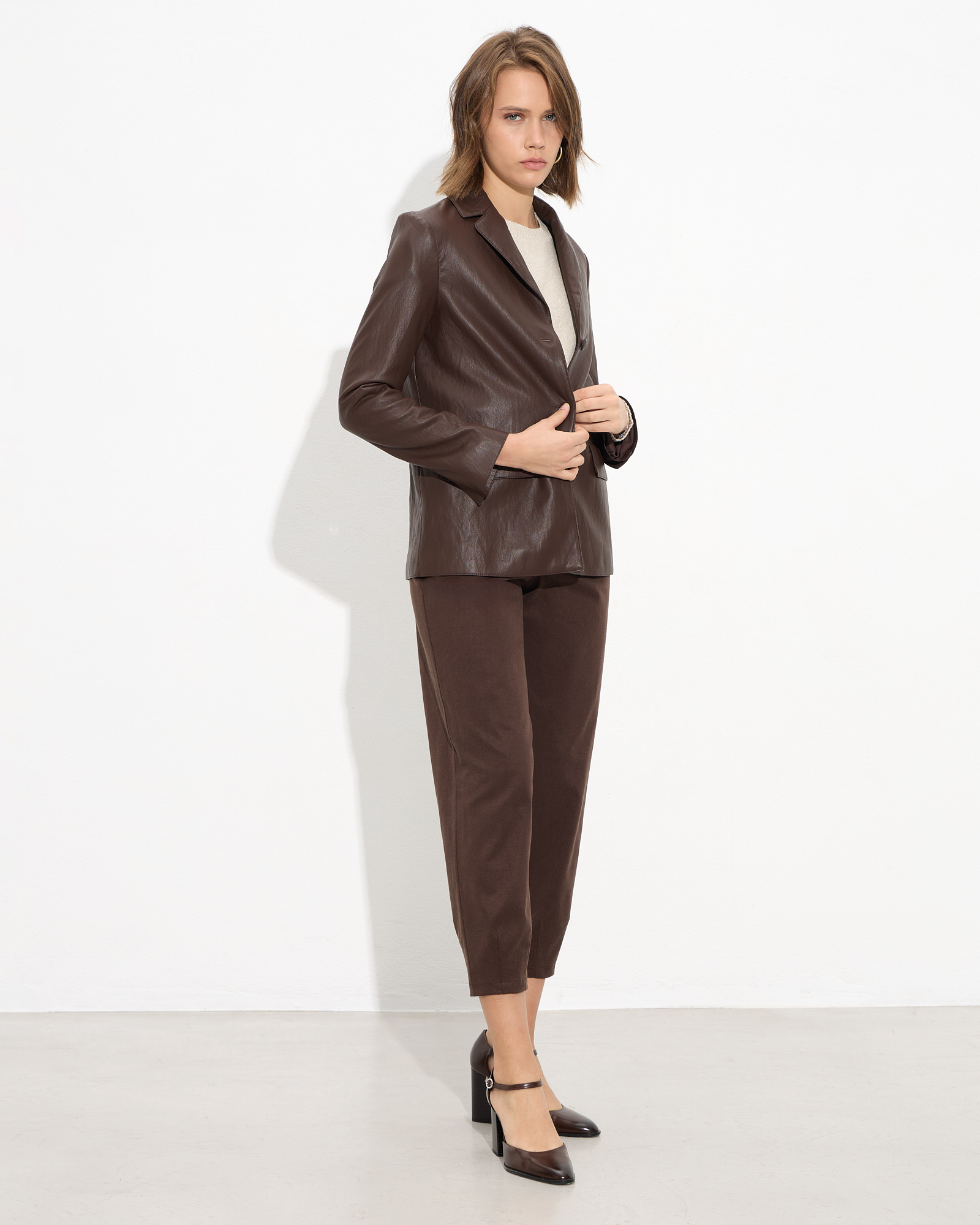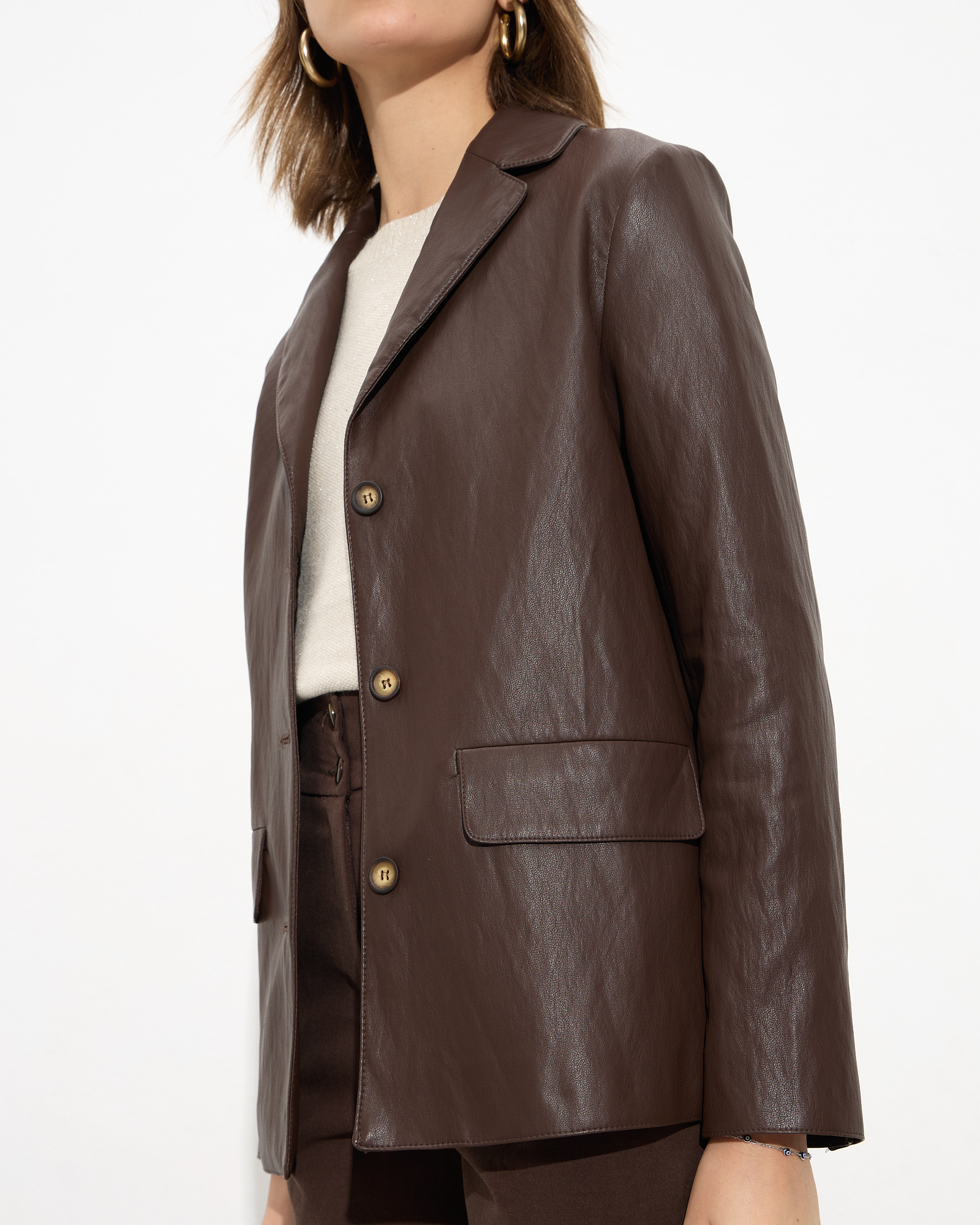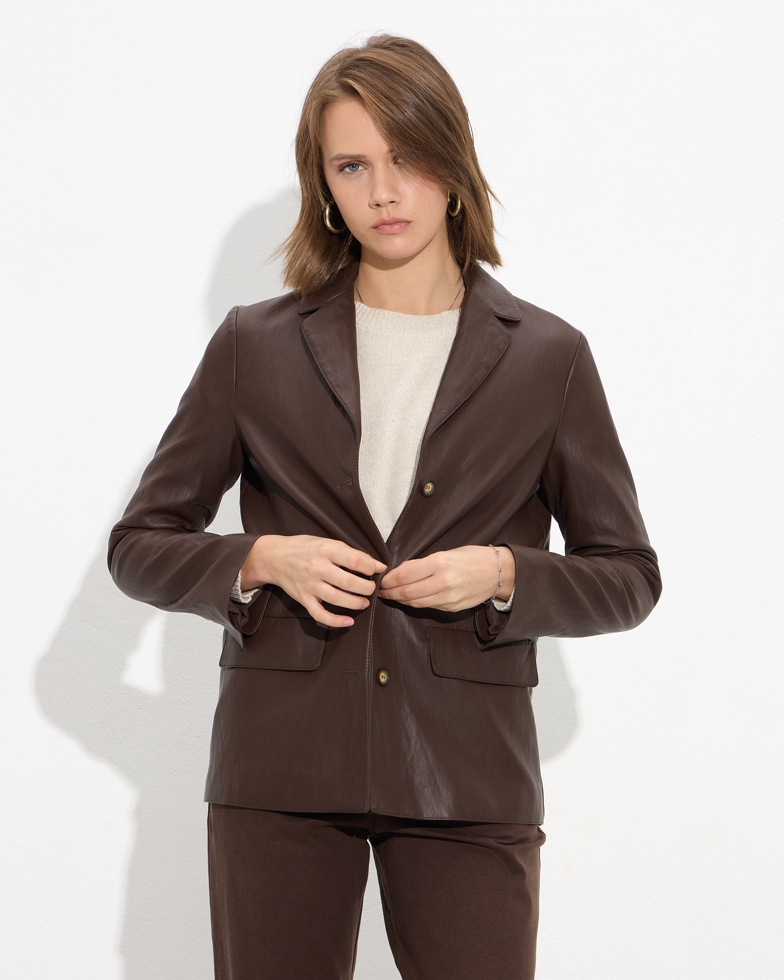 Σακάκι blazer δερματίνη, γιακάς με πέτο, κλείσιμο με κουμπιά μπροστά, πλαϊνές τσέπες με καπάκι, μαλακή υφή, σε κανονική εφαρμογή
