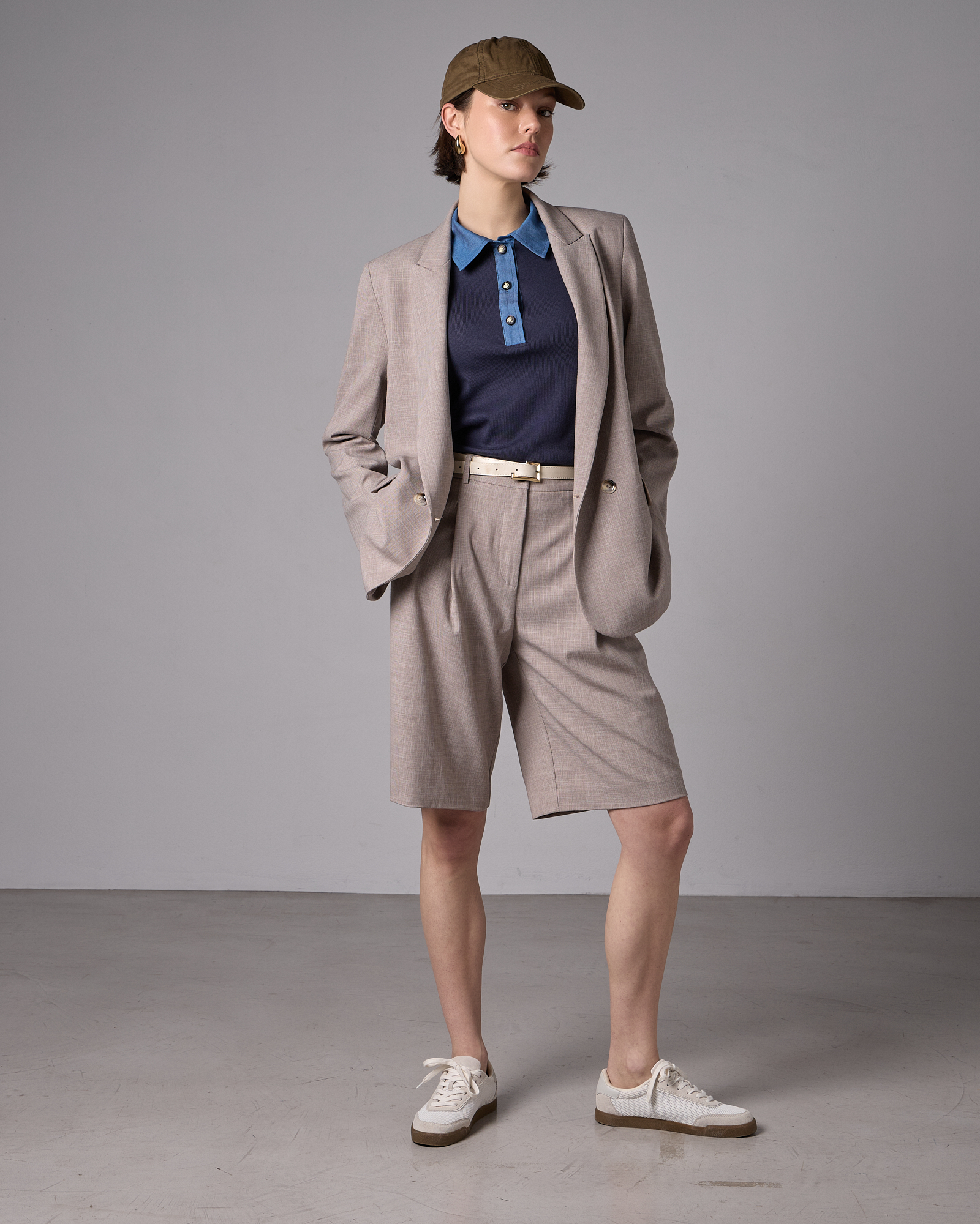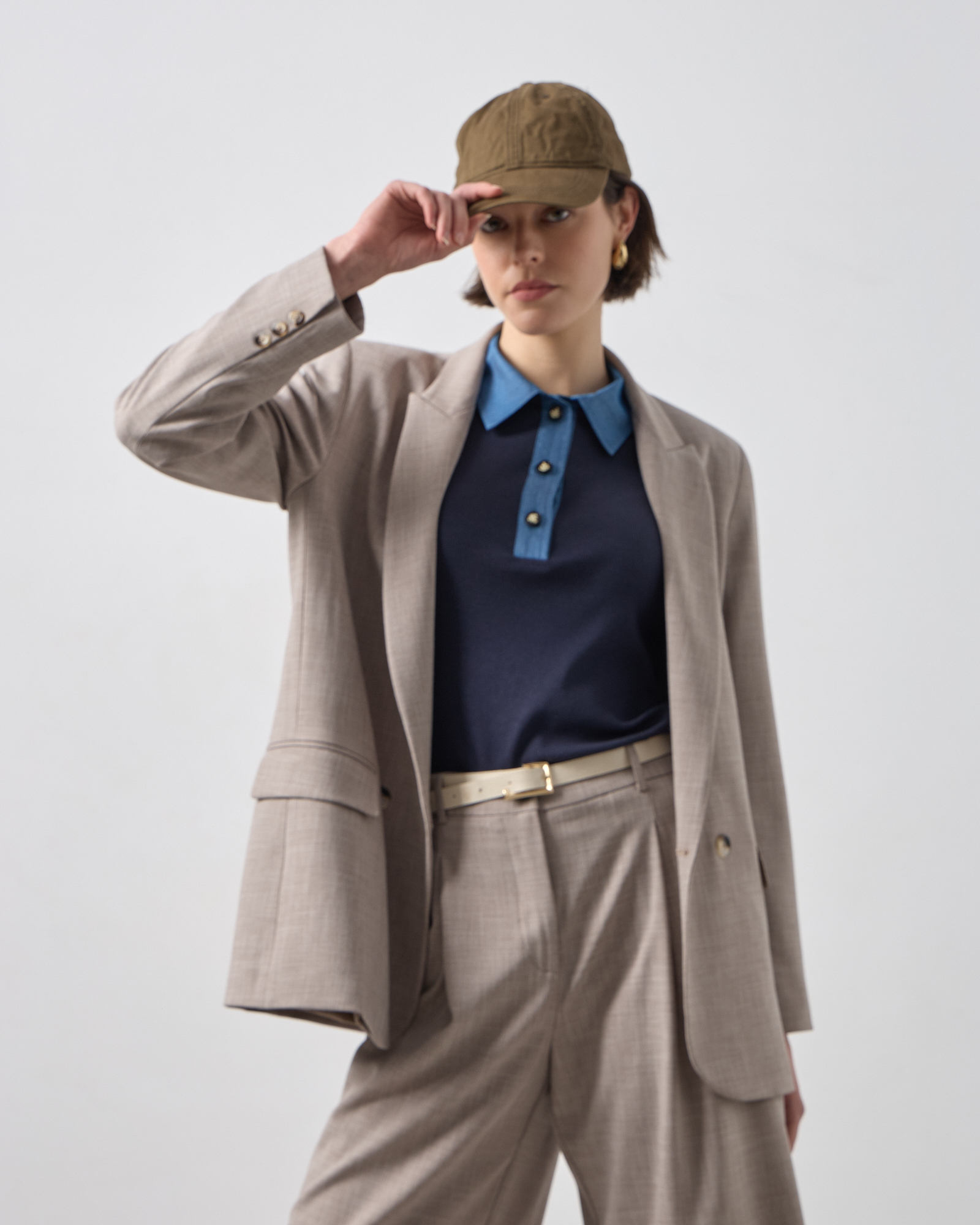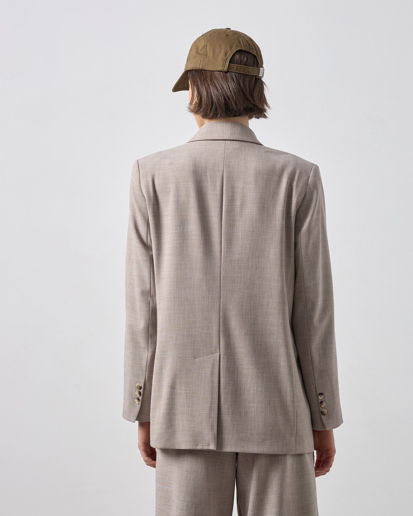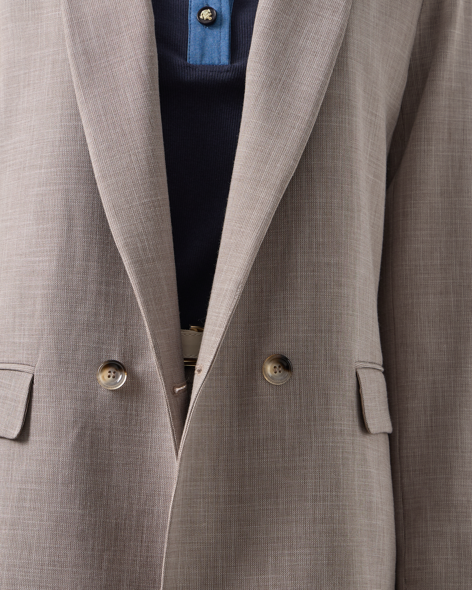 Σακάκι σταυρωτό , μακρυμάνικο με βάτες, γιακά με πέτο, κλείσιμο με κουμπιά, με τσέπες μπροστά, εσωτερική φόδρα, σε άνετη γραμμή