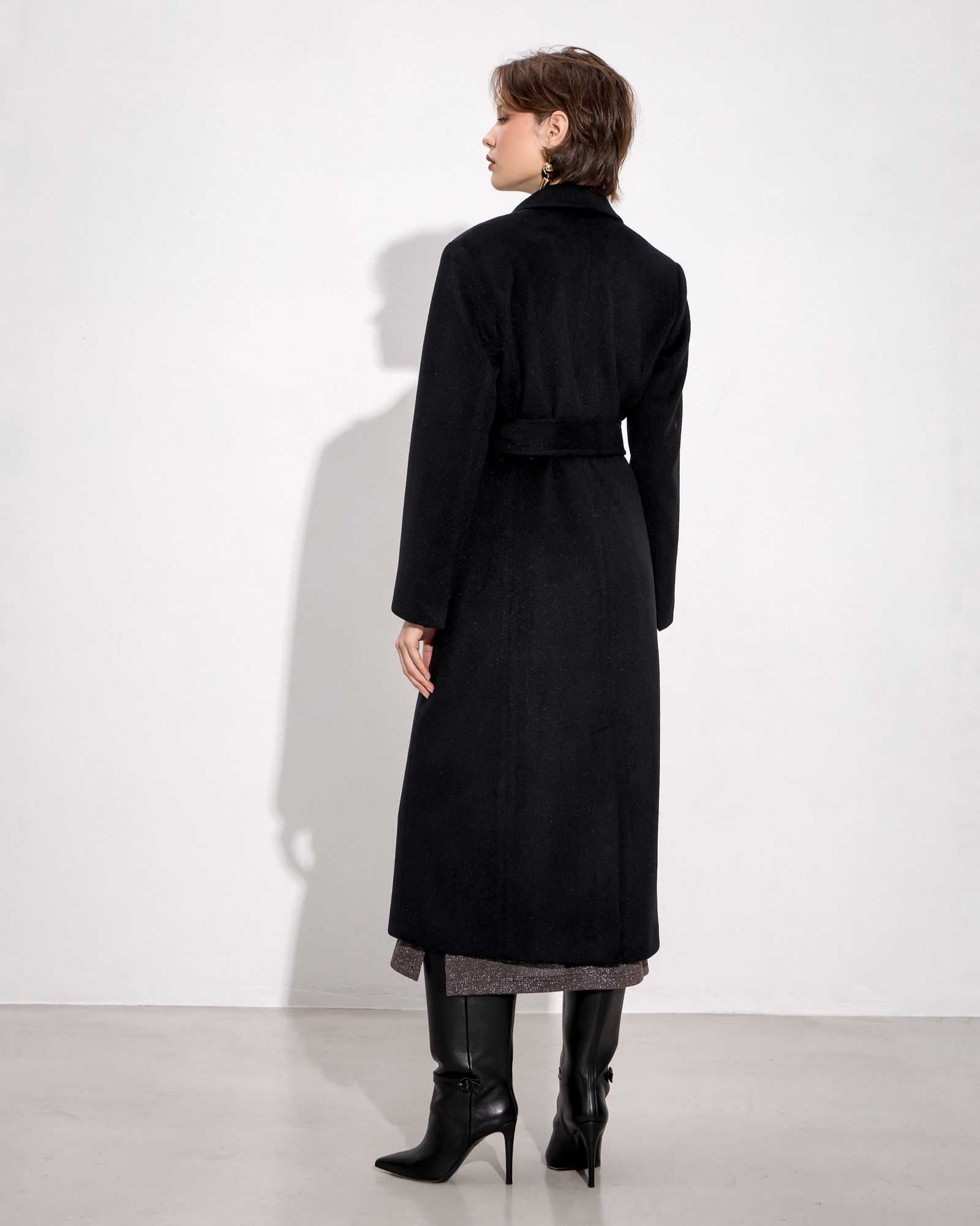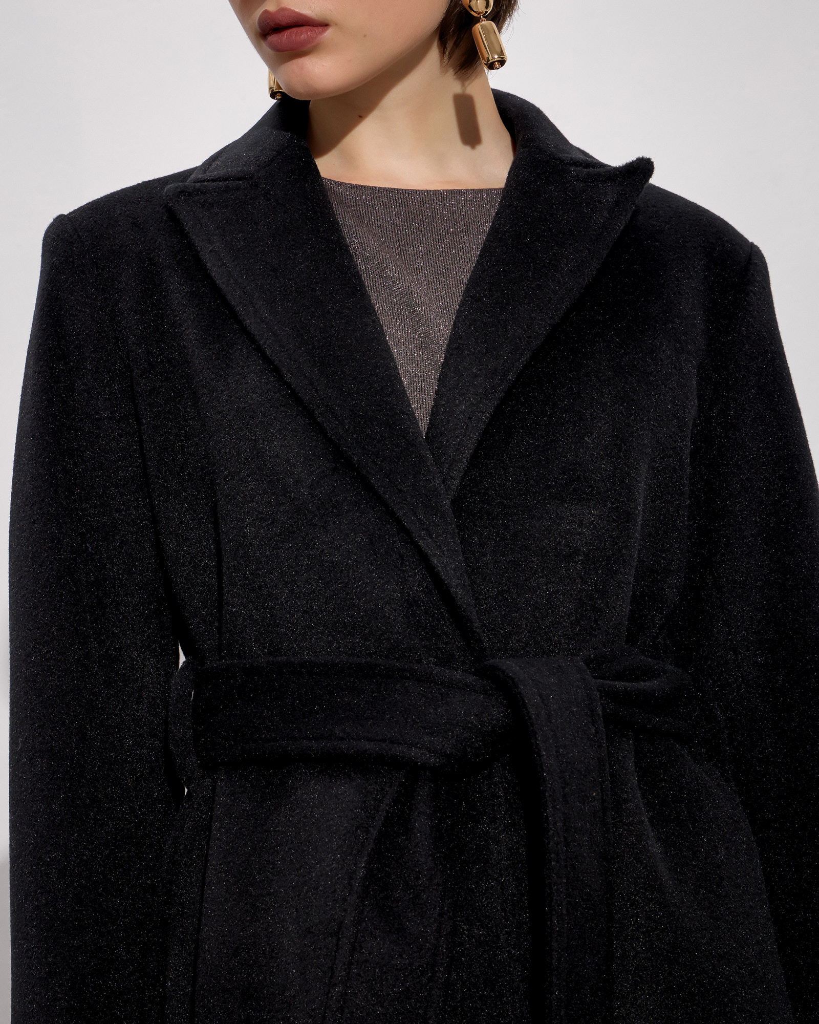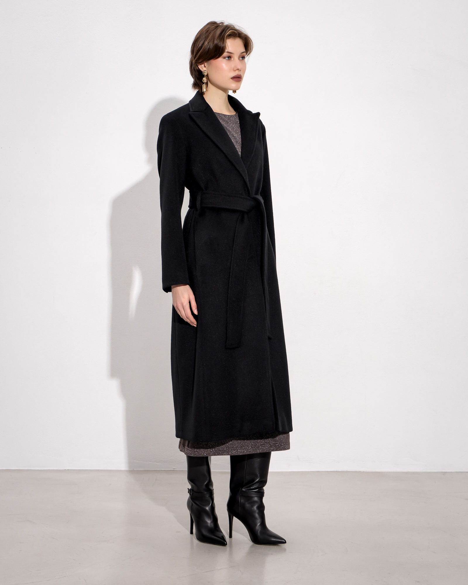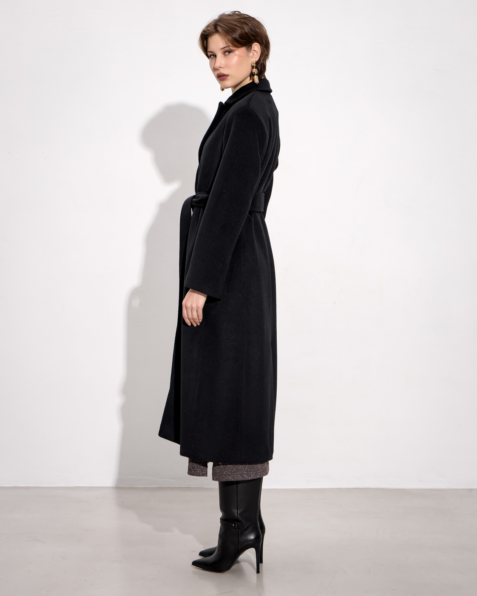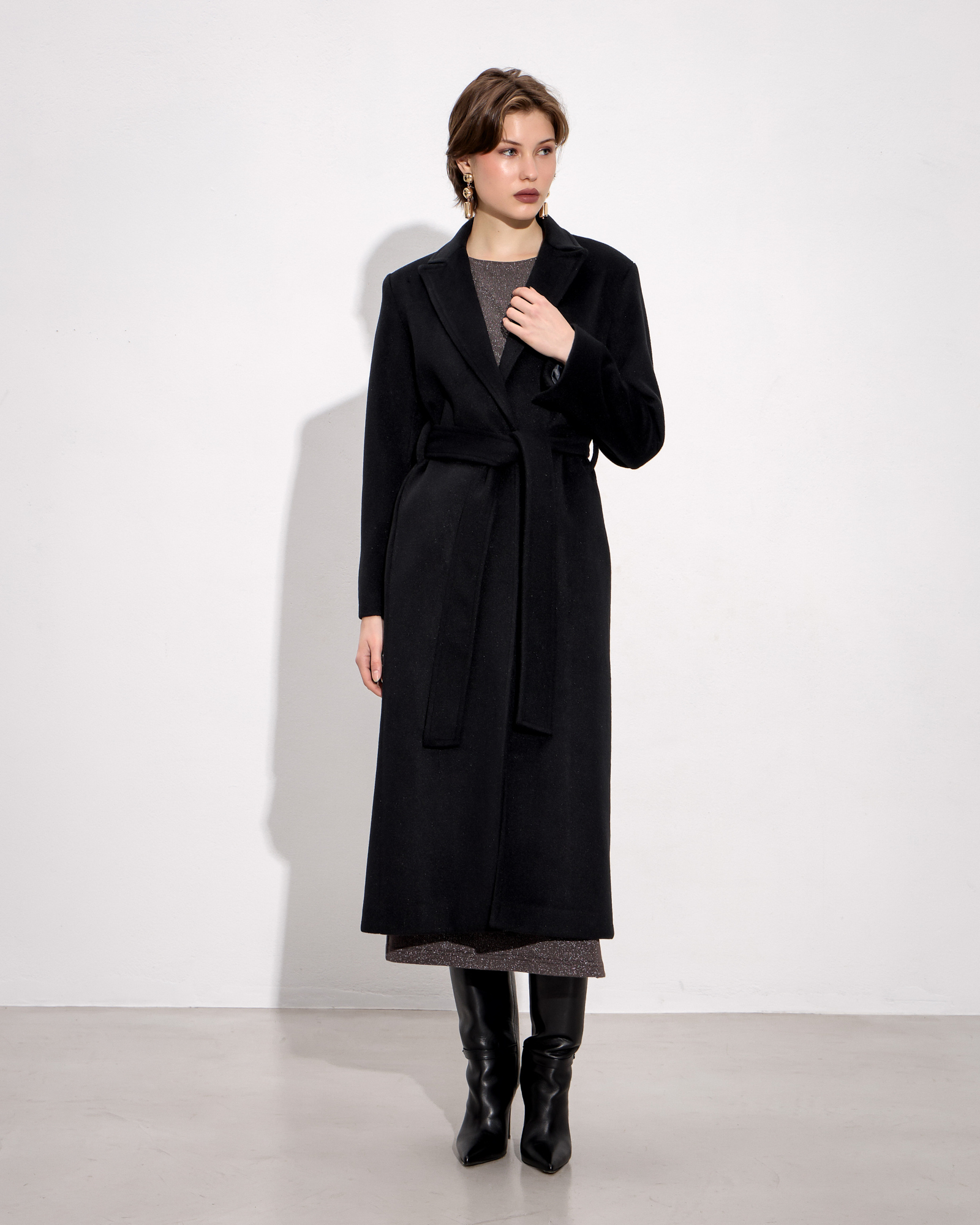 Παλτό μακρύ, γιακάς με πέτο, μακρύ μανίκι με βάτα, τσέπες στο πλάι, κλείσιμο με κουμπί μπροστά, λεπτομέρεια ζώνης απο το ίδιο ύφασμα, σε κανονική γραμμή