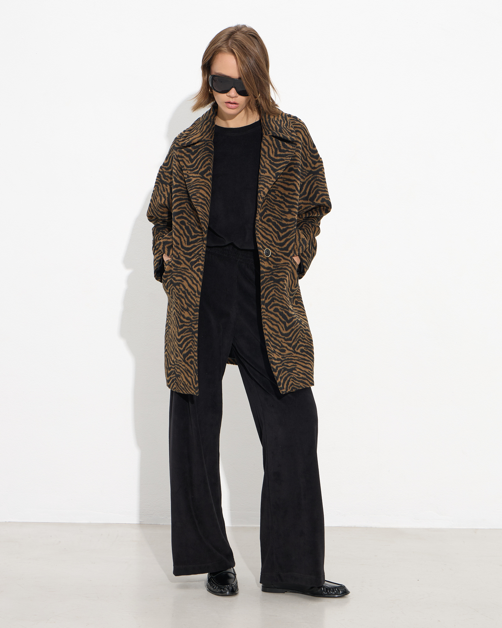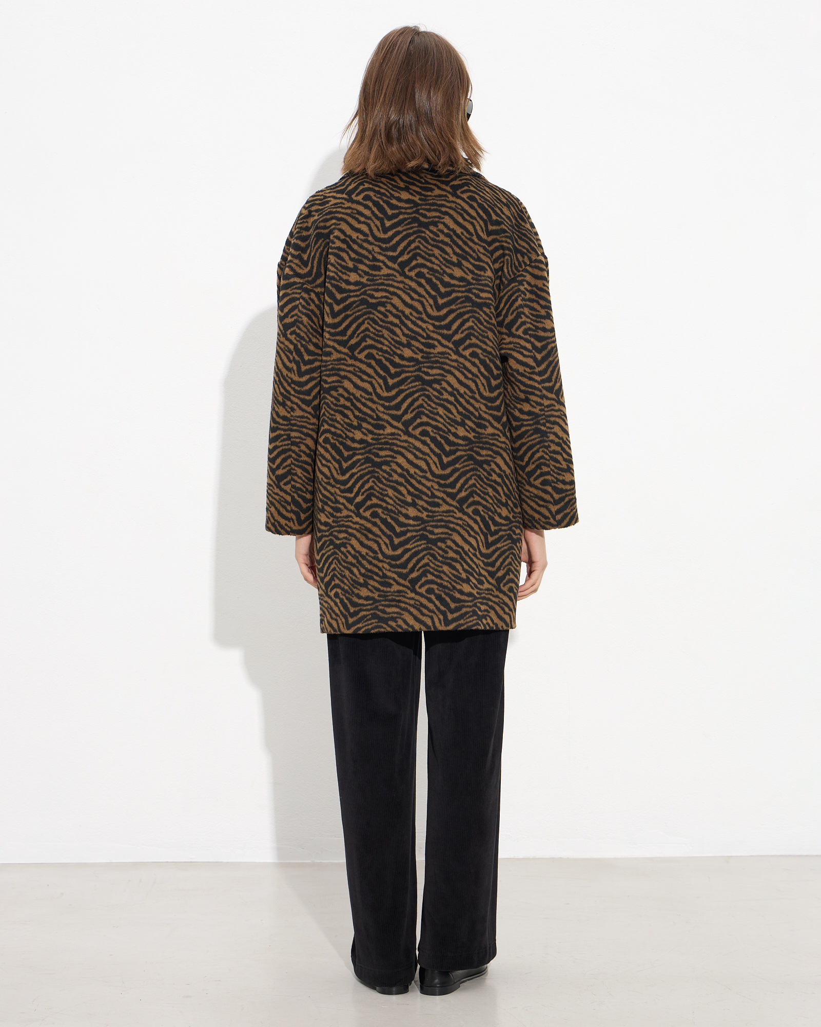 Παλτό animal print, μακρυμάνικο με πέτο και γιακά, κλείσιμο με κουμπί, πλαϊνές τσέπες, σε άνετη εφαρμογή
