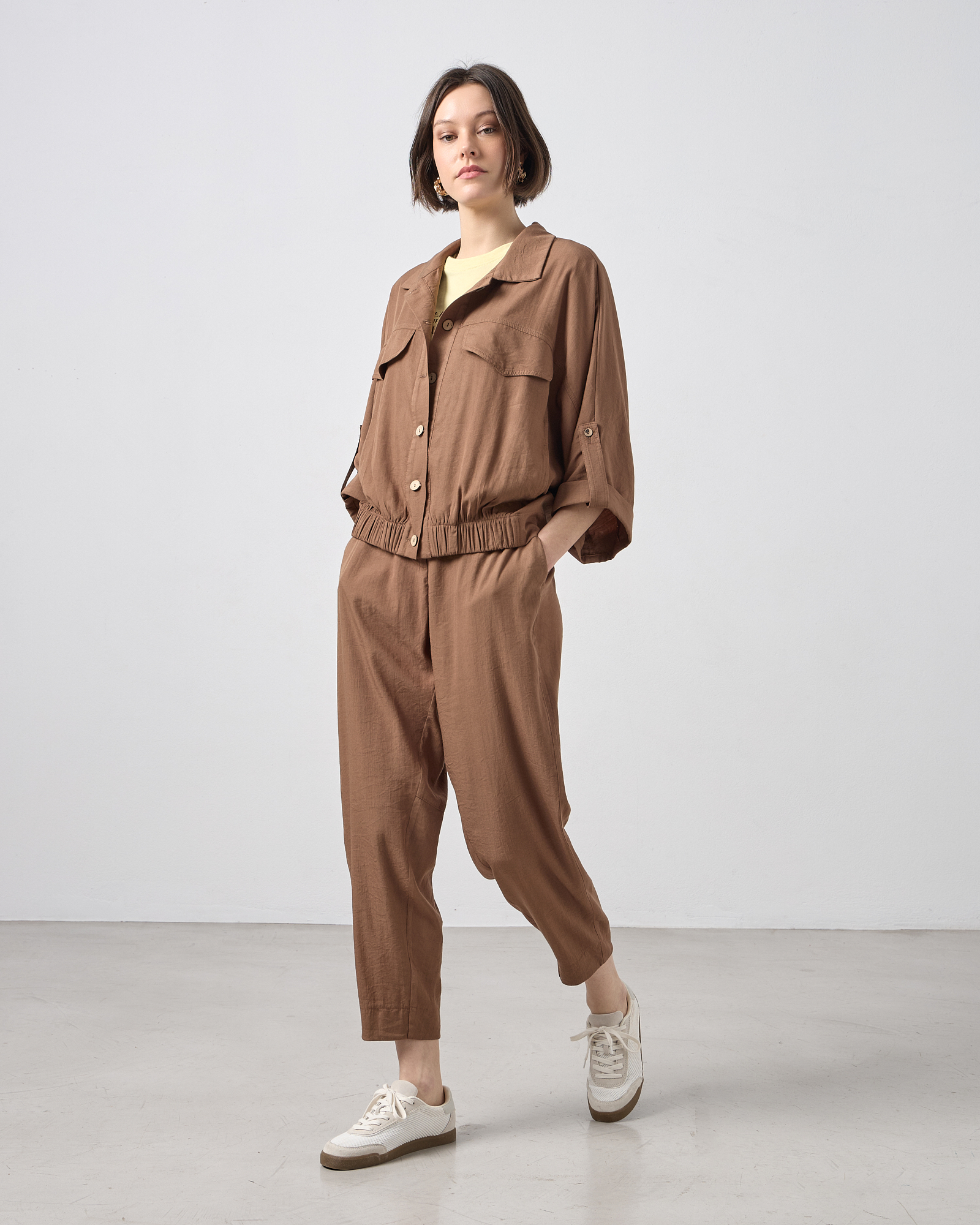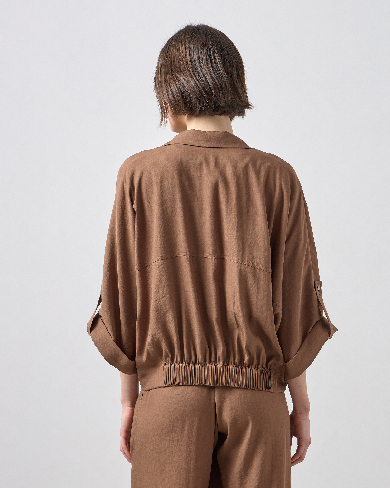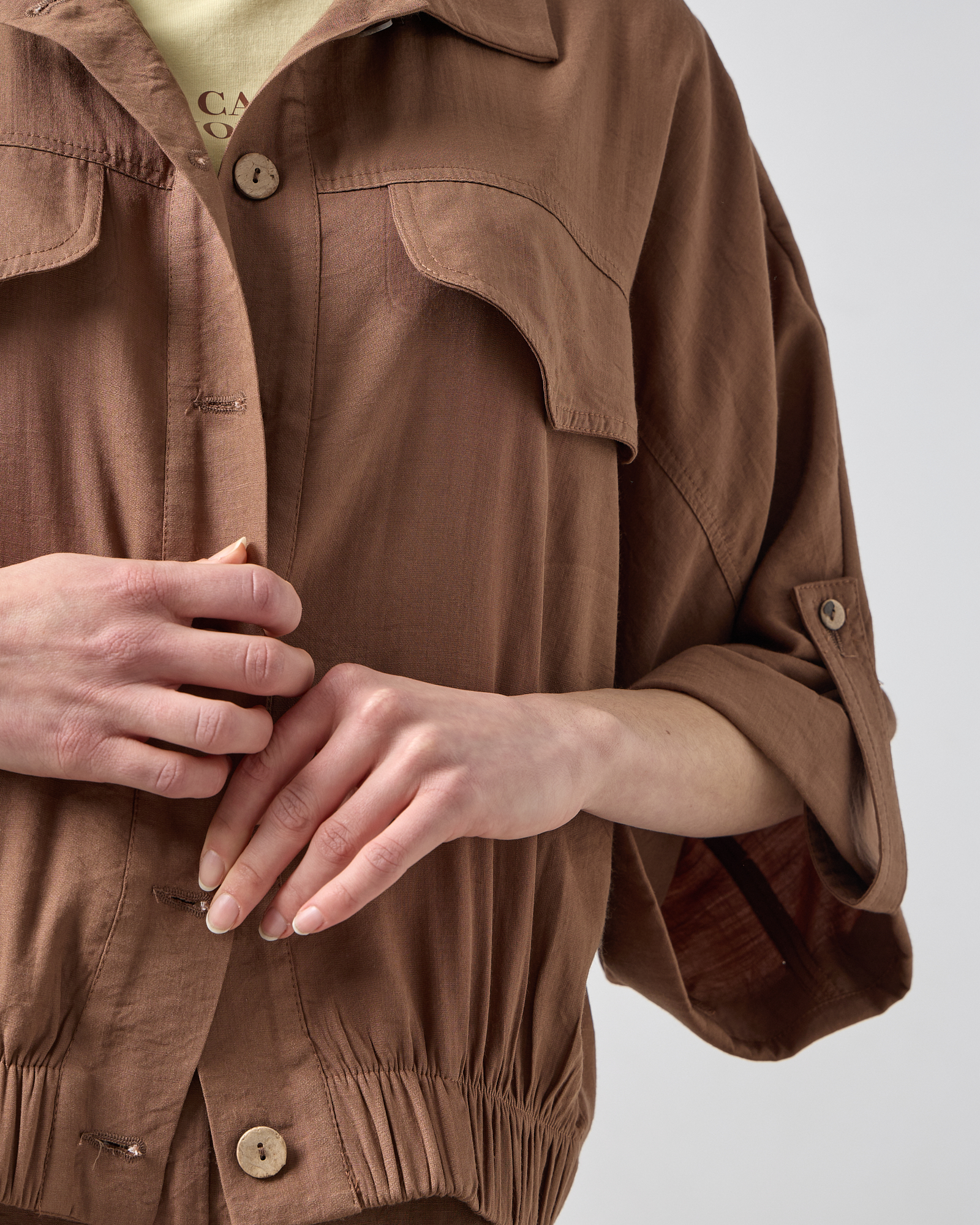 Bomber τζάκετ με μανίκι 3/4, με γιακά, κλείσιμο μπροστά με κουμπιά, διακοσμητικό καπάκι τσέπης στο στήθος, λάστιχο στο κάτω μέρος, άνετη εφαρμογή