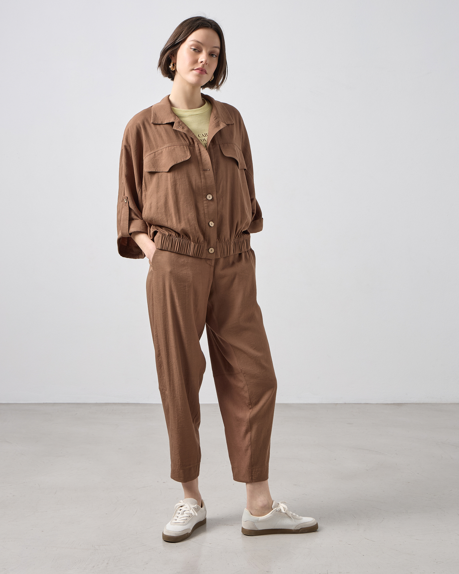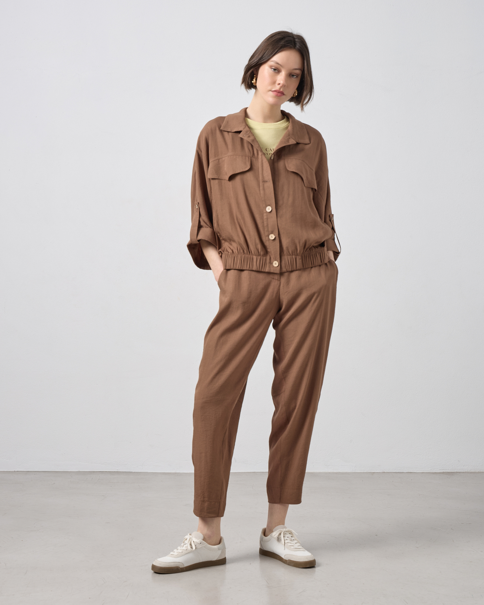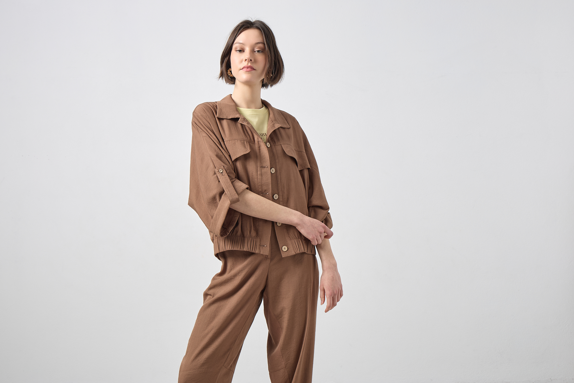 Bomber τζάκετ με μανίκι 3/4, με γιακά, κλείσιμο μπροστά με κουμπιά, διακοσμητικό καπάκι τσέπης στο στήθος, λάστιχο στο κάτω μέρος, άνετη εφαρμογή