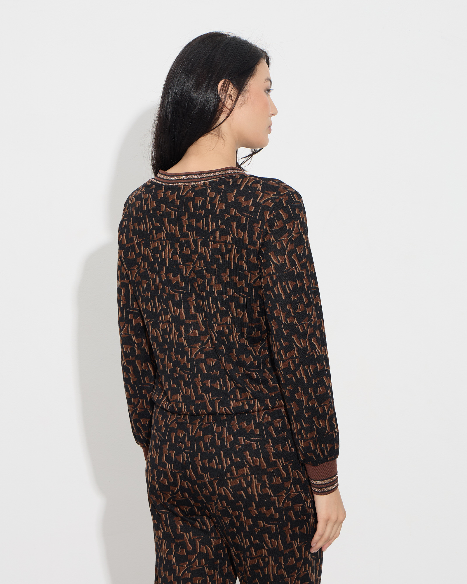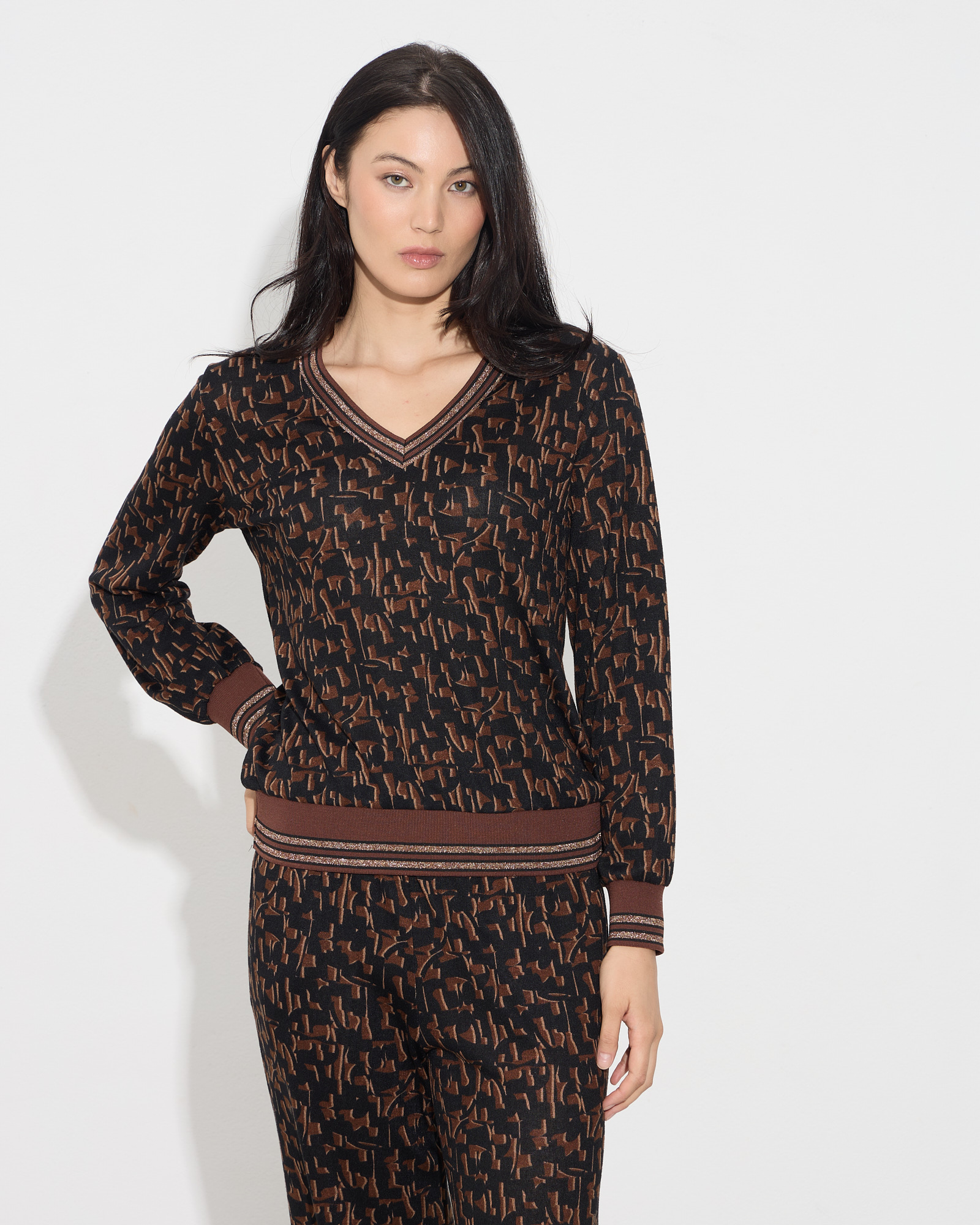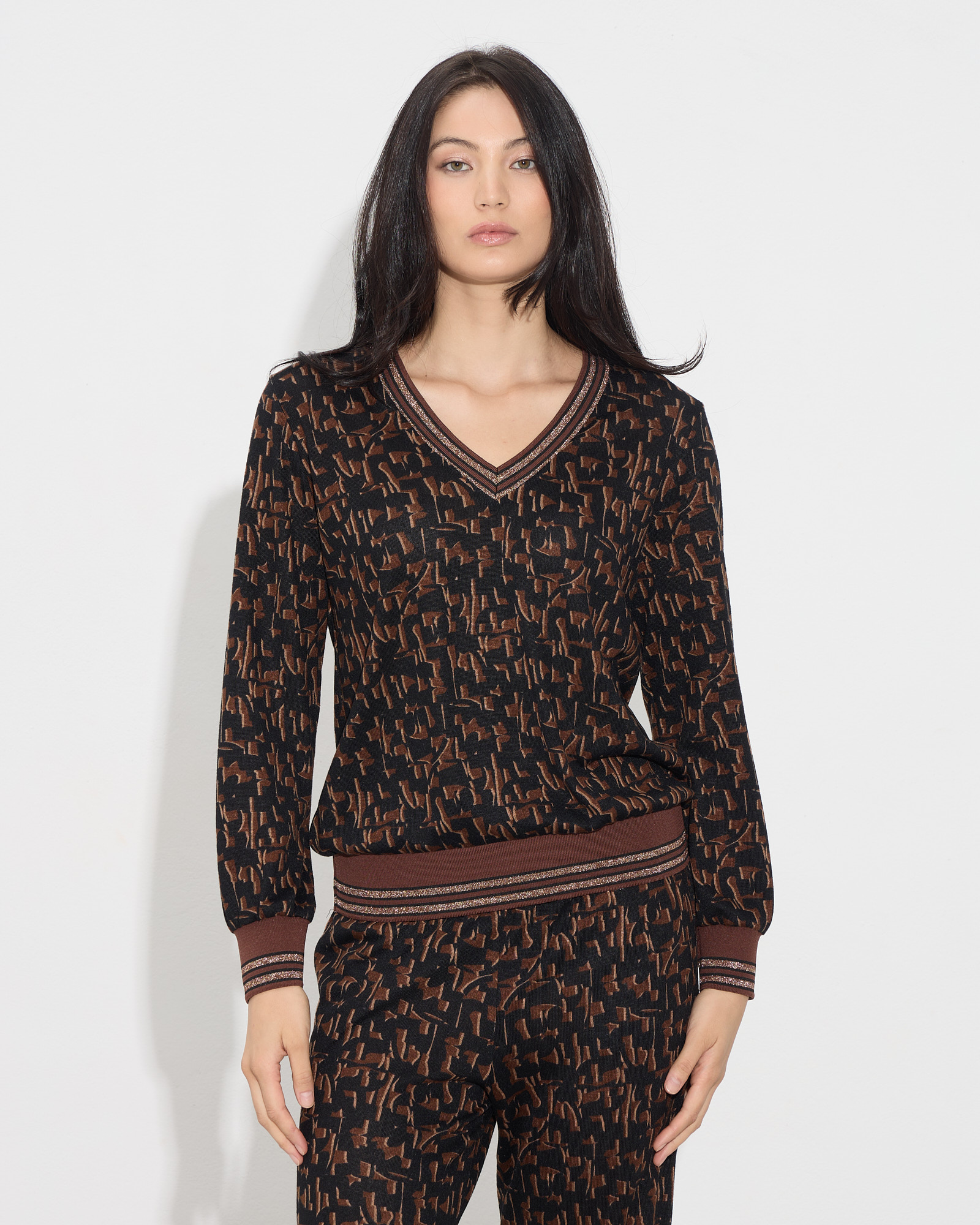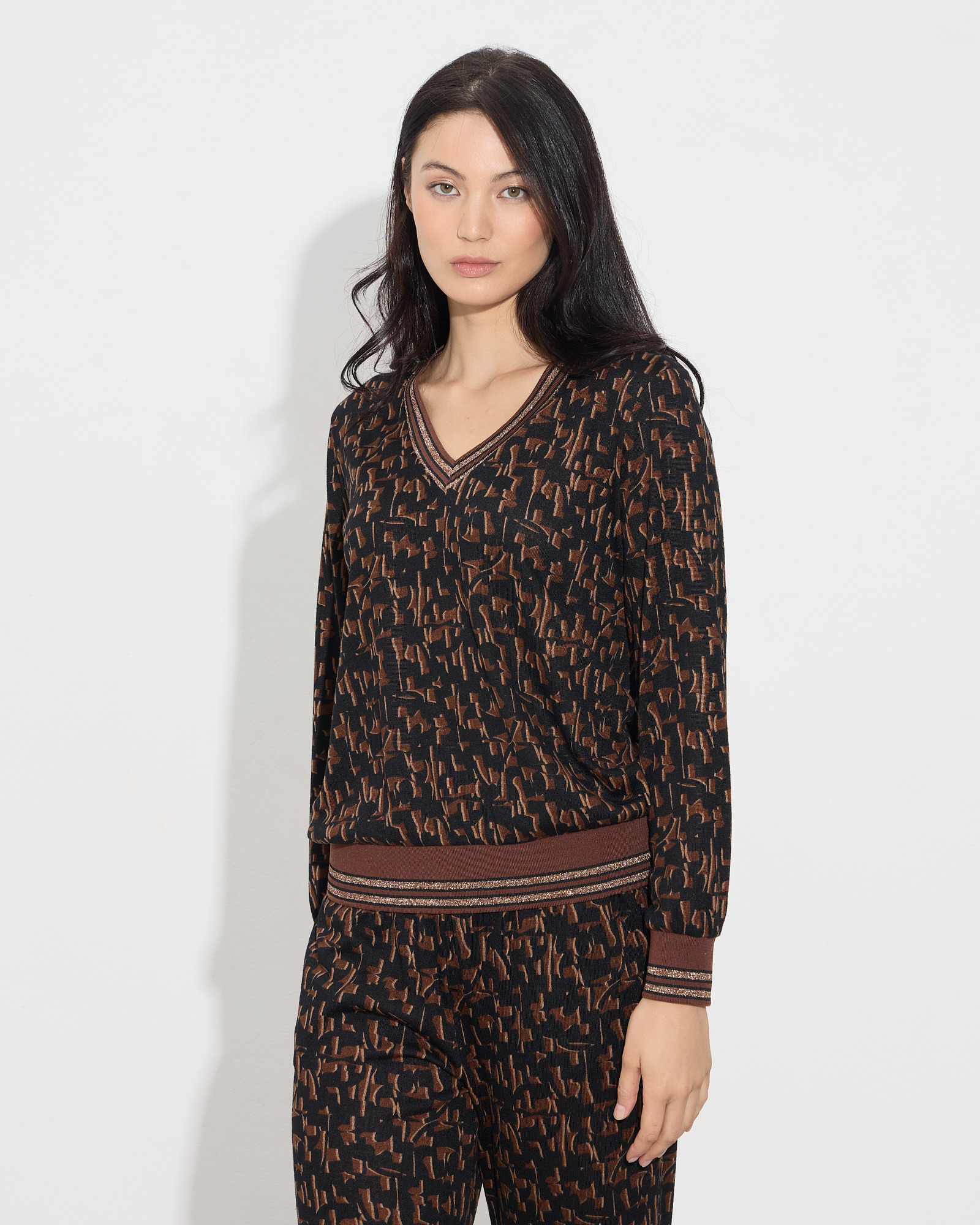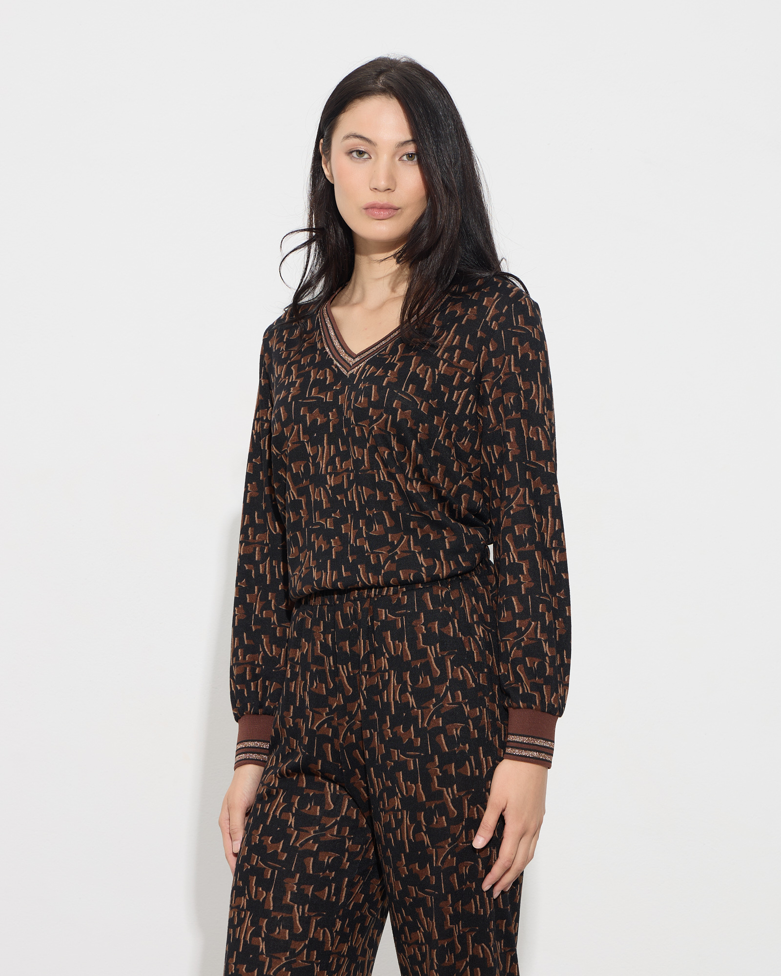 Μπλούζα σε abstract print, με V λαιμόκοψη και τρέσα στο λαιμό, λεπτομέρεια τρέσας στη μανσέτα και στο τελείωμα, σε κανονική γραμμή