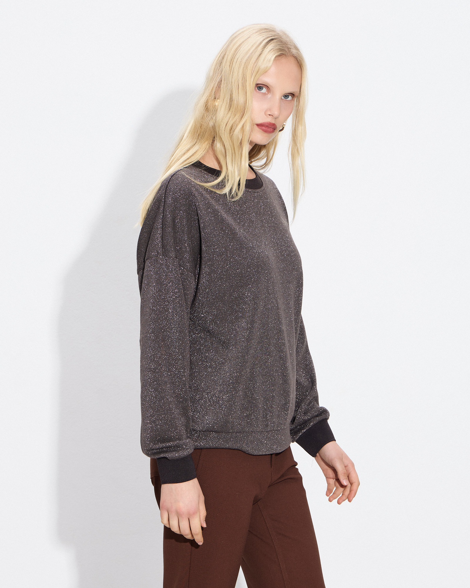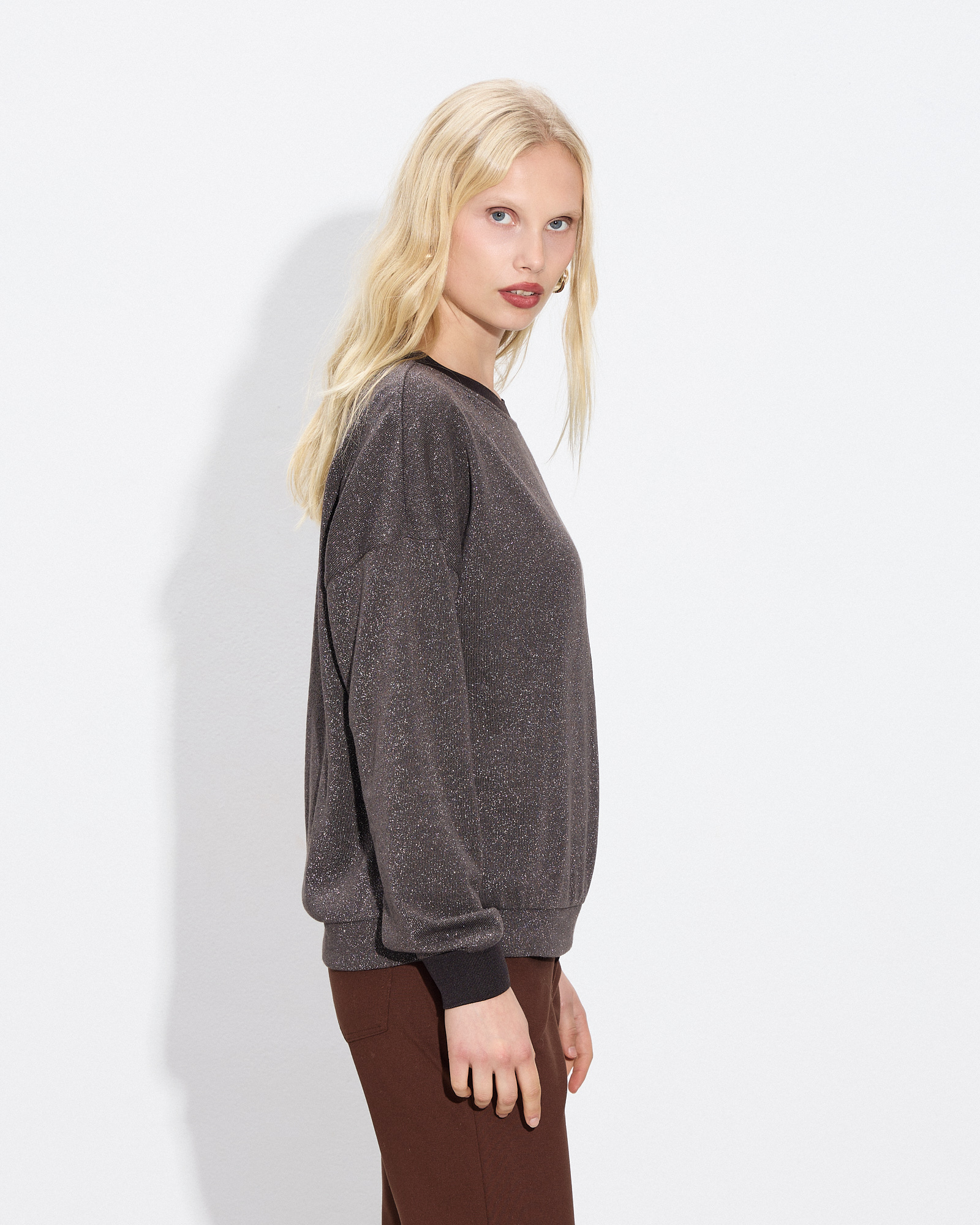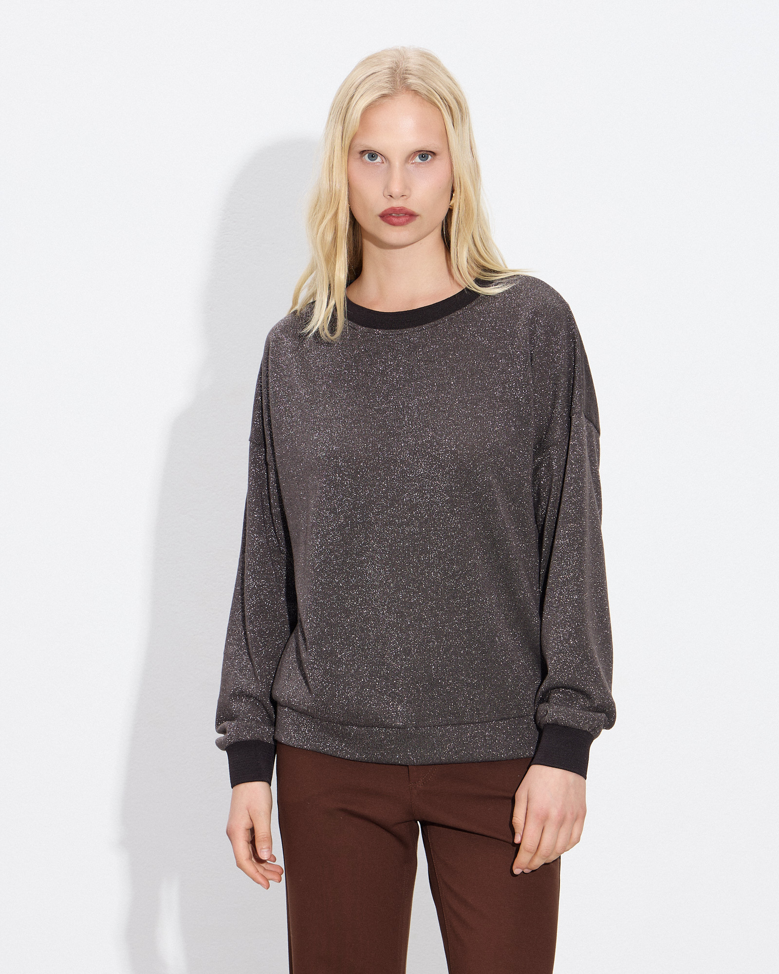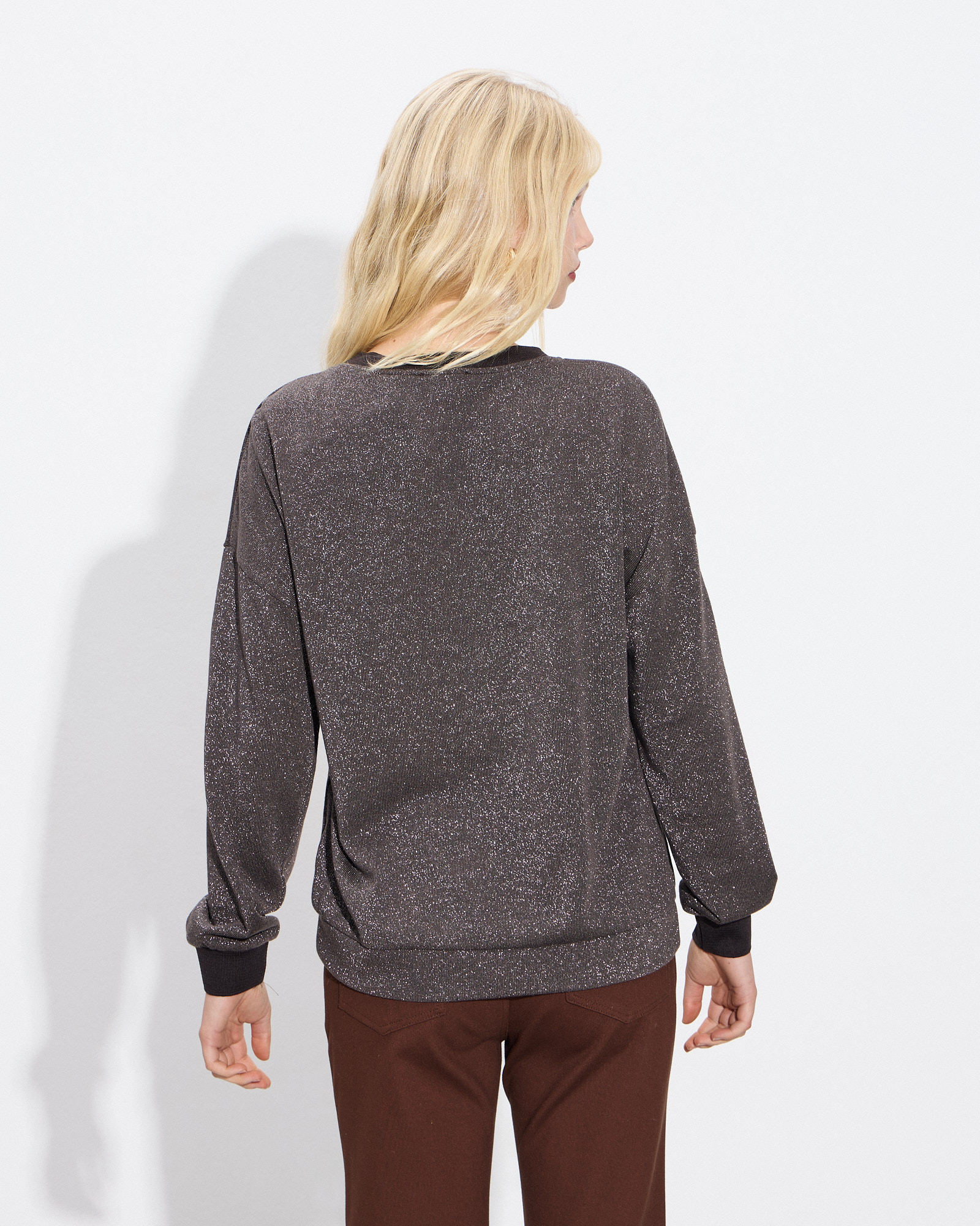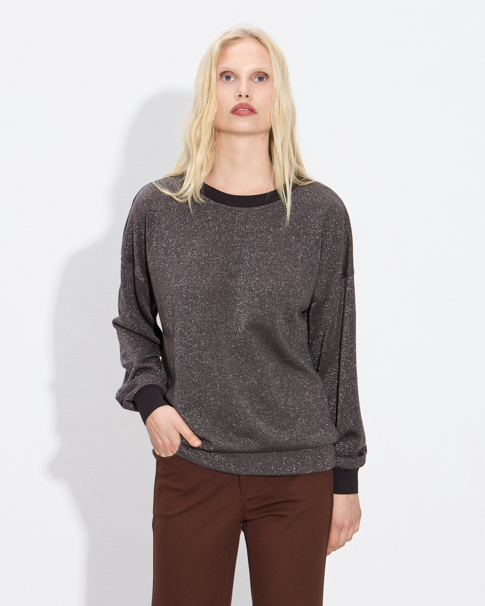 Μπλούζα μακρυμάνικη πλεκτή με λούρεξ ύφασμα, στρογγυλή λαιμόκοψη, σε κανονική γραμμή