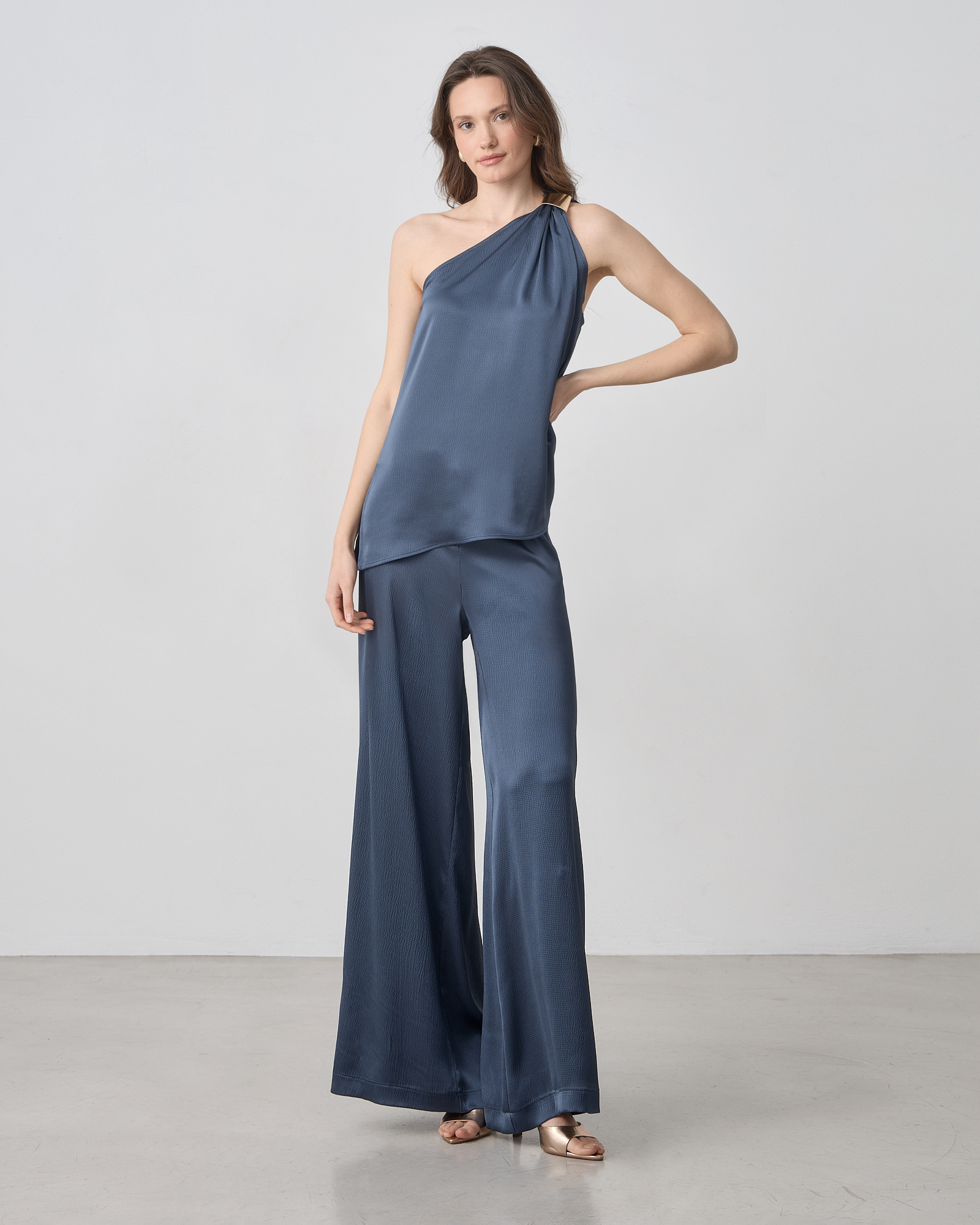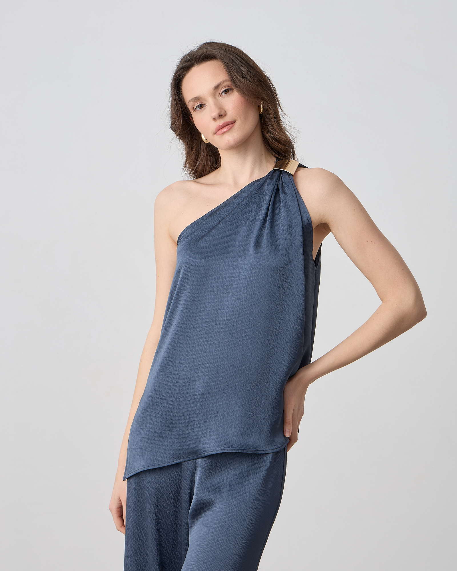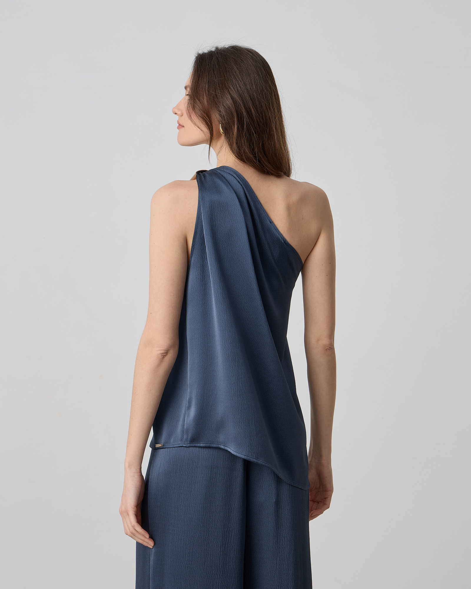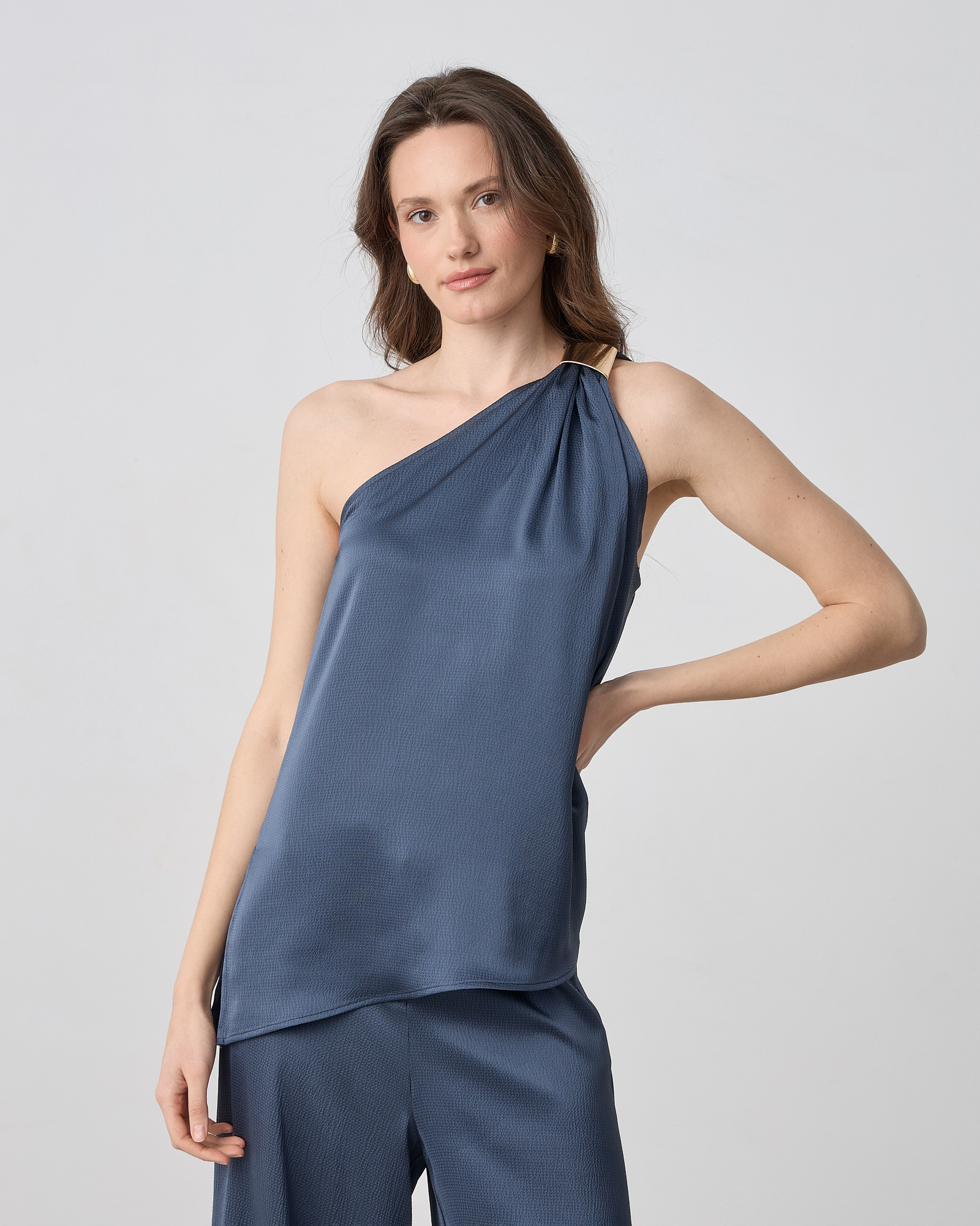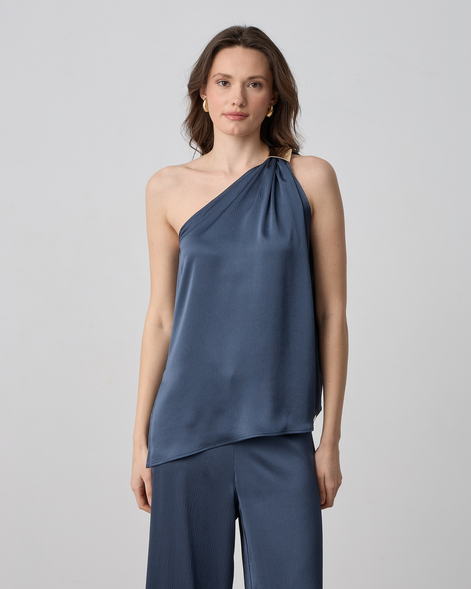 Μπλούζα αμάνικη με έναν ώμο σε σατέν υφή με διακοσμητική εγγράφα σε κανονική εφαρμογή