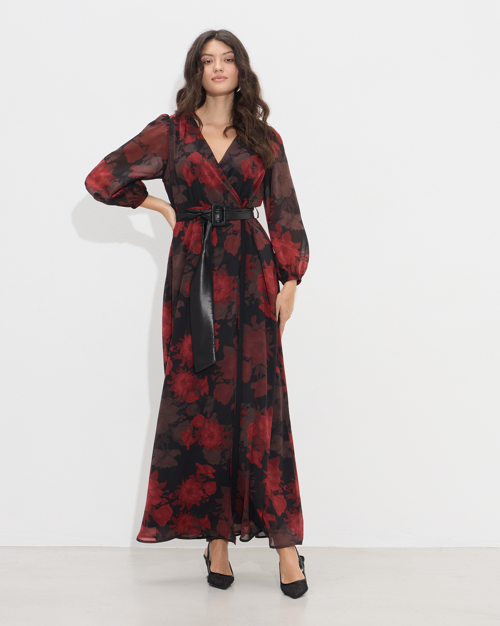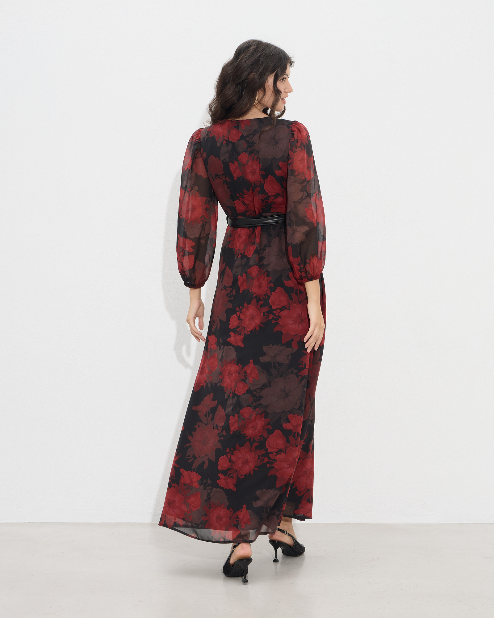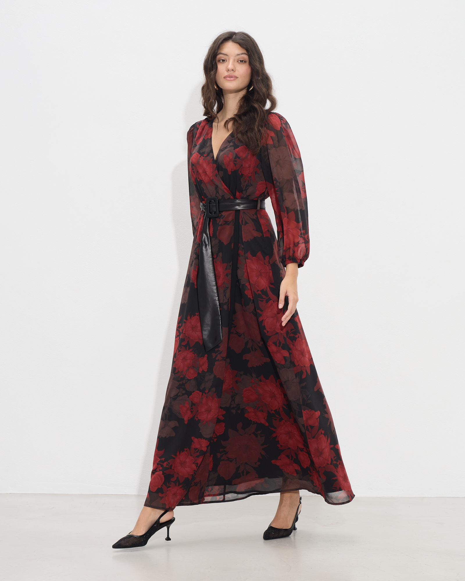 Φόρεμα maxi κρουαζέ φλοράλ με μακρύ μανίκι με λάστιχο στο τελείωμα, διαθέτει κουμπί στη μέση και αποσπώμενη ζώνη σε αέρινο ύφασμα με εσωτερική φόδρα, σε κανονική γραμμή