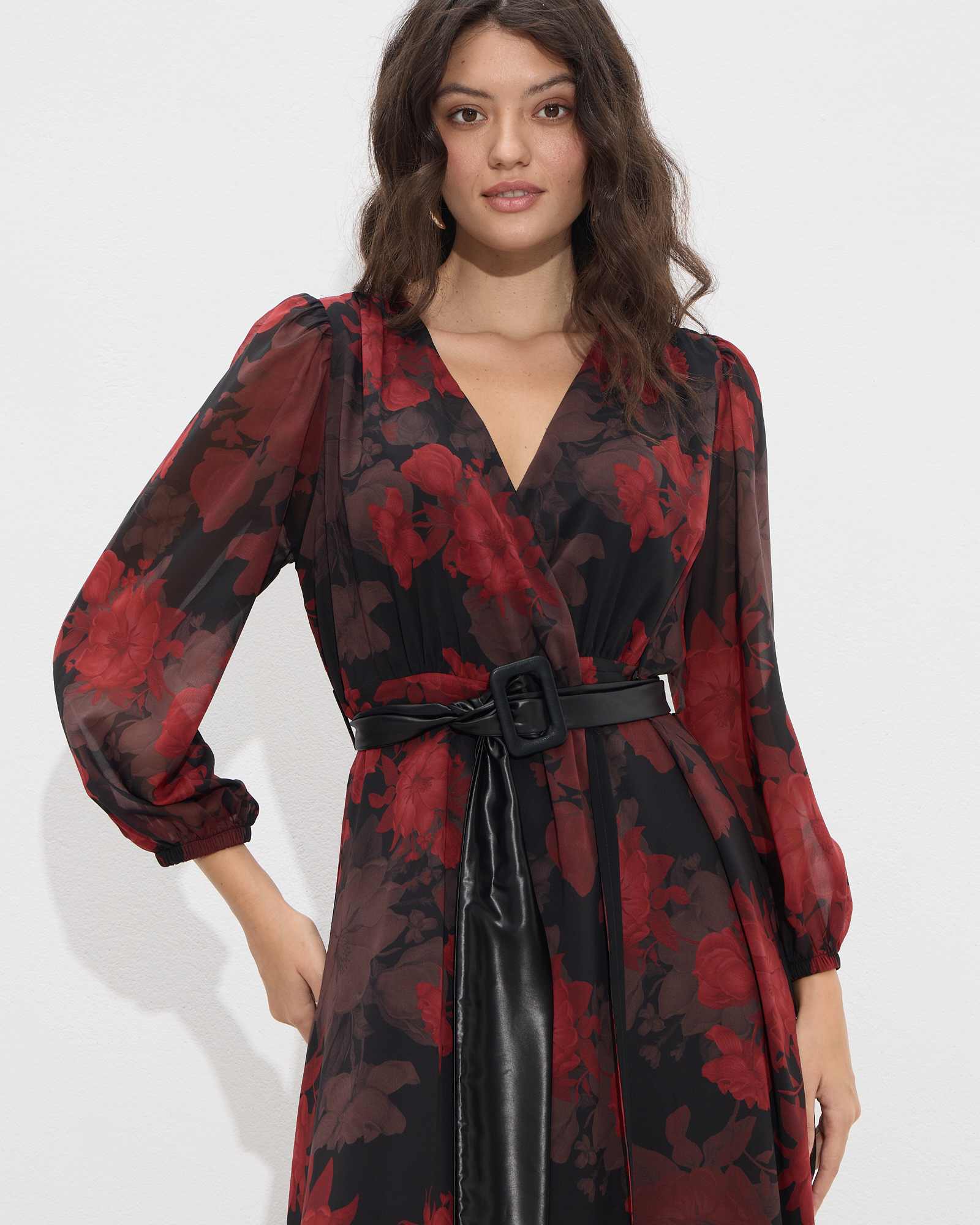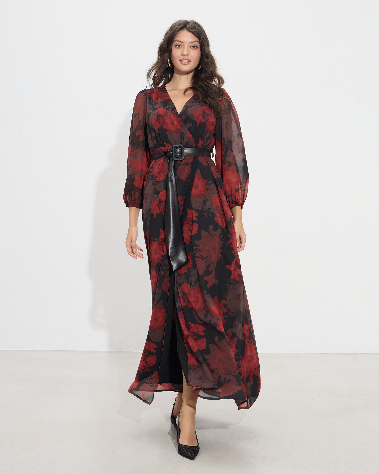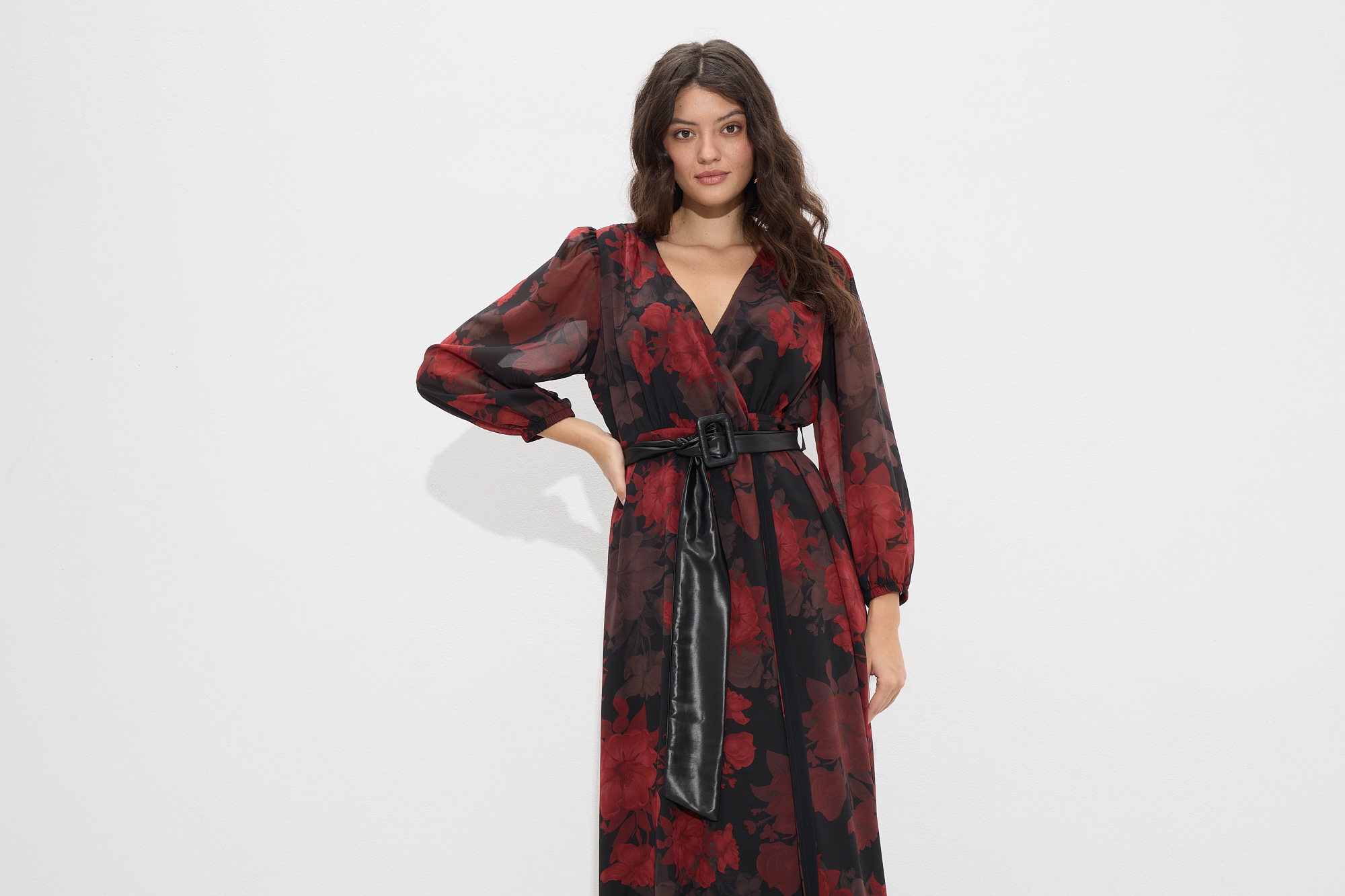 Φόρεμα maxi κρουαζέ φλοράλ με μακρύ μανίκι με λάστιχο στο τελείωμα, διαθέτει κουμπί στη μέση και αποσπώμενη ζώνη σε αέρινο ύφασμα με εσωτερική φόδρα, σε κανονική γραμμή