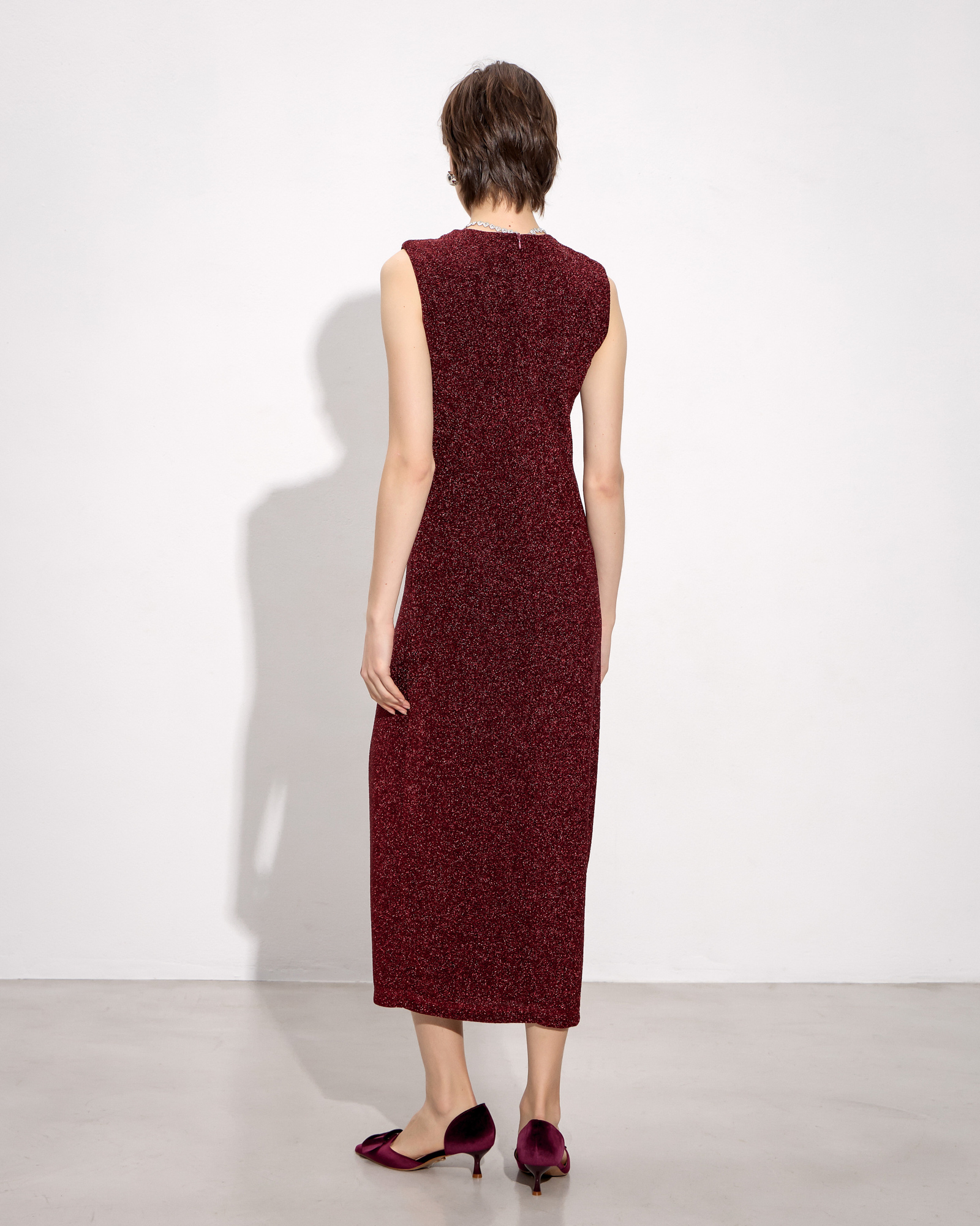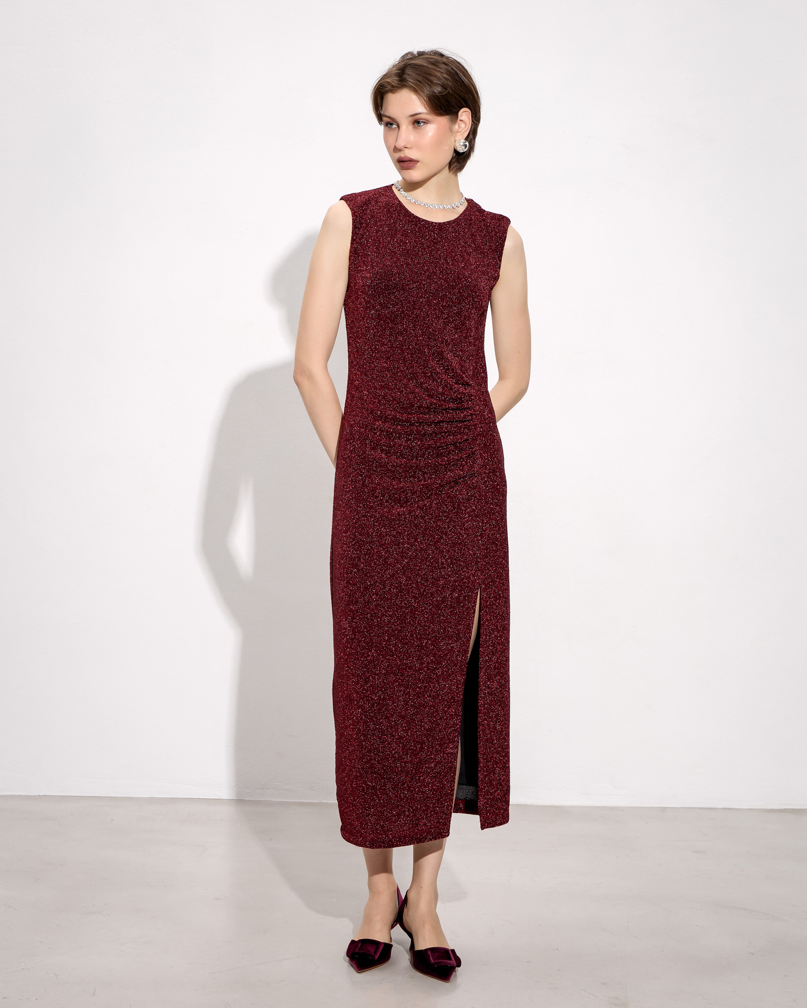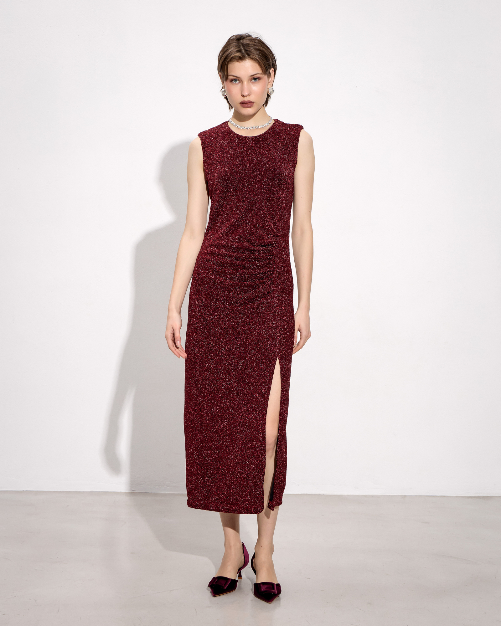 Φόρεμα midi αμάνικο, στρογγυλή λαιμόκοψη, σκίσιμο μπροστά, λούρεξ ύφασμα, σε κανονική γραμμή