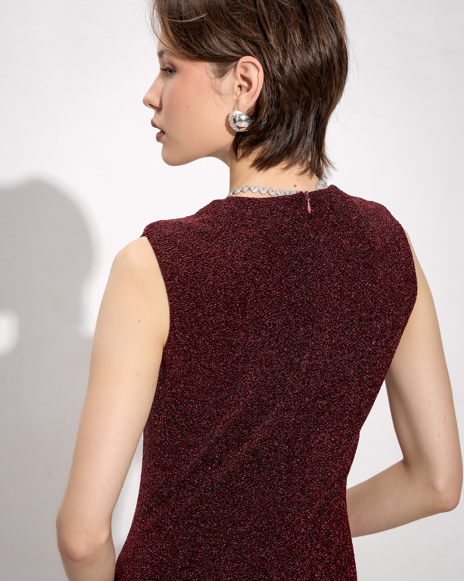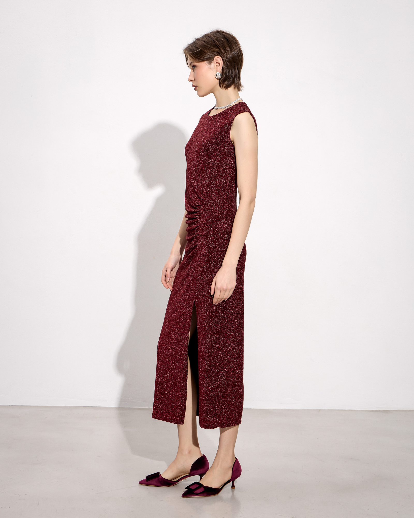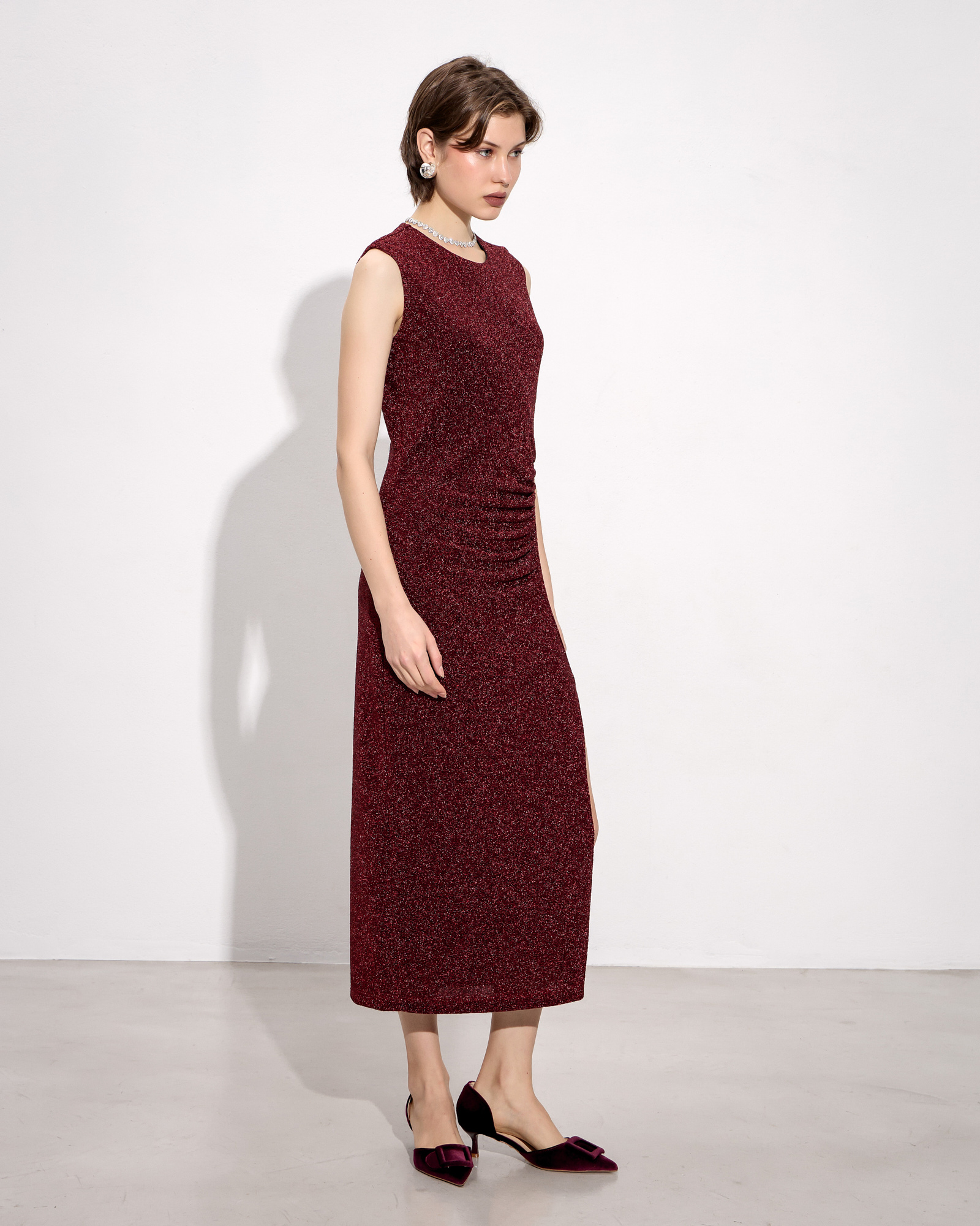 Φόρεμα midi αμάνικο, στρογγυλή λαιμόκοψη, σκίσιμο μπροστά, λούρεξ ύφασμα, σε κανονική γραμμή