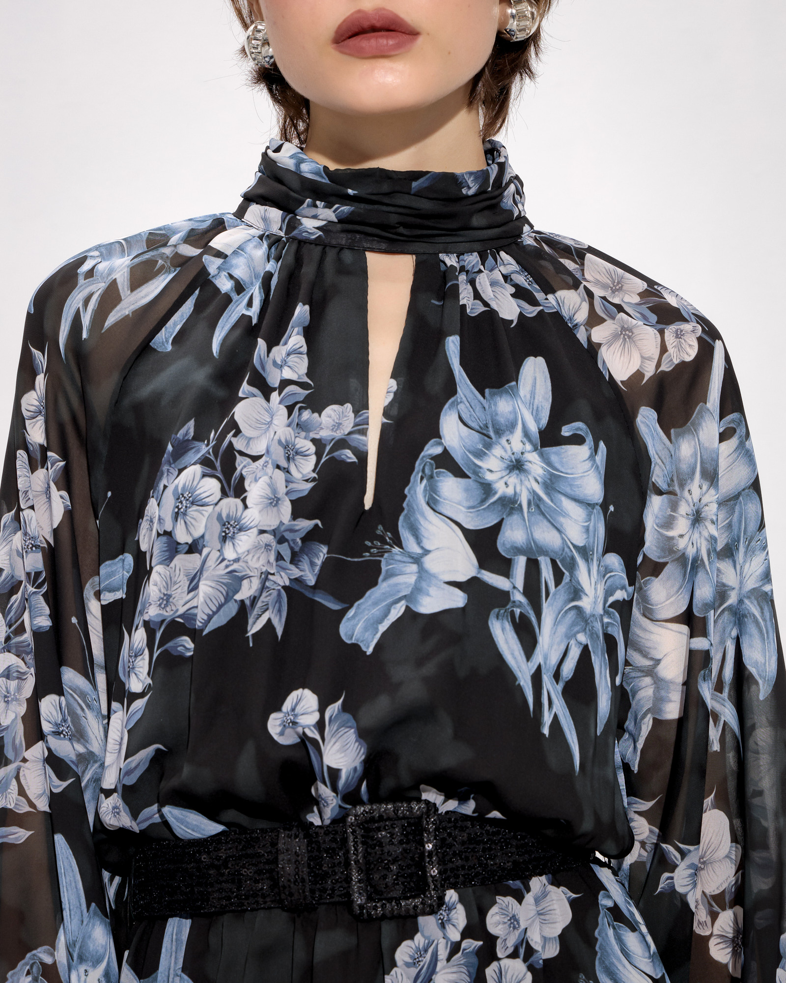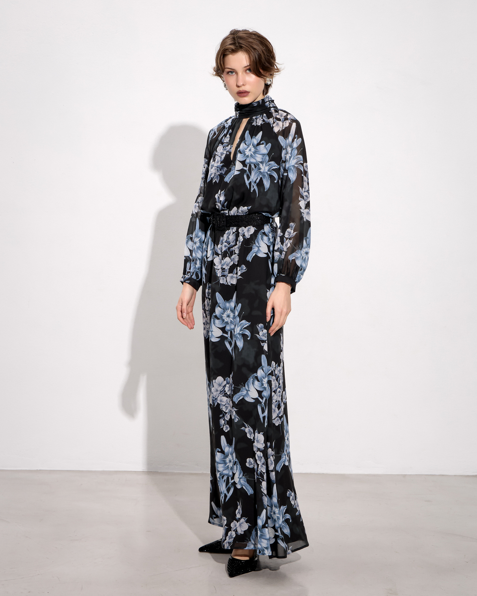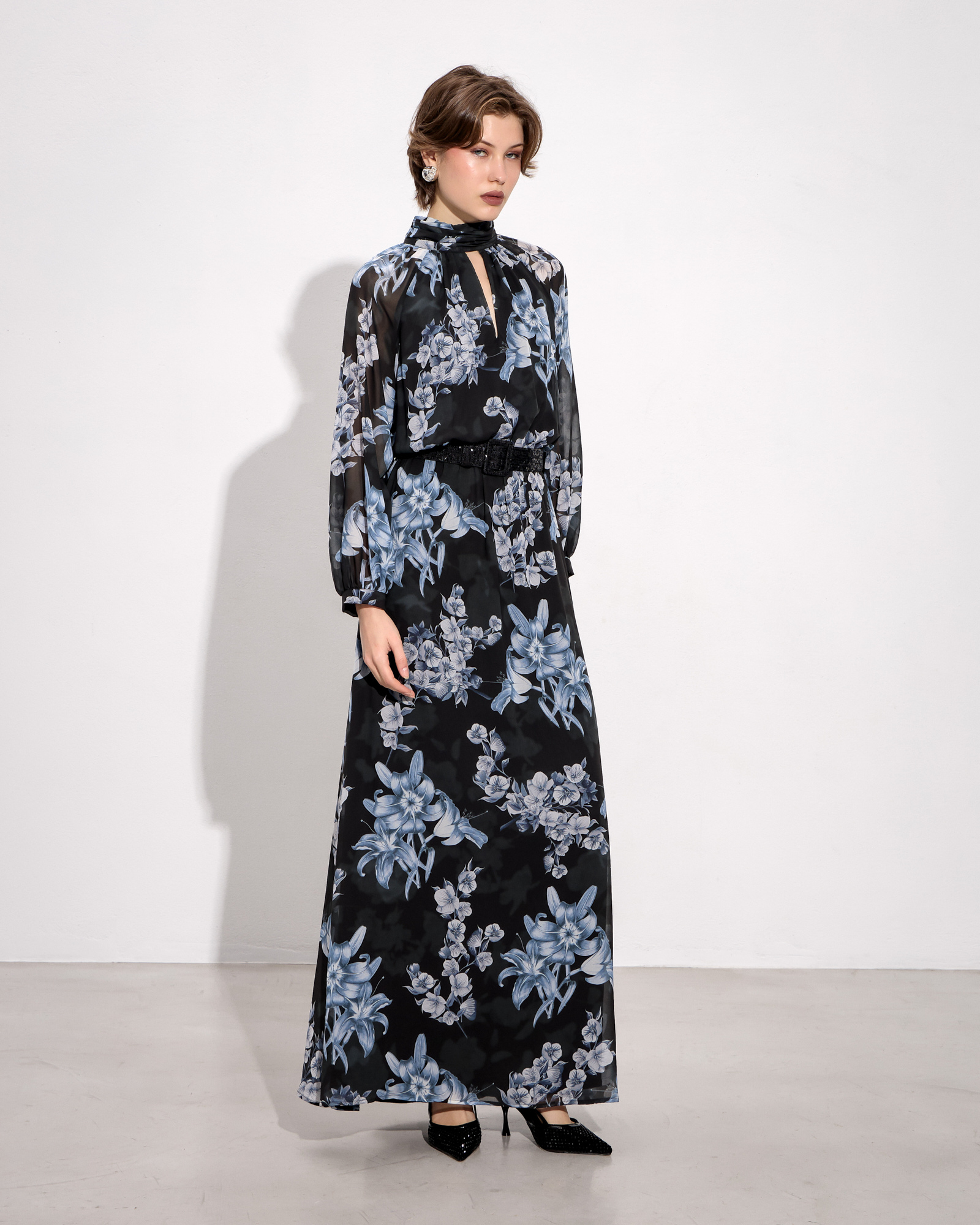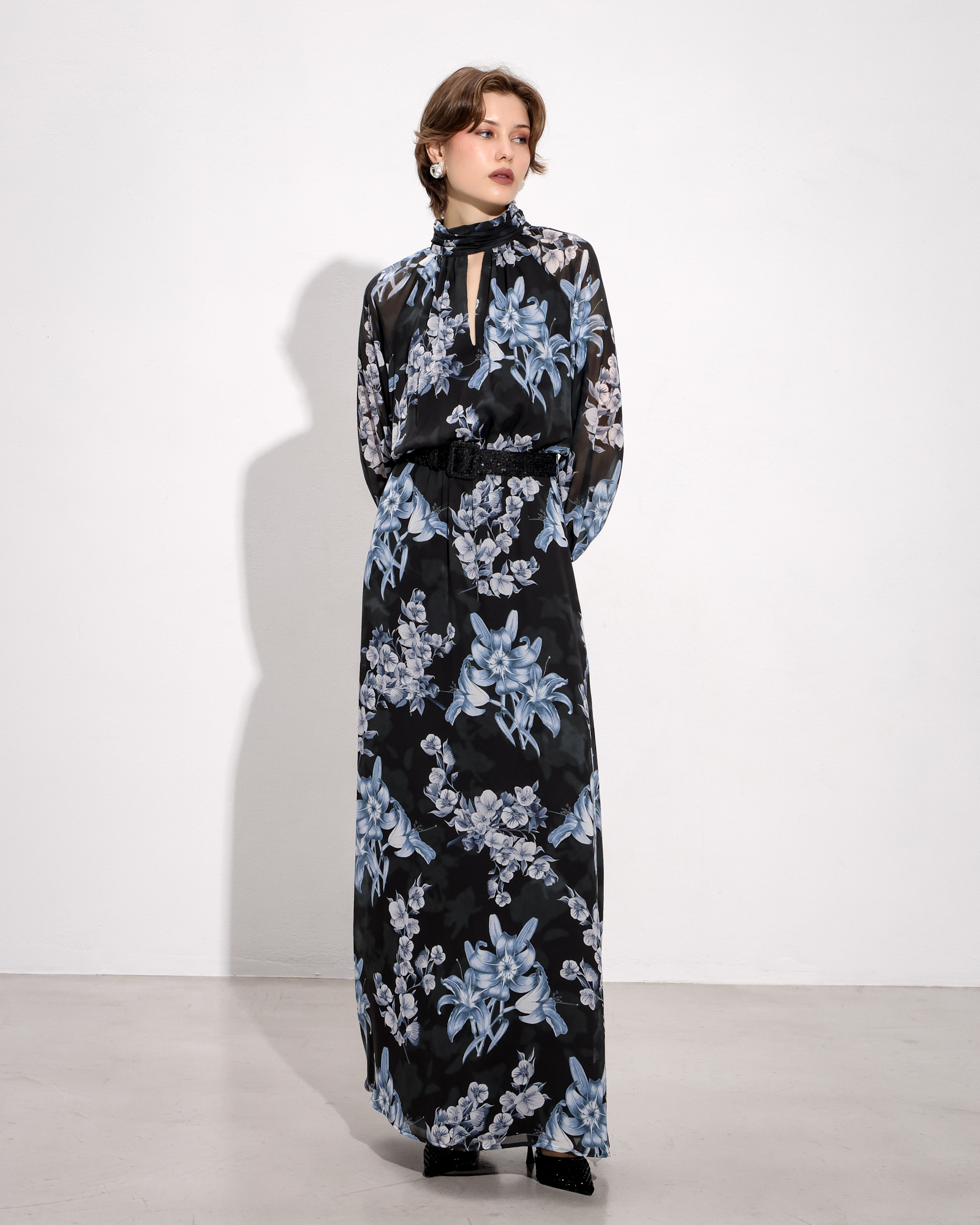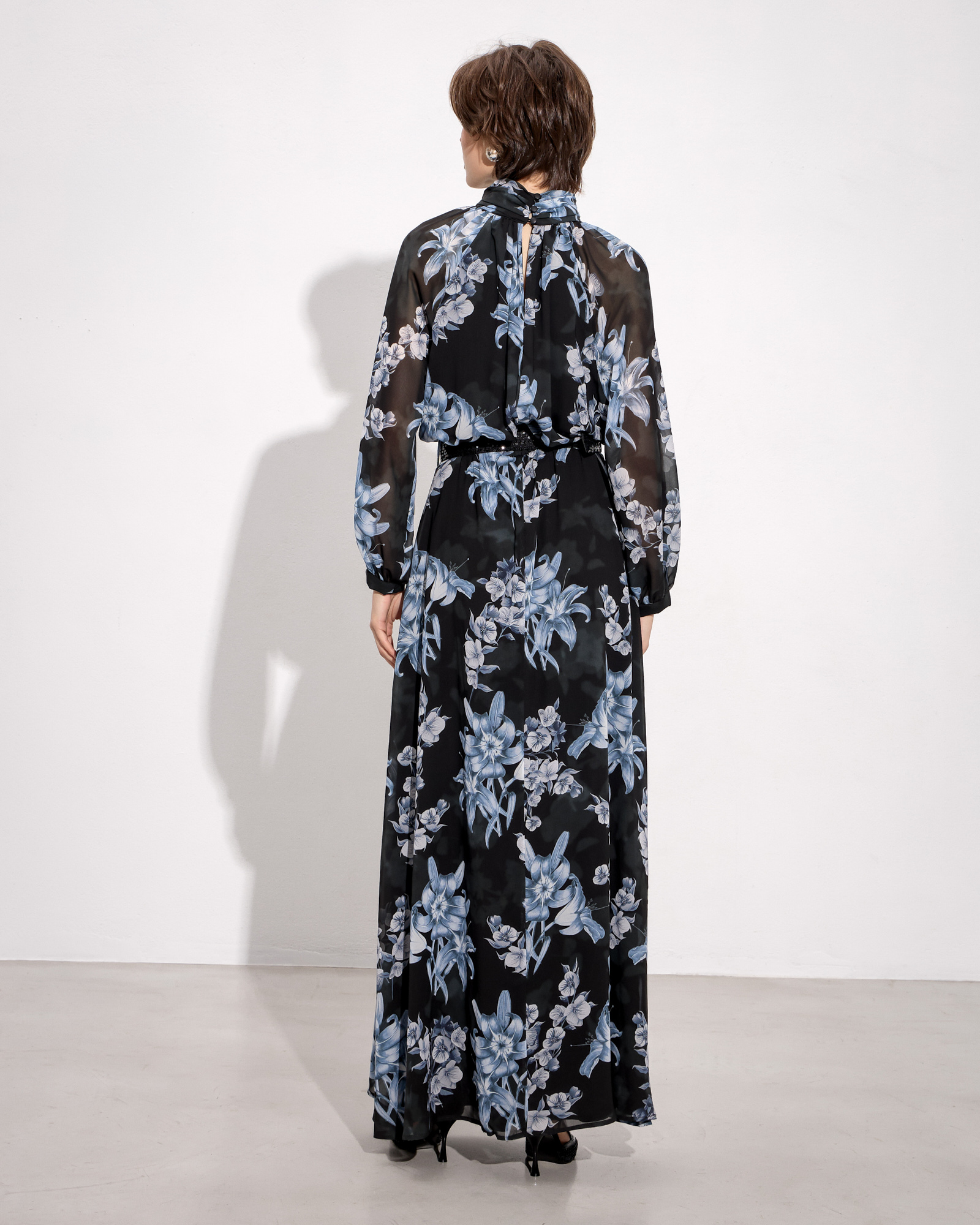 Φόρεμα maxi φλοράλ με λαιμόκοψη halter με άνοιγμα στο ντεκολτέ και κλείσιμο με κουμπιά στο πίσω μέρος, μακρύ μανίκι με μανσέτα, αποσπώμενη ζώνη, σκίσιμο στο πλάι, αέρινο ύφασμα, σε κανονική γραμμή
