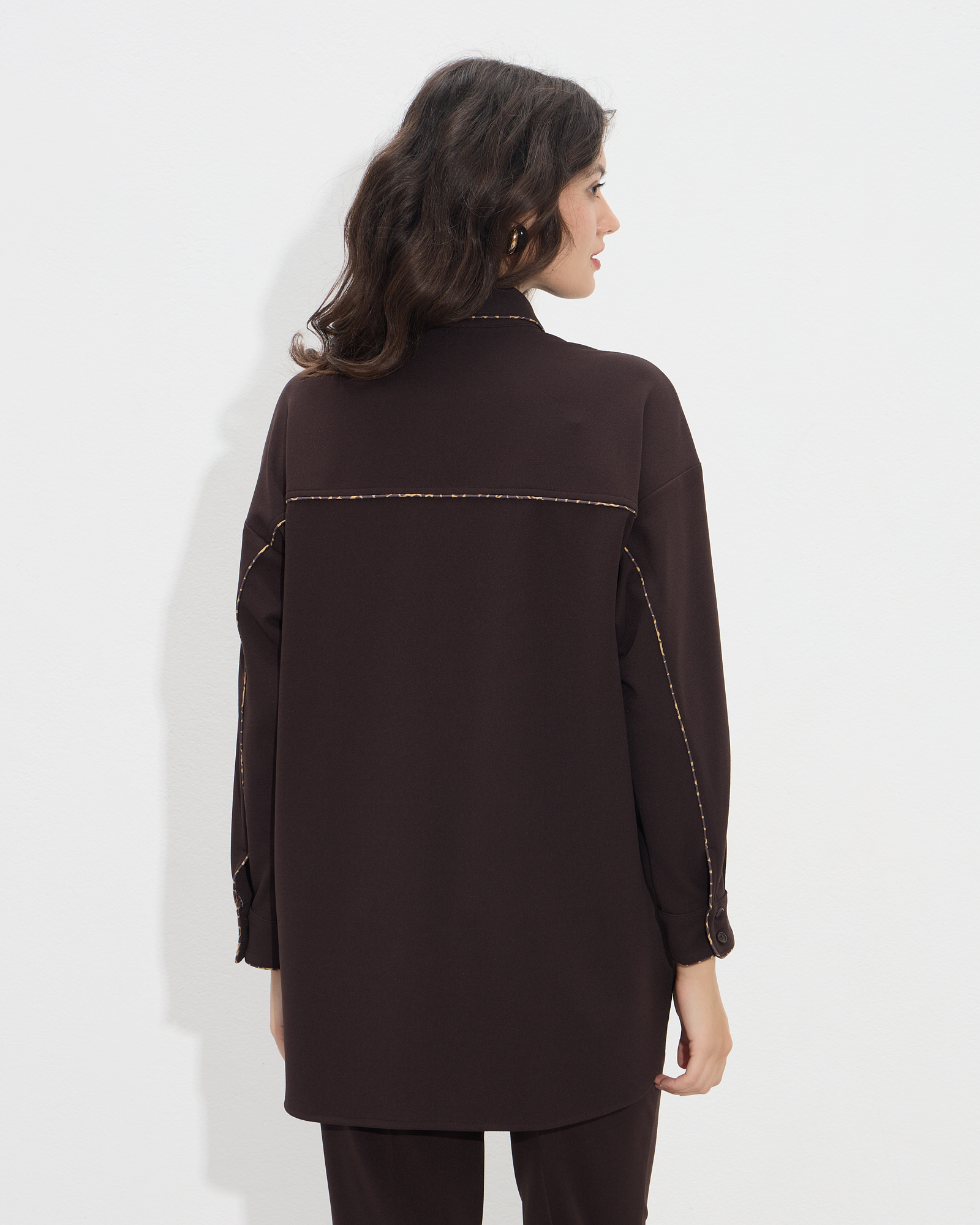 Πουκαμίσα oversized με γιακά, κλείσιμο με κουμπιά μπροστά, με διακοσμητικό λεοπάρ ρέλι, μακριά μανίκια με κουμπιά στις μανσέτες, ασύμμετρο τελείωμα, σε άνετη γραμμή