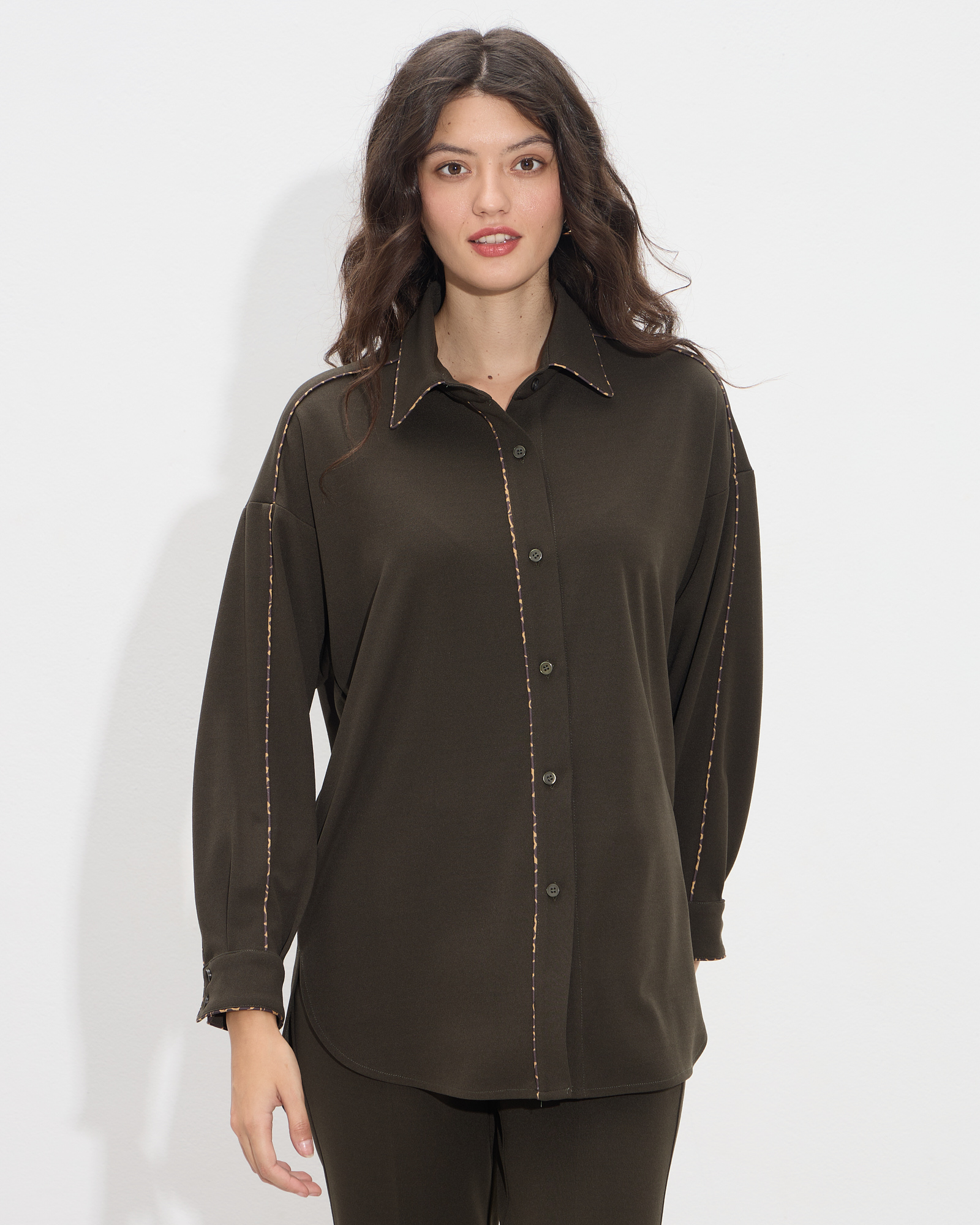 Πουκαμίσα oversized με γιακά, κλείσιμο με κουμπιά μπροστά, με διακοσμητικό λεοπάρ ρέλι, μακριά μανίκια με κουμπιά στις μανσέτες, ασύμμετρο τελείωμα, σε άνετη γραμμή