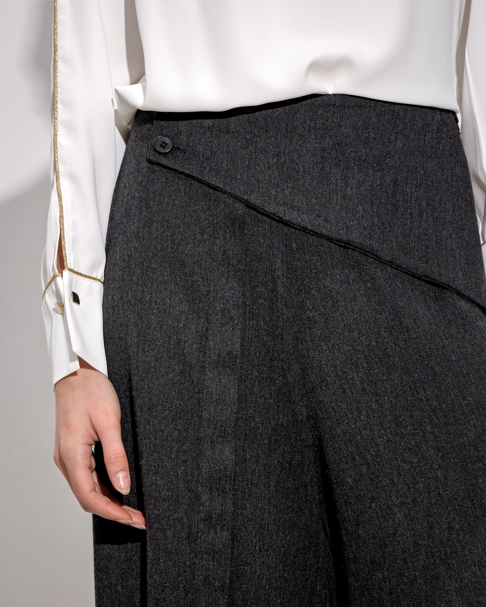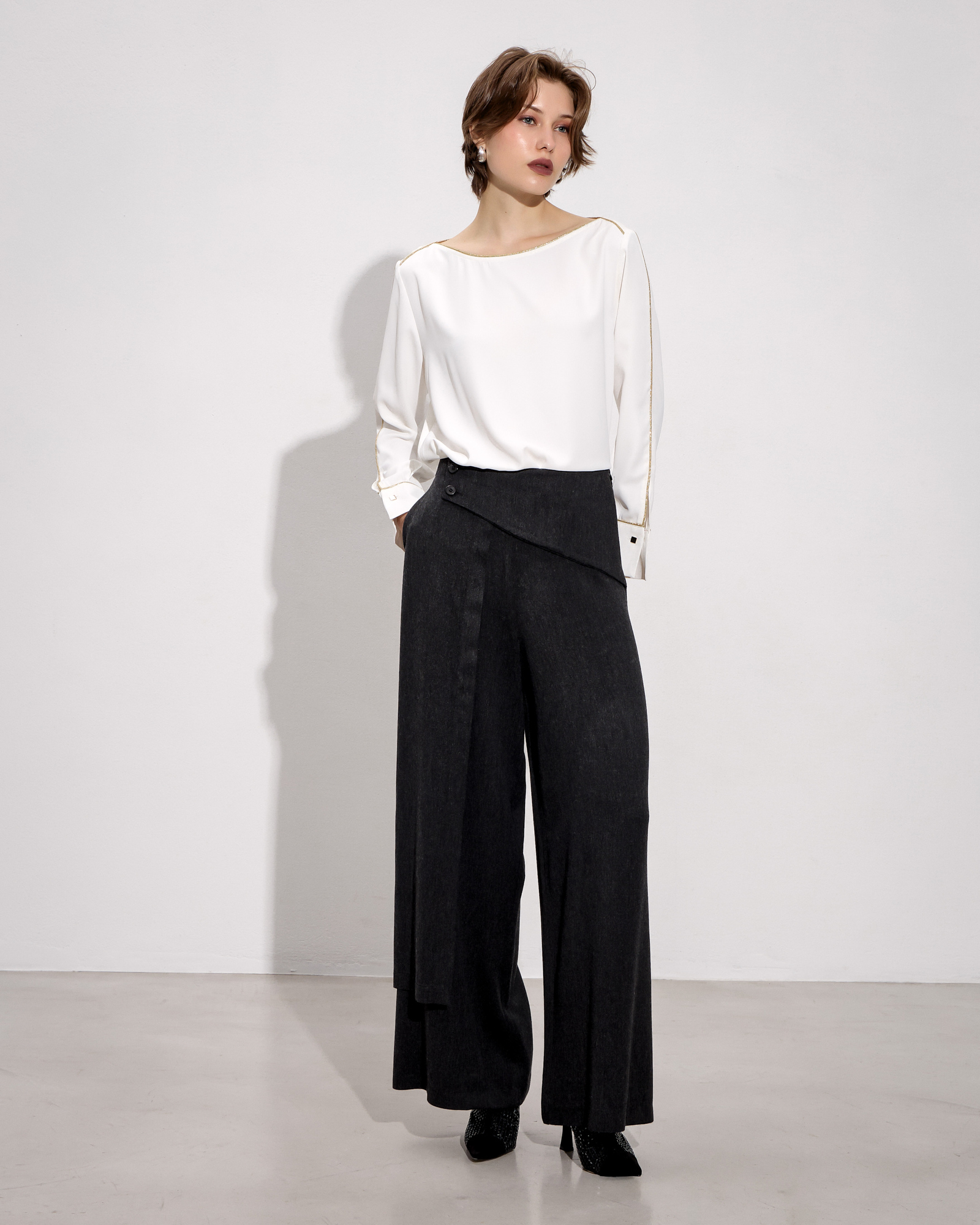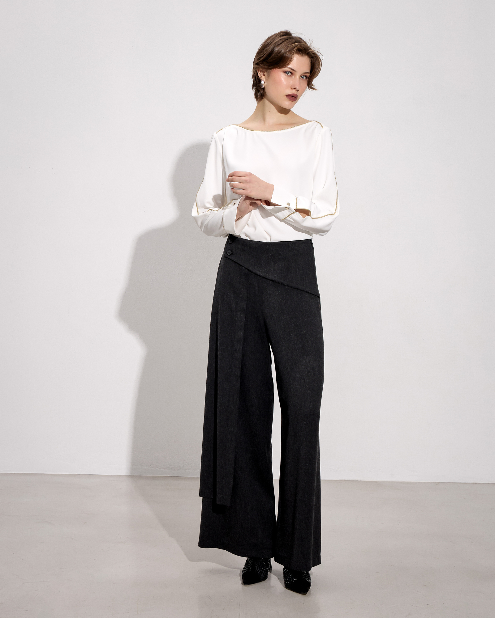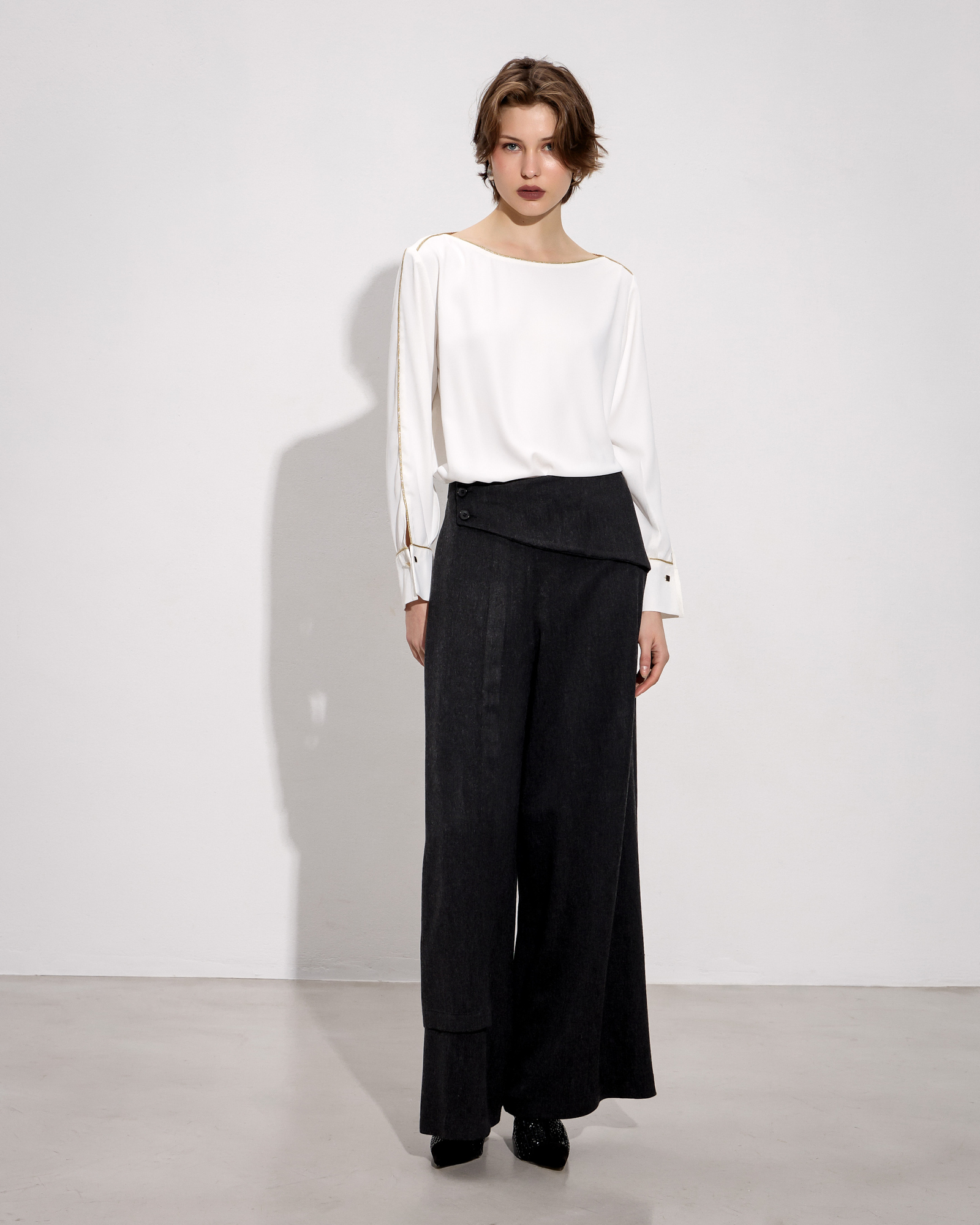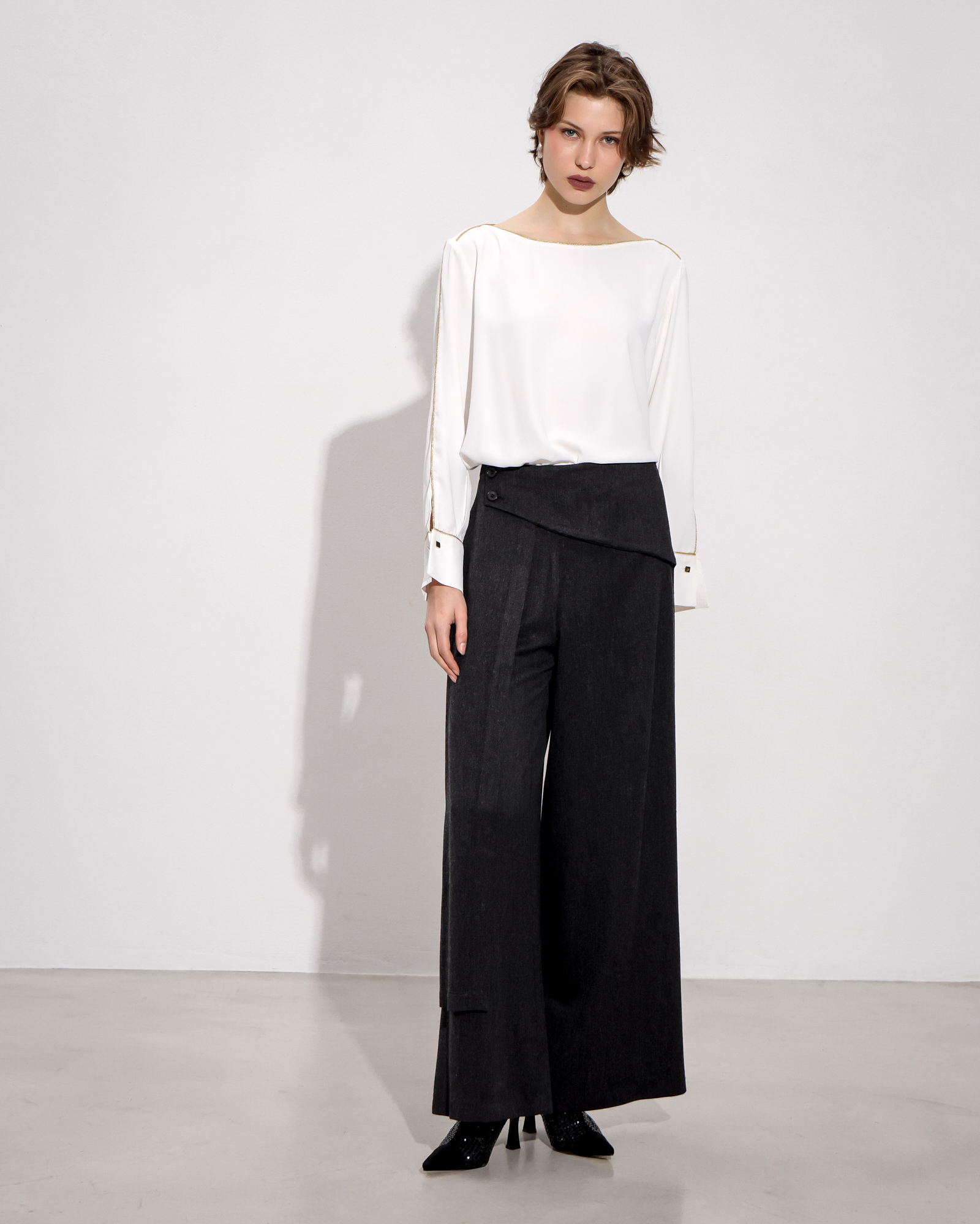 Παντελόνα ψηλόμεση με εξωτερικό πανό με κίνηση και κουμπιά στη μέση, με φερμουάρ στο πλάι και πλαϊνές τσέπες σε μαλακό ύφασμα, σε κανονική γραμμή