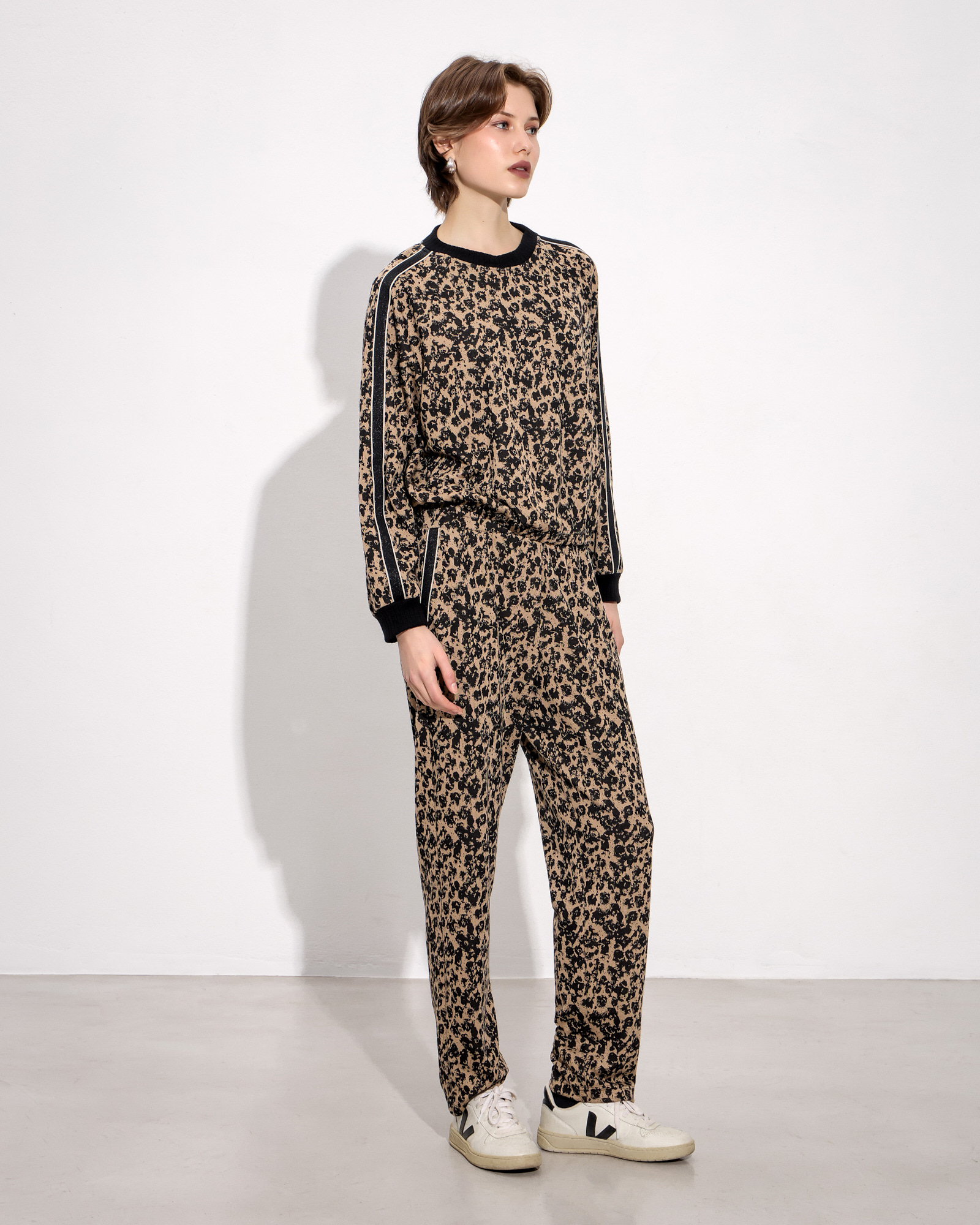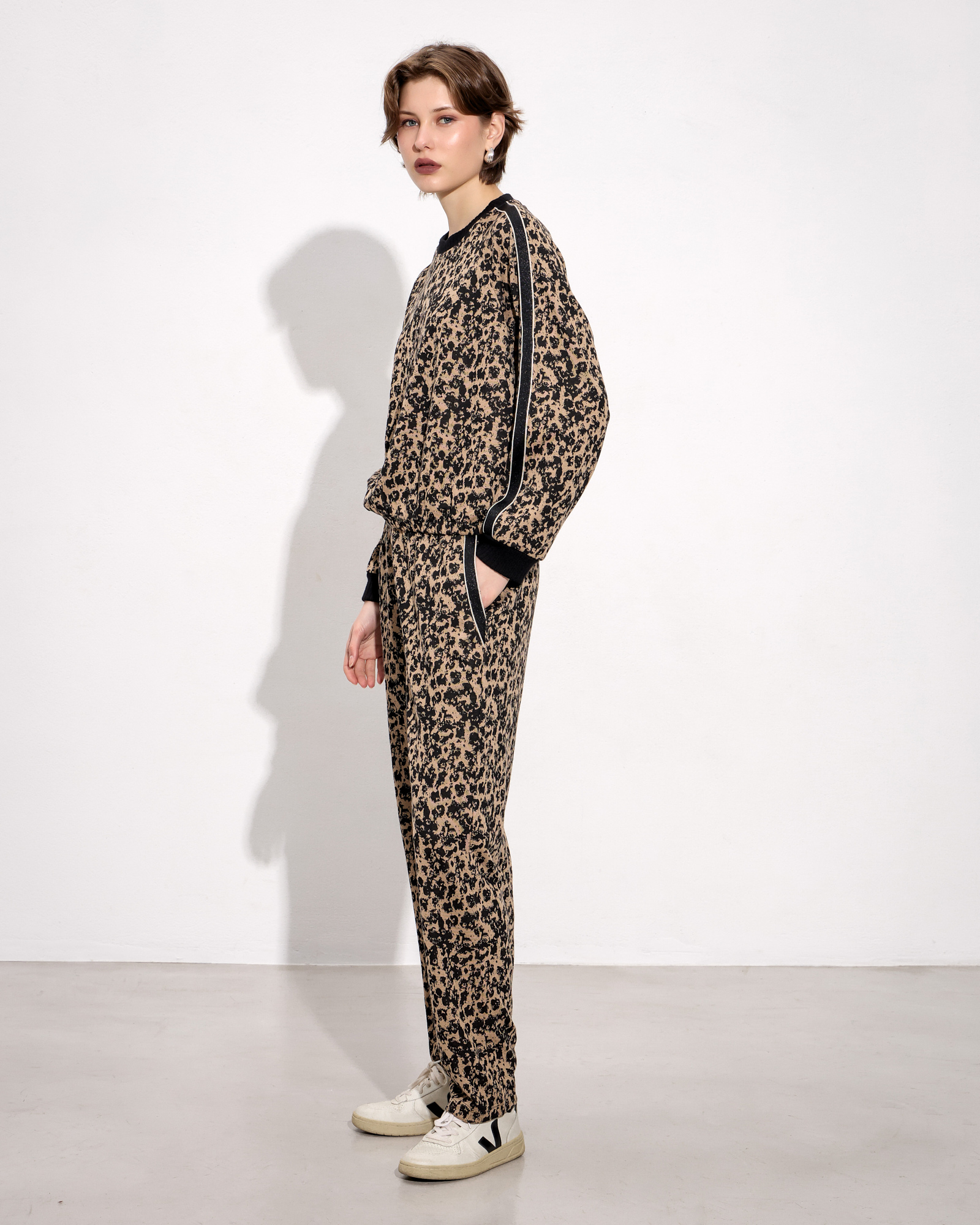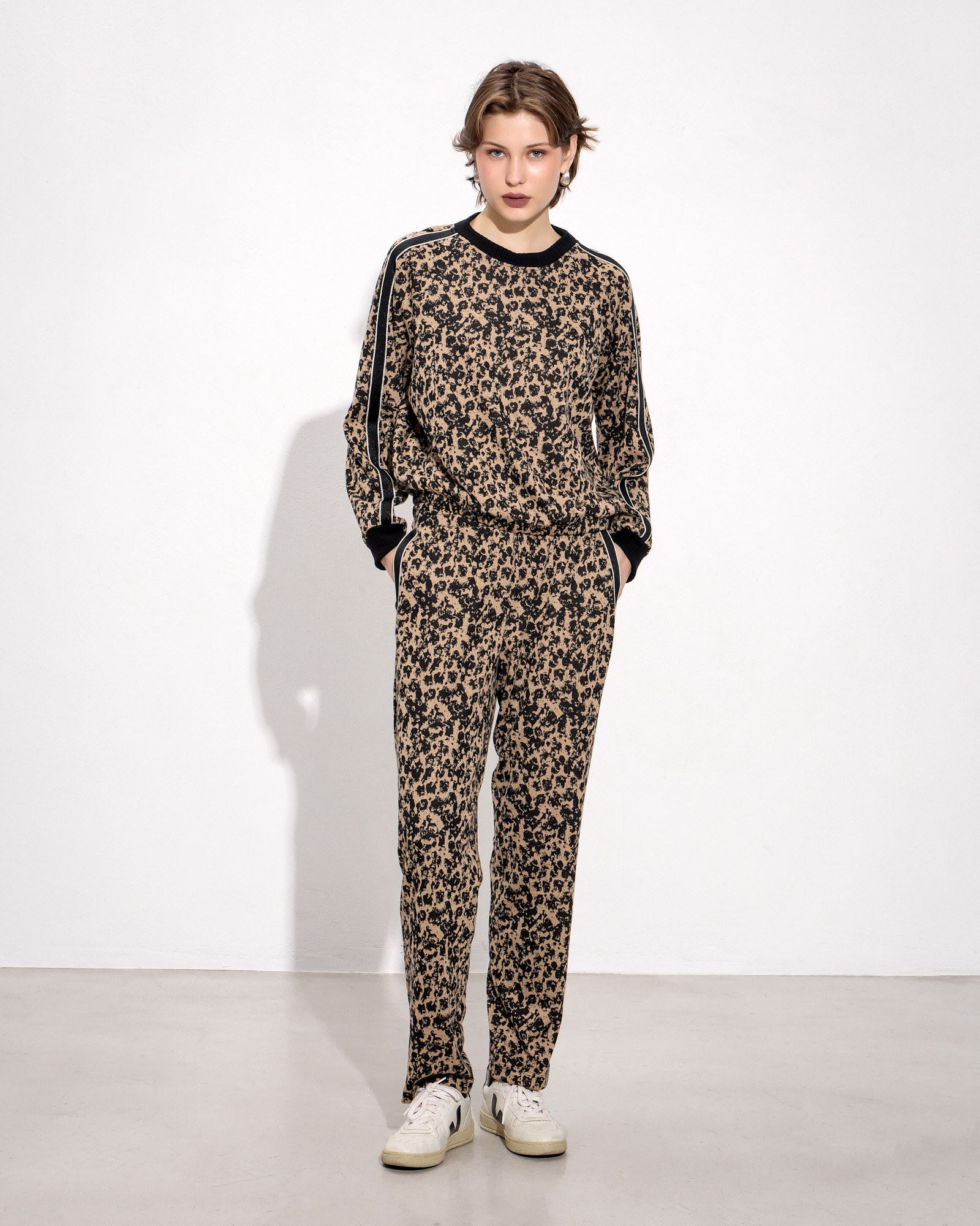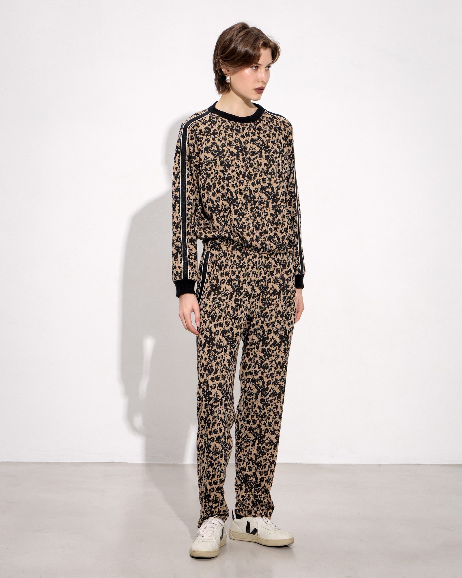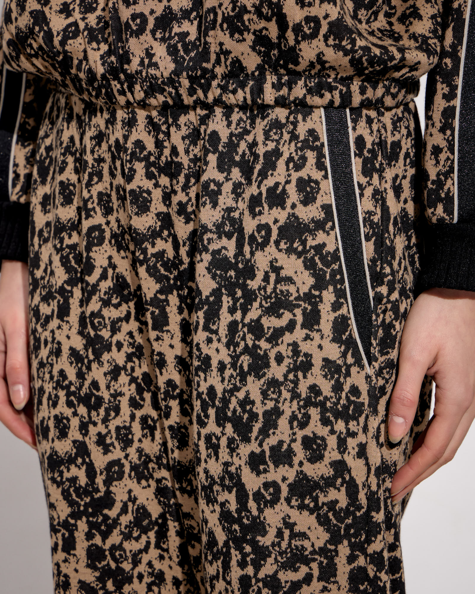 Παντελόνι λέοπαρ με λάστιχο στη μέση, πλαϊνές τσέπες με διακοσμητική τρέσα, μαλακό ύφασμα σε κανονική γραμμή