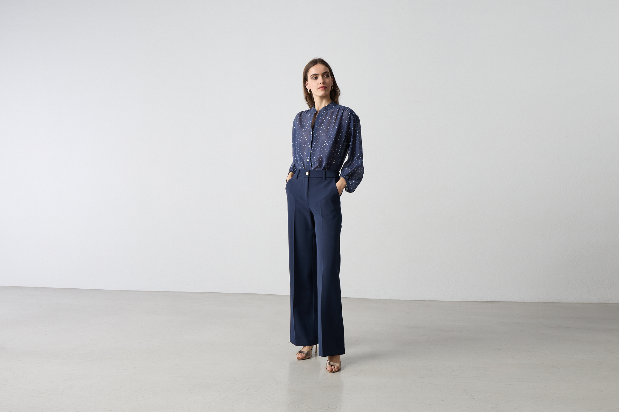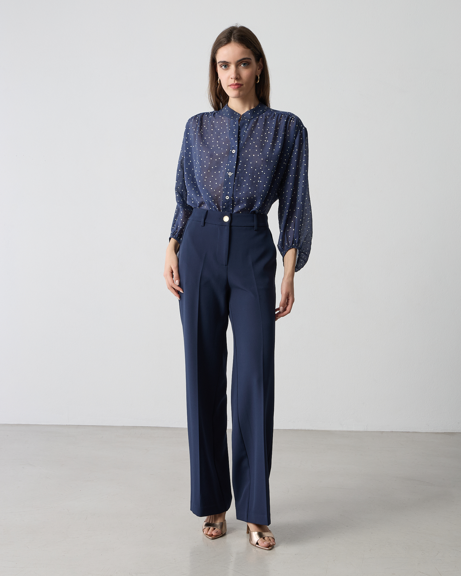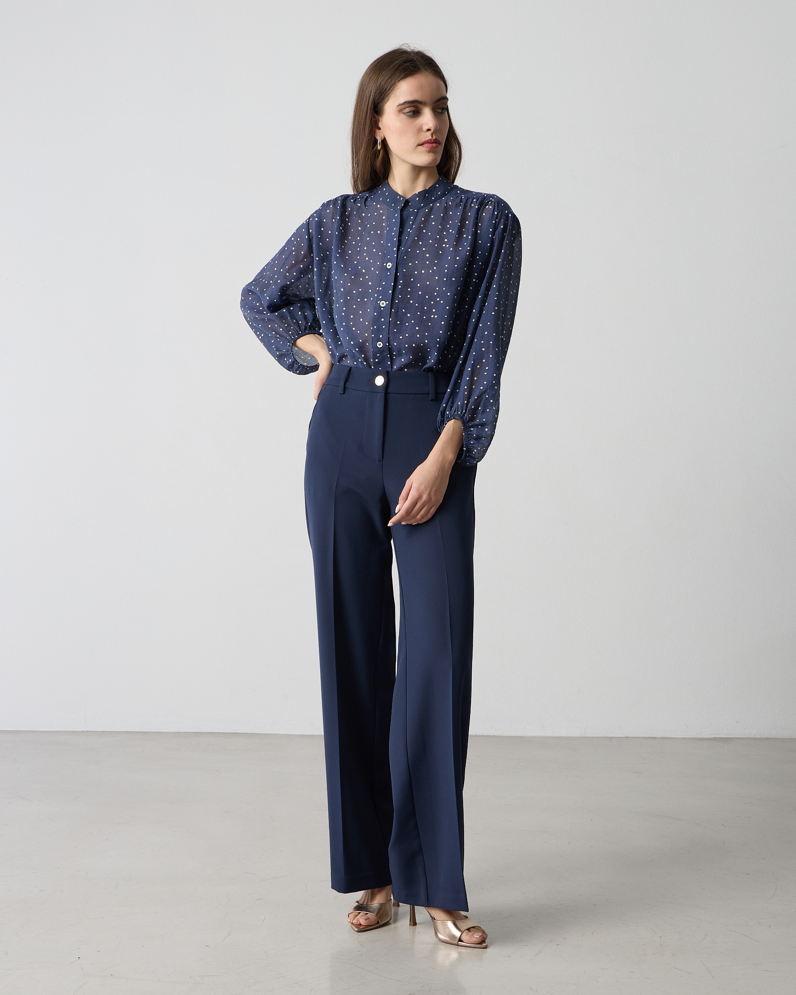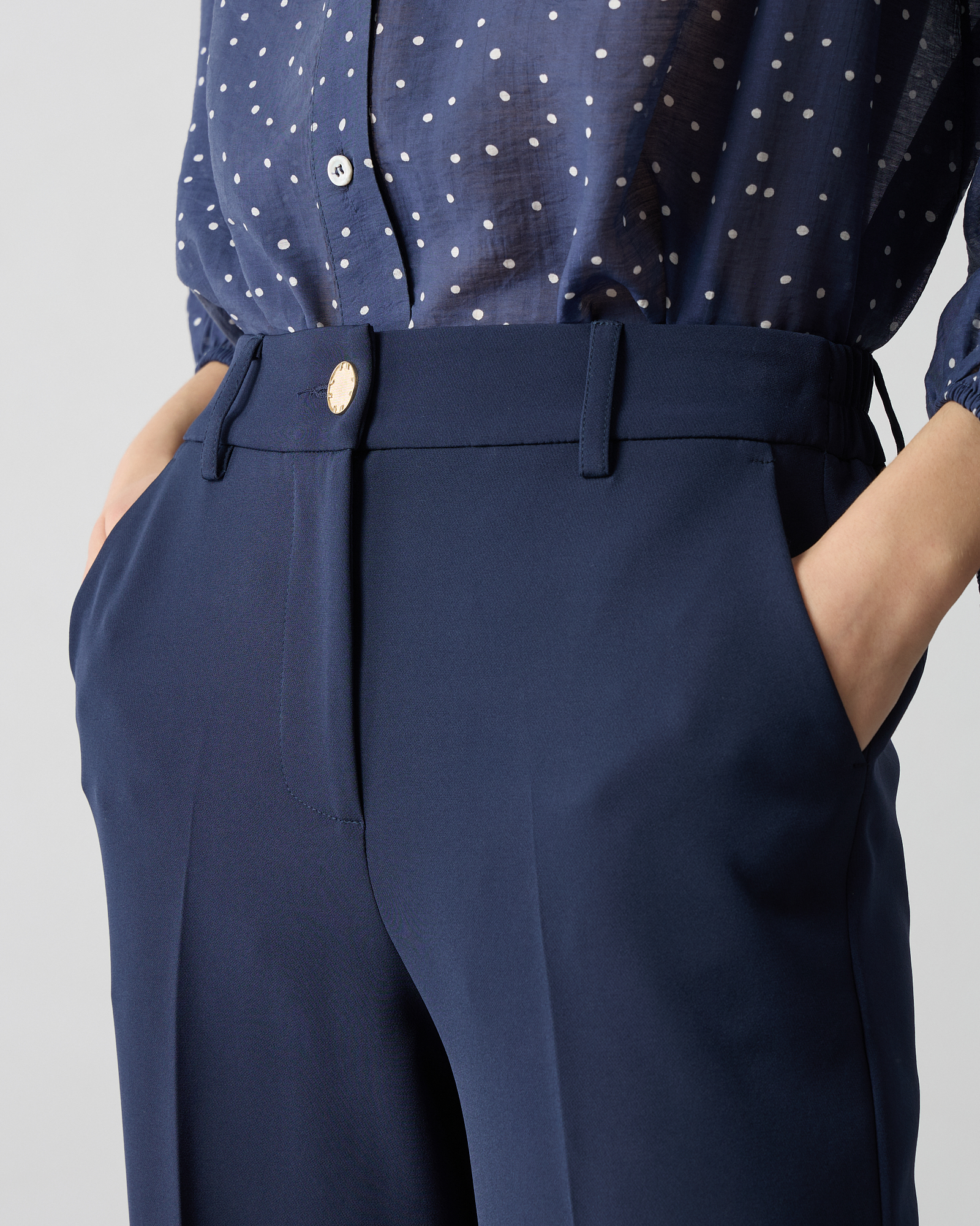 Παντελόνα ψηλόμεση με λάστιχο στη μέση, κλείσιμο μπροστά με φερμουάρ και κουμπί, τσέπες στο πλάι, κανονικη εφαρμογή