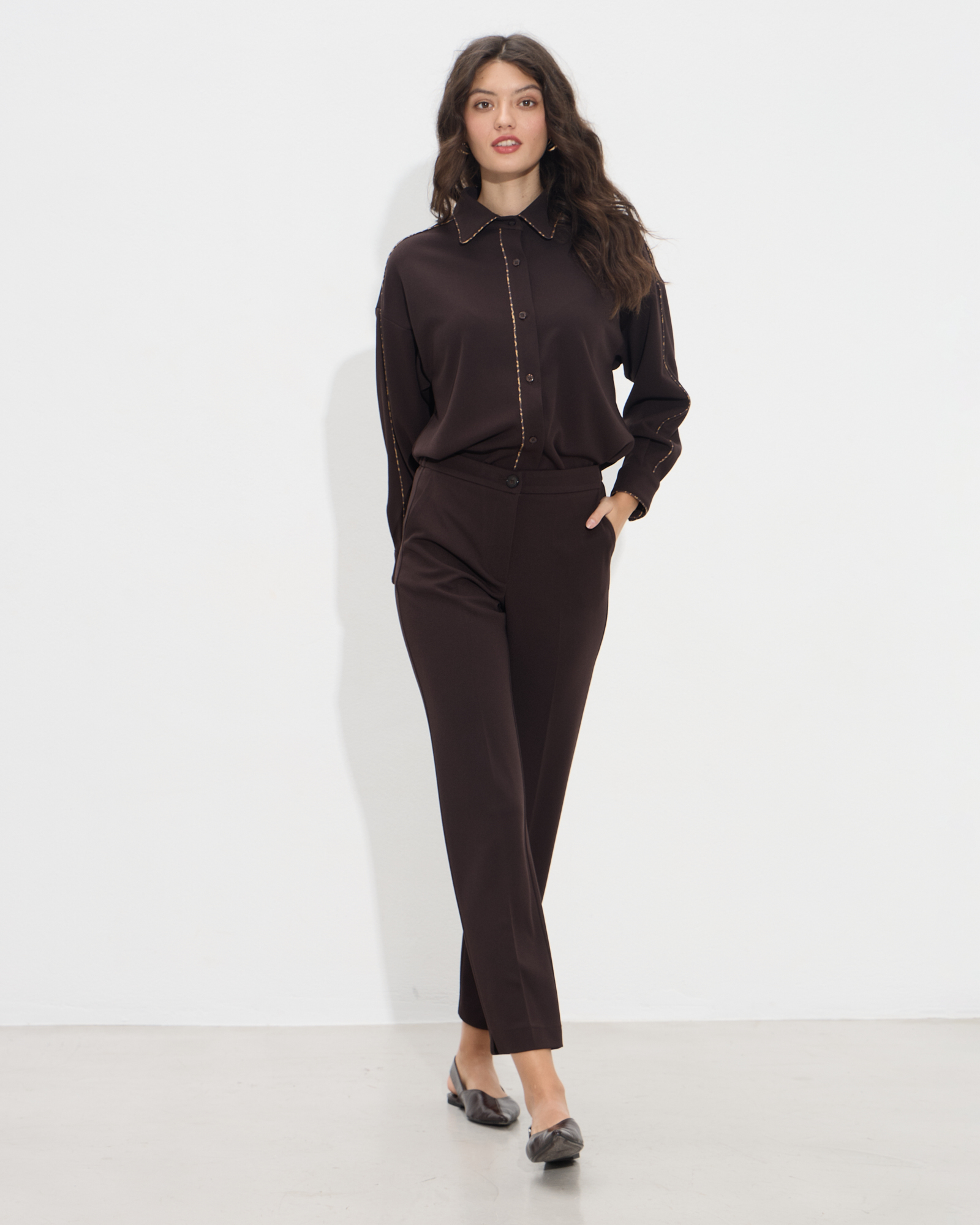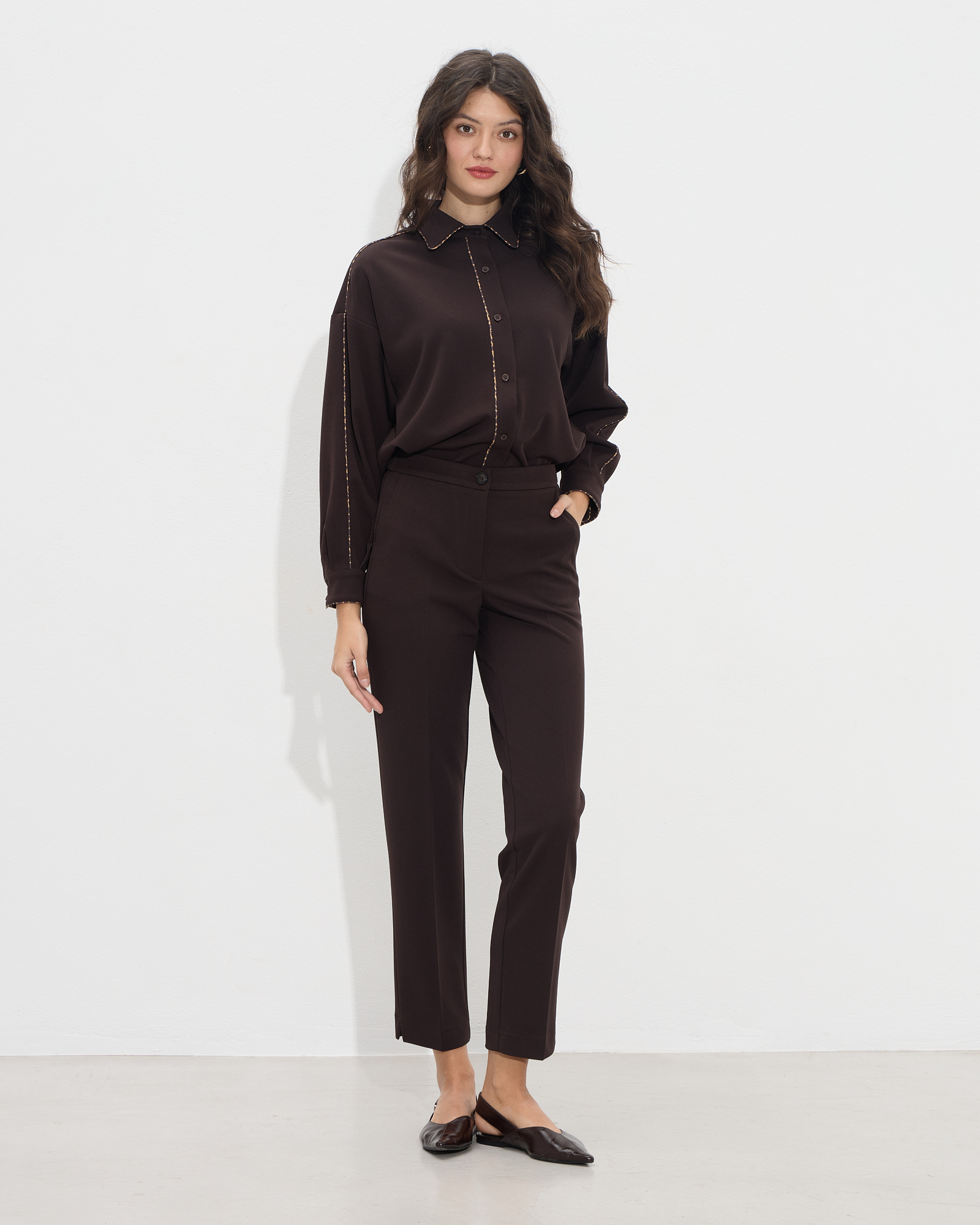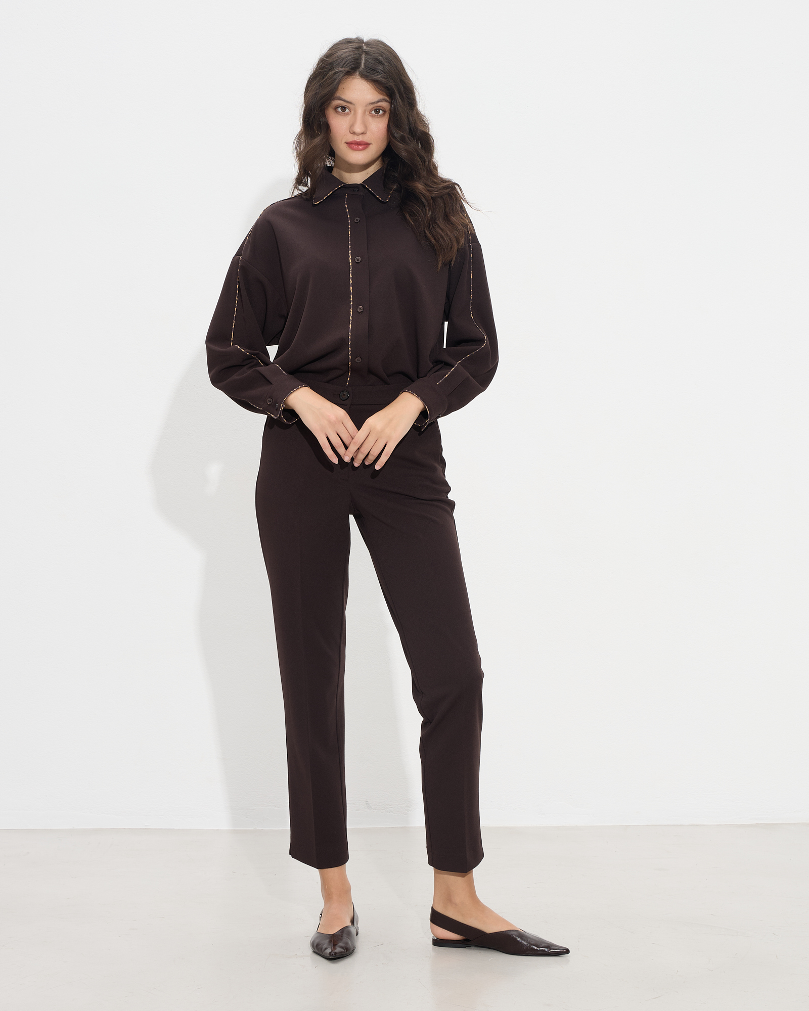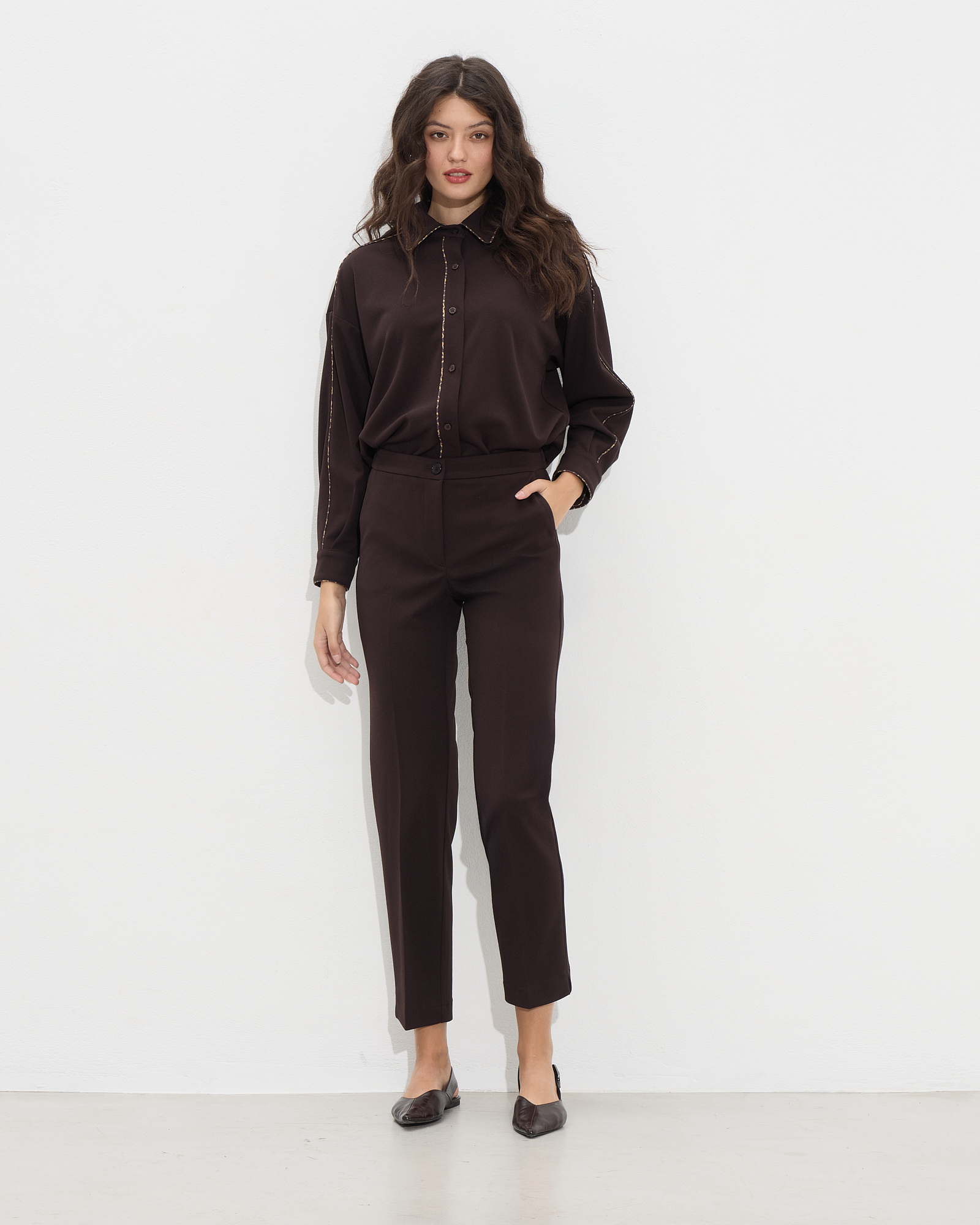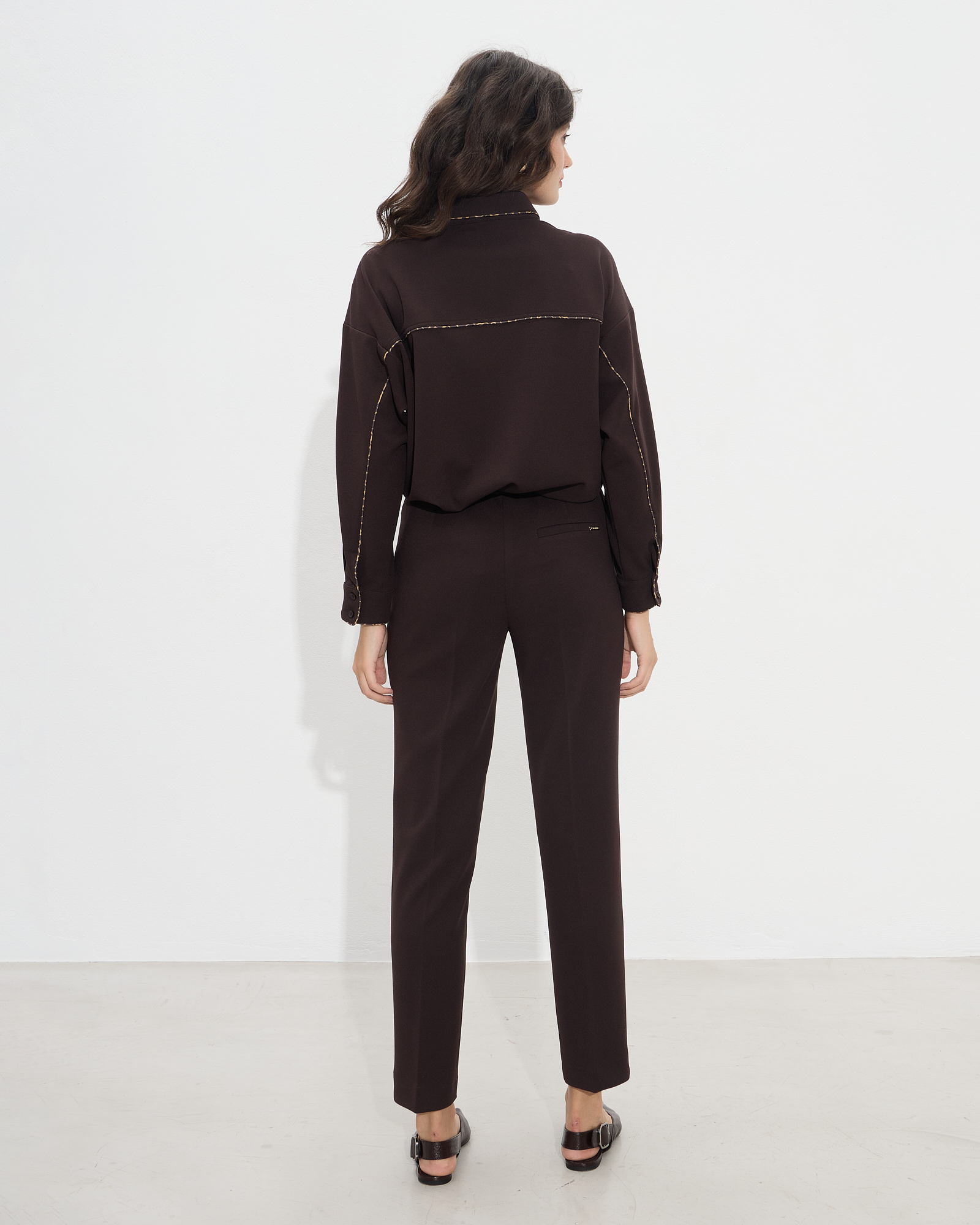 Παντελόνι cigarette ψηλόμεσο με λάστιχο στο πίσω μέρος, κλείσιμο με κουμπί και φερμουάρ μπροστά, πλαϊνές τσέπες, σε ελαστικό πανί, σε κανονική γραμμή