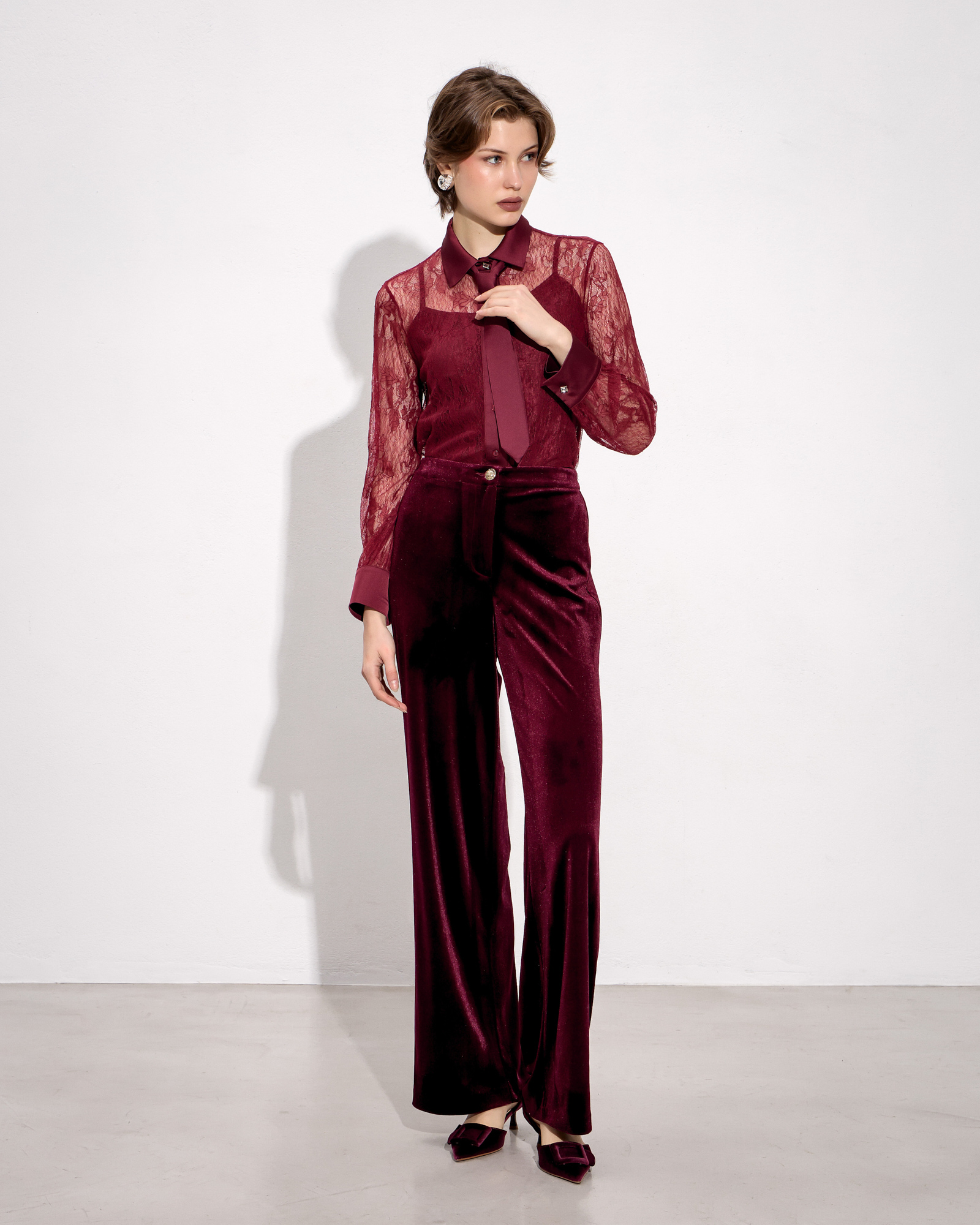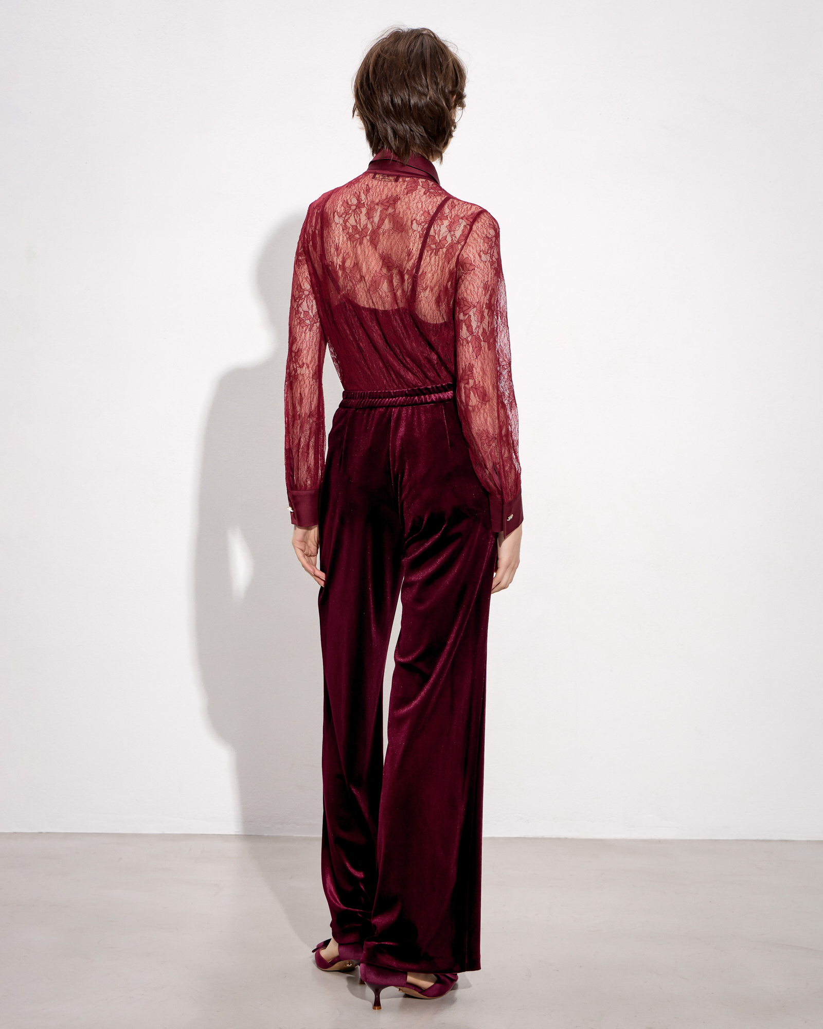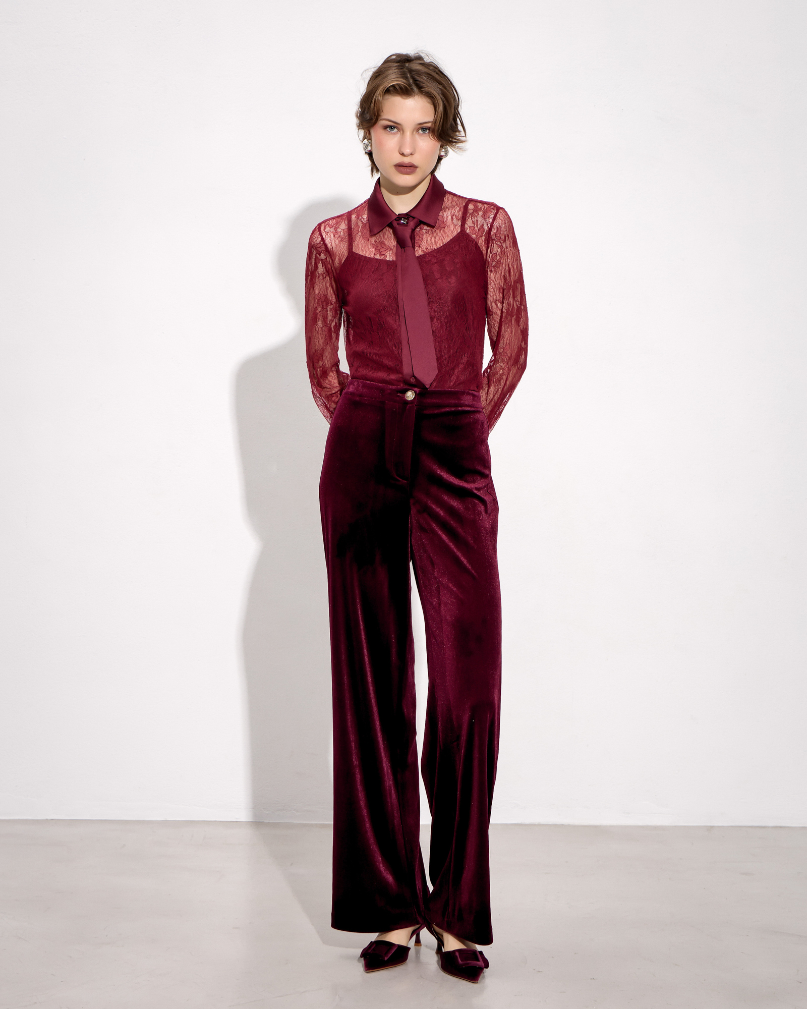 Παντελόνα wide leg βελούδο με λάστιχο στη μέση, κλείσιμο μπροστά με φερμουάρ και κουμπί, πλαϊνές τσέπες, σε κανονική εφαρμογή