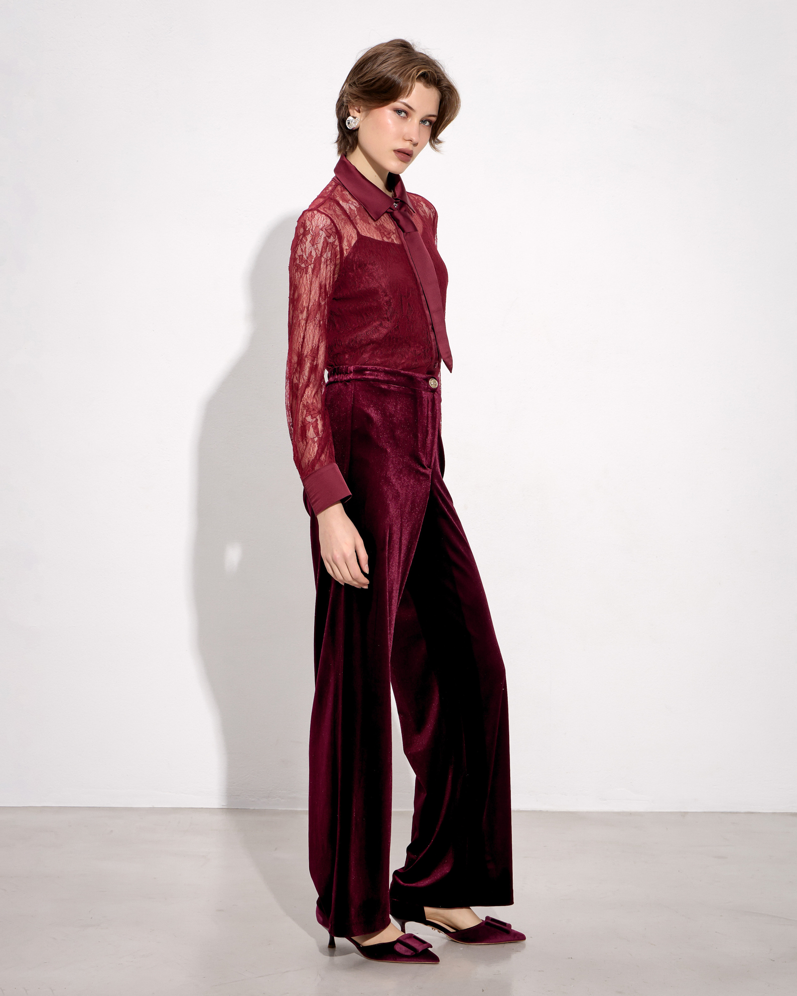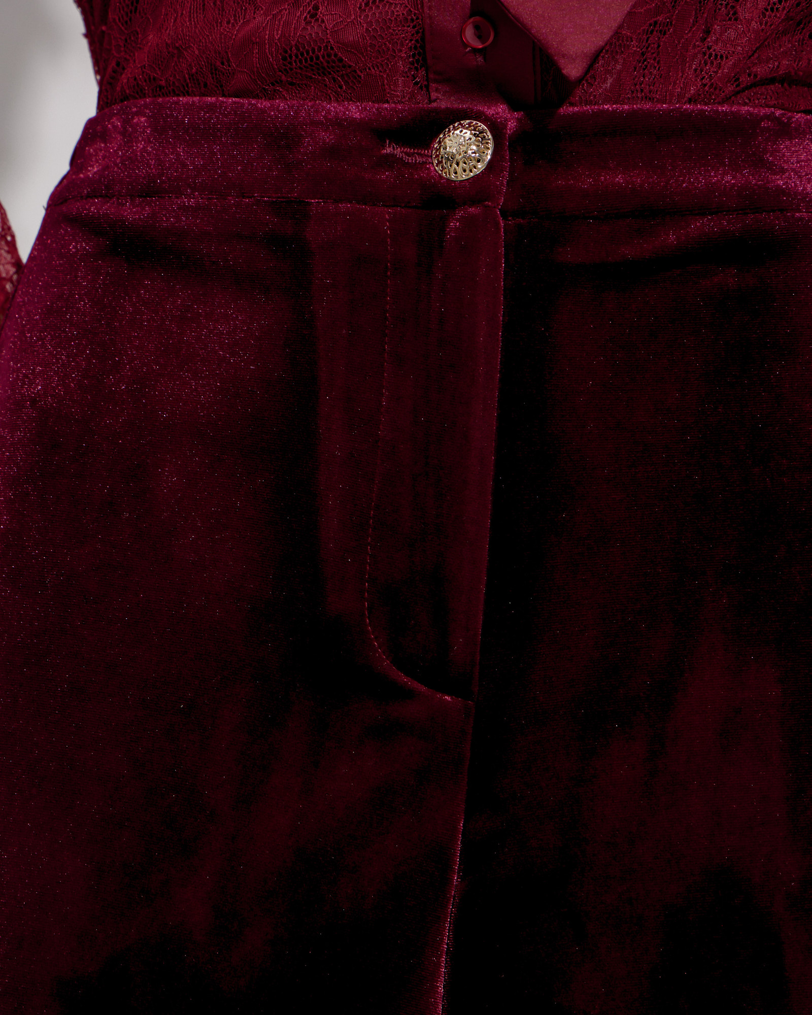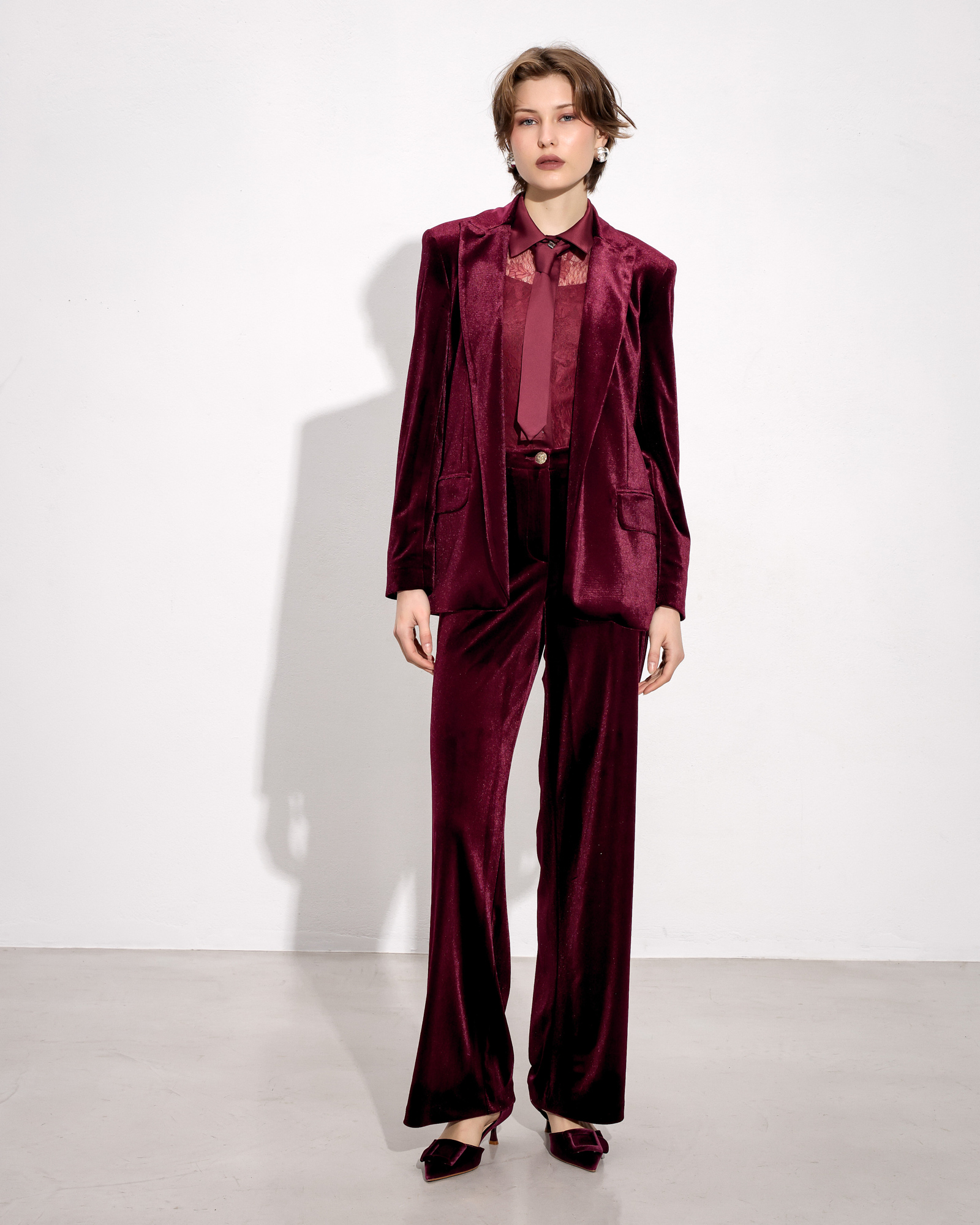 Παντελόνα wide leg βελούδο με λάστιχο στη μέση, κλείσιμο μπροστά με φερμουάρ και κουμπί, πλαϊνές τσέπες, σε κανονική εφαρμογή
