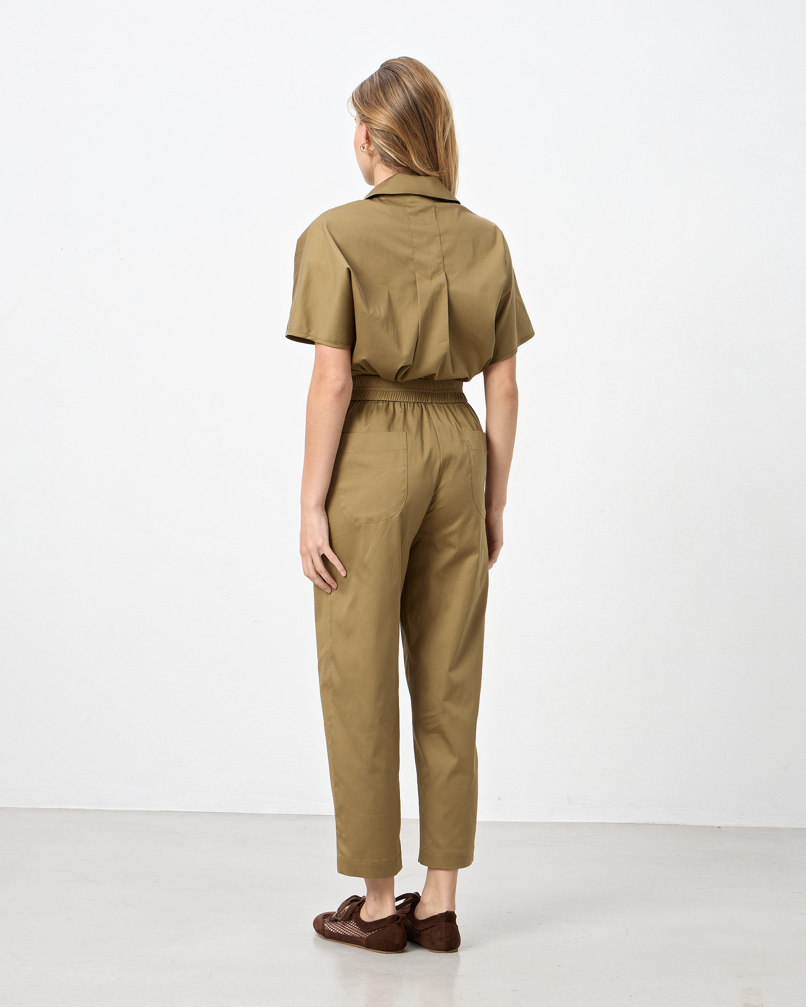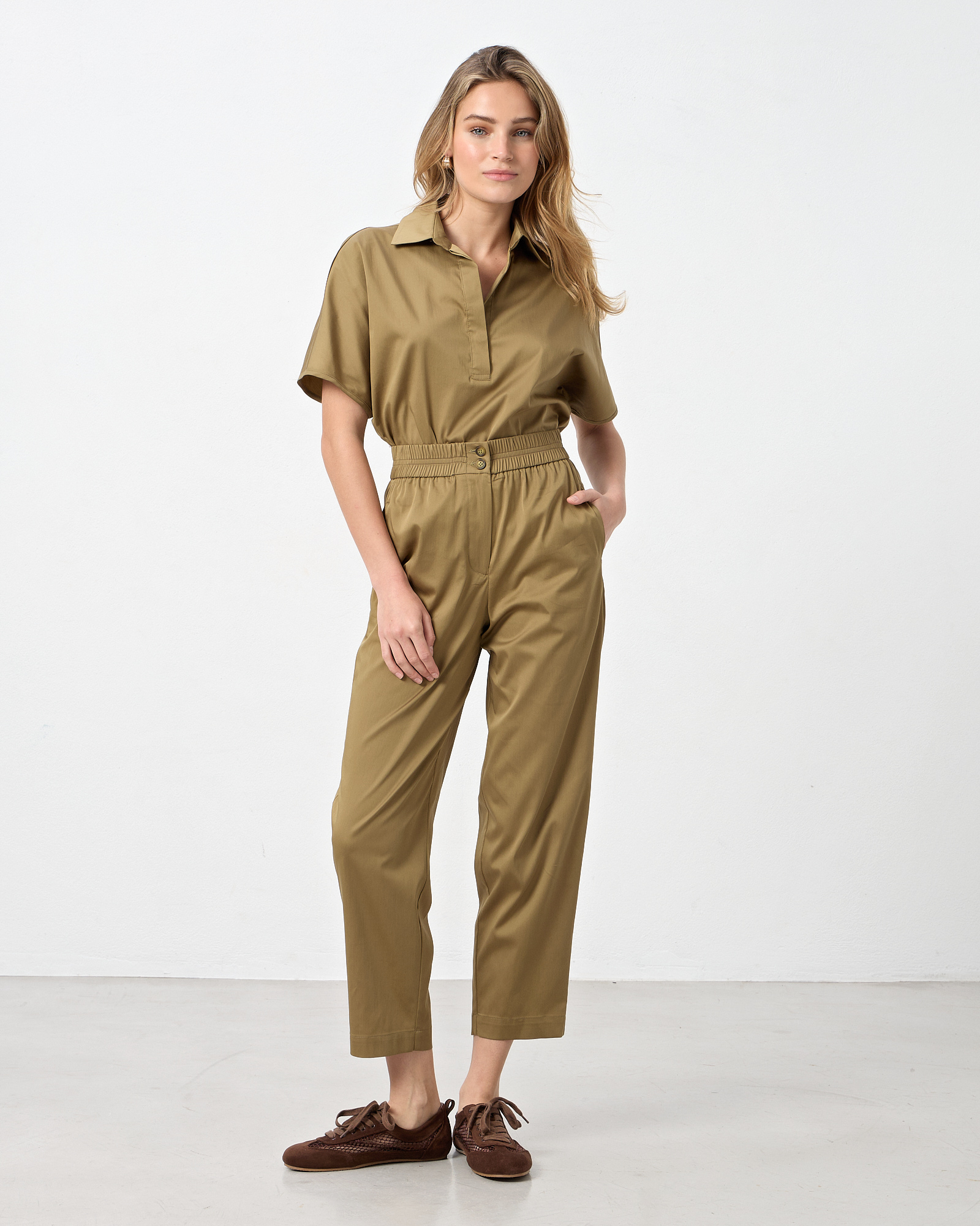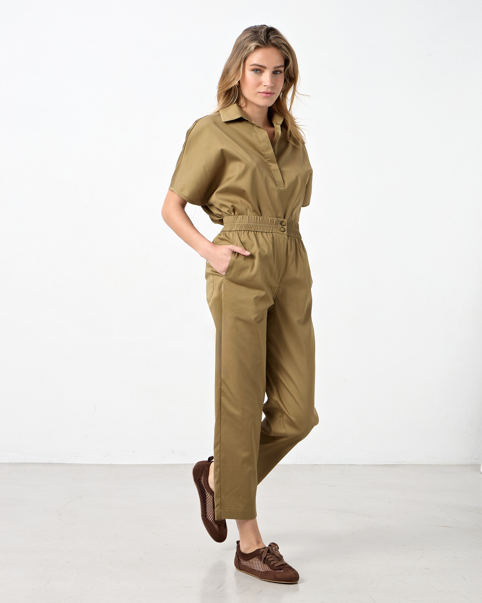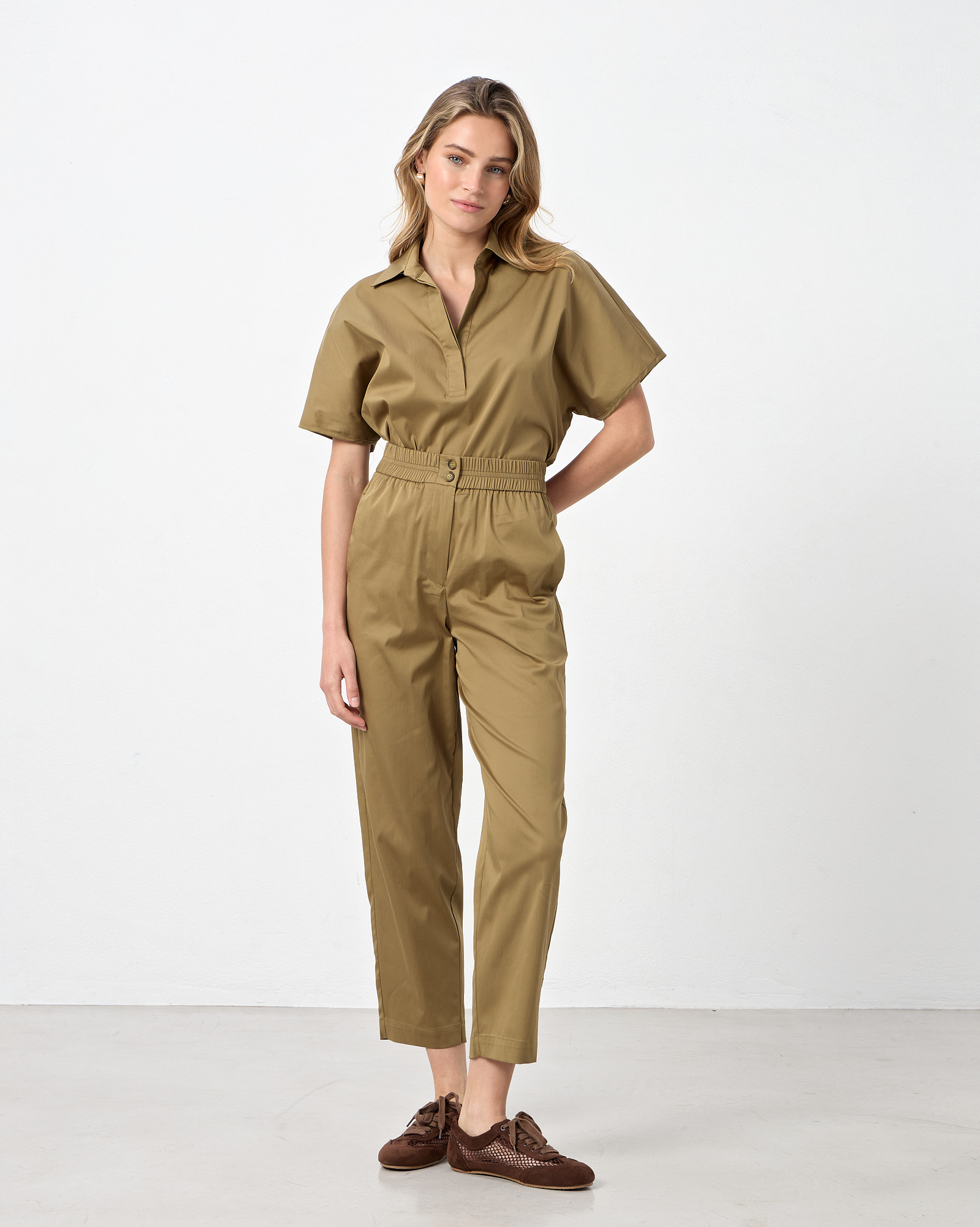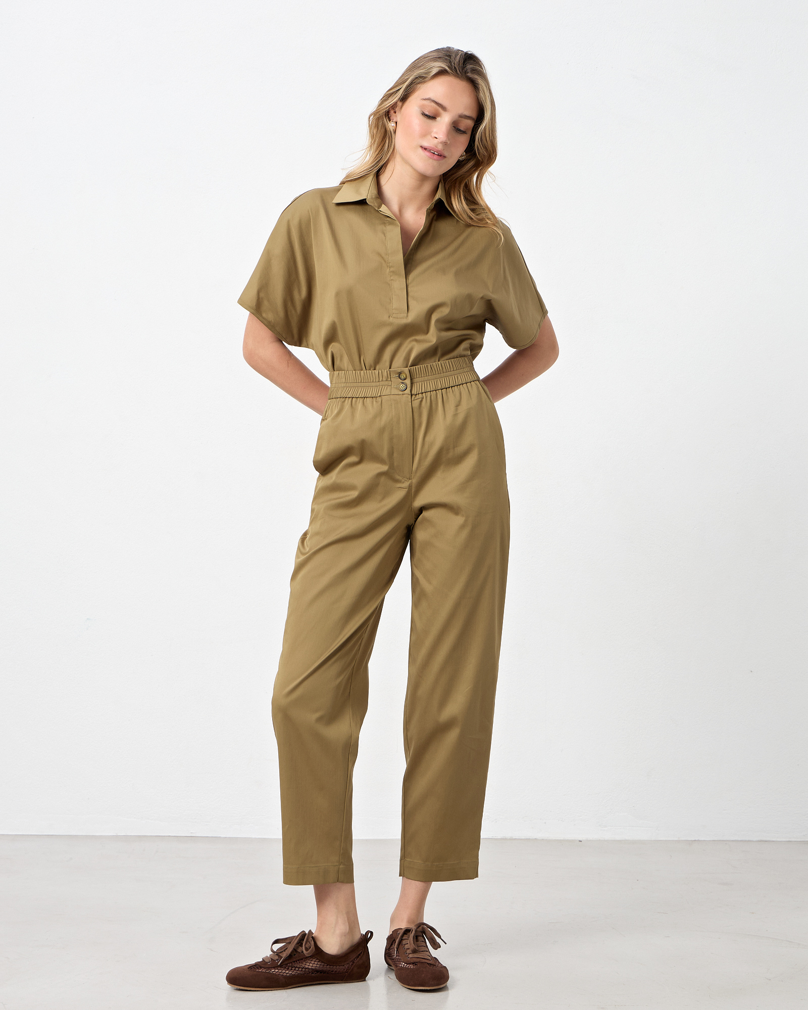 Παντελόνι ποπλίνα ψηλόμεσο με ελαστική μέση, κλείσιμο μπροατά με φερμουάρ και κουμπιά, πλαϊνές τσέπες, εξωτερικές πίσω τσέπες, σε κανονική εφαρμογή