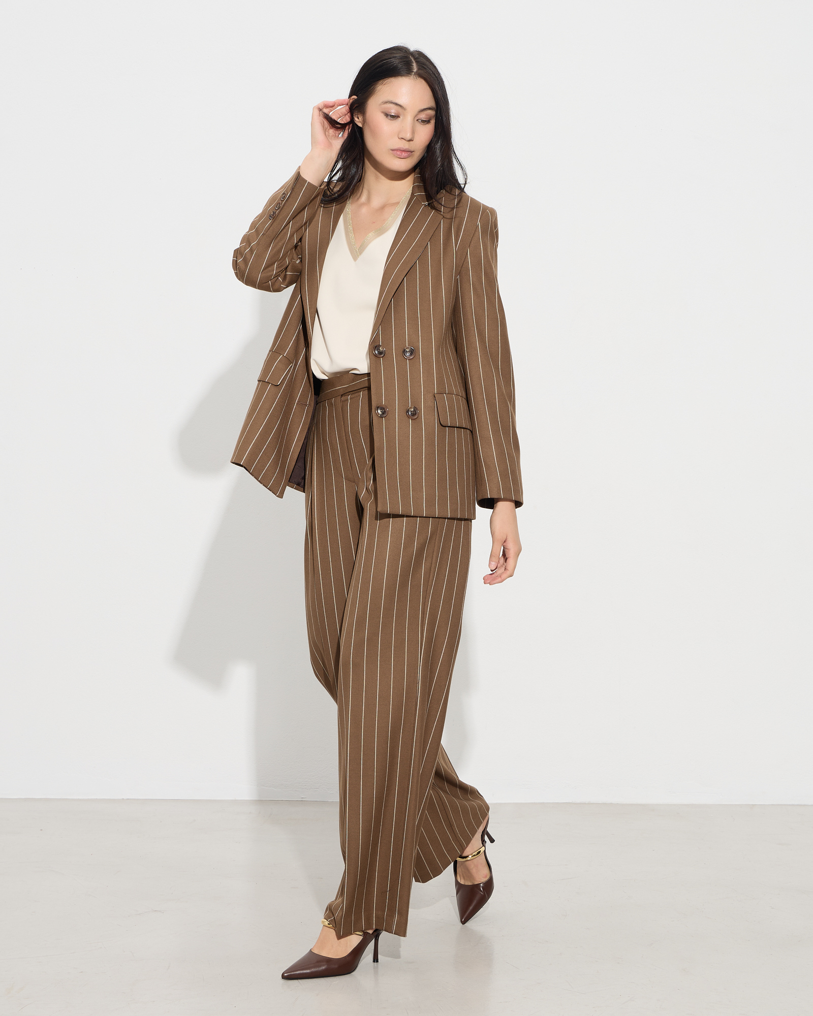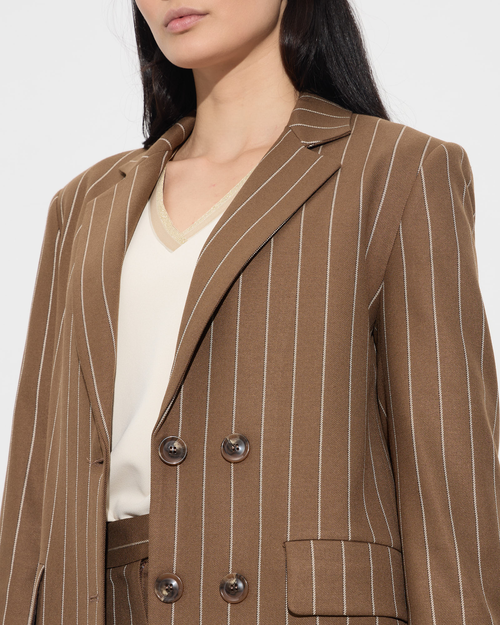 Σακάκι μπλέιζερ ριγέ, γιακάς με πέτο, σταυρωτό κούμπωμα, τσέπες με καπάκι, μακρύ μανίκι με κουμπιά στο τελείωμα, σε άνετη γραμμή