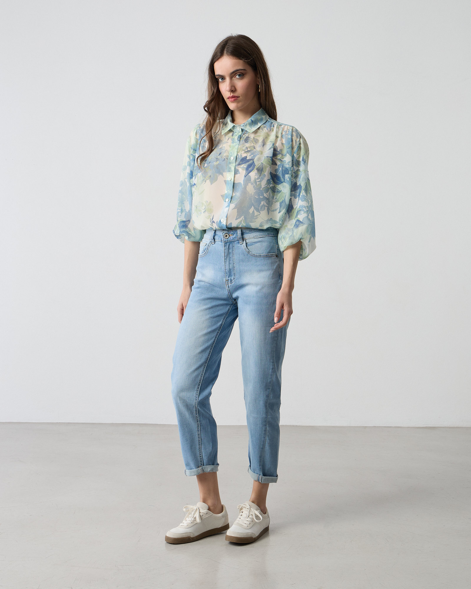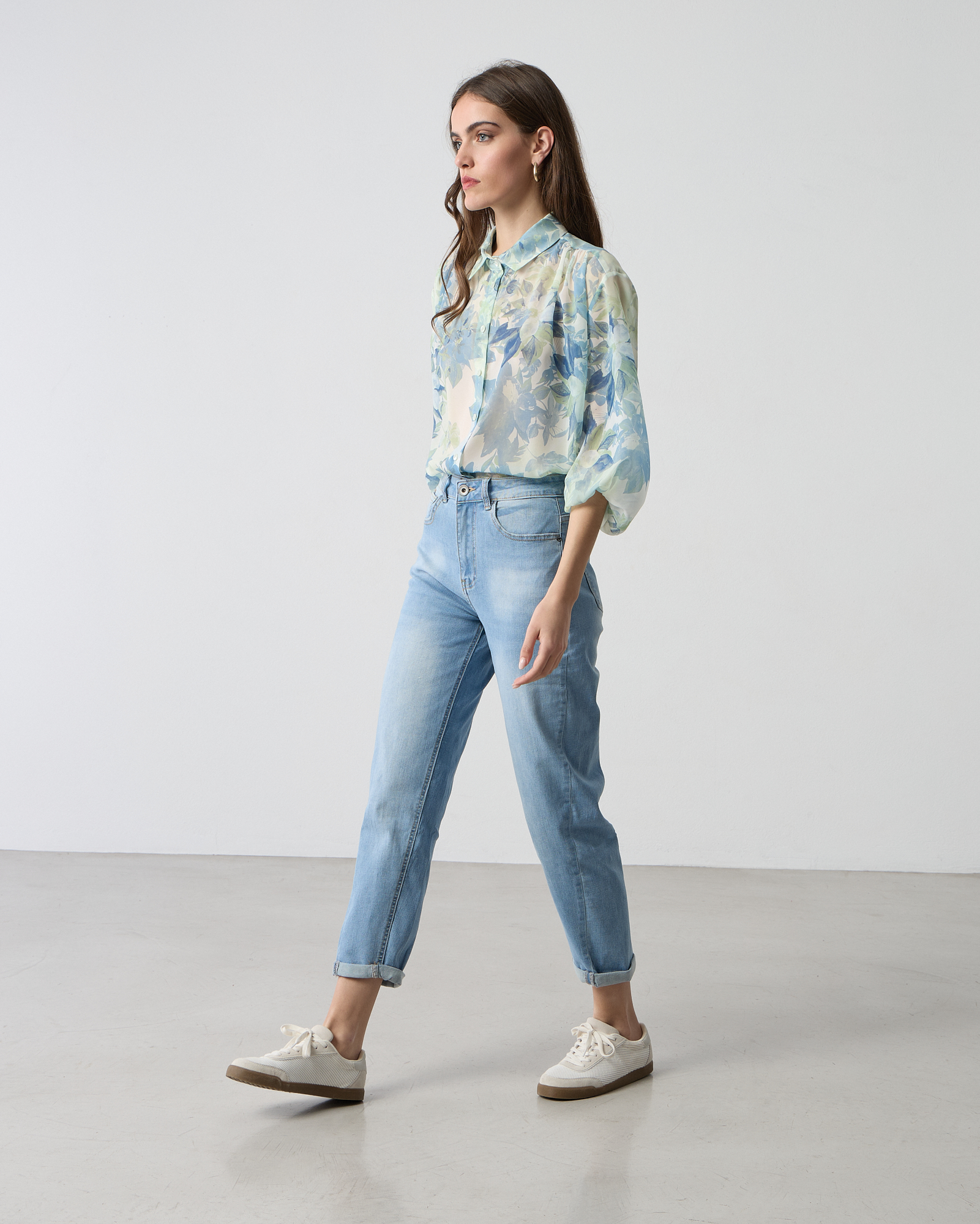 Τζιν ψηλόμεσο με τσέπες, κλείσιμο με φερμουάρ και κουμπί, σε κανονική γραμμή