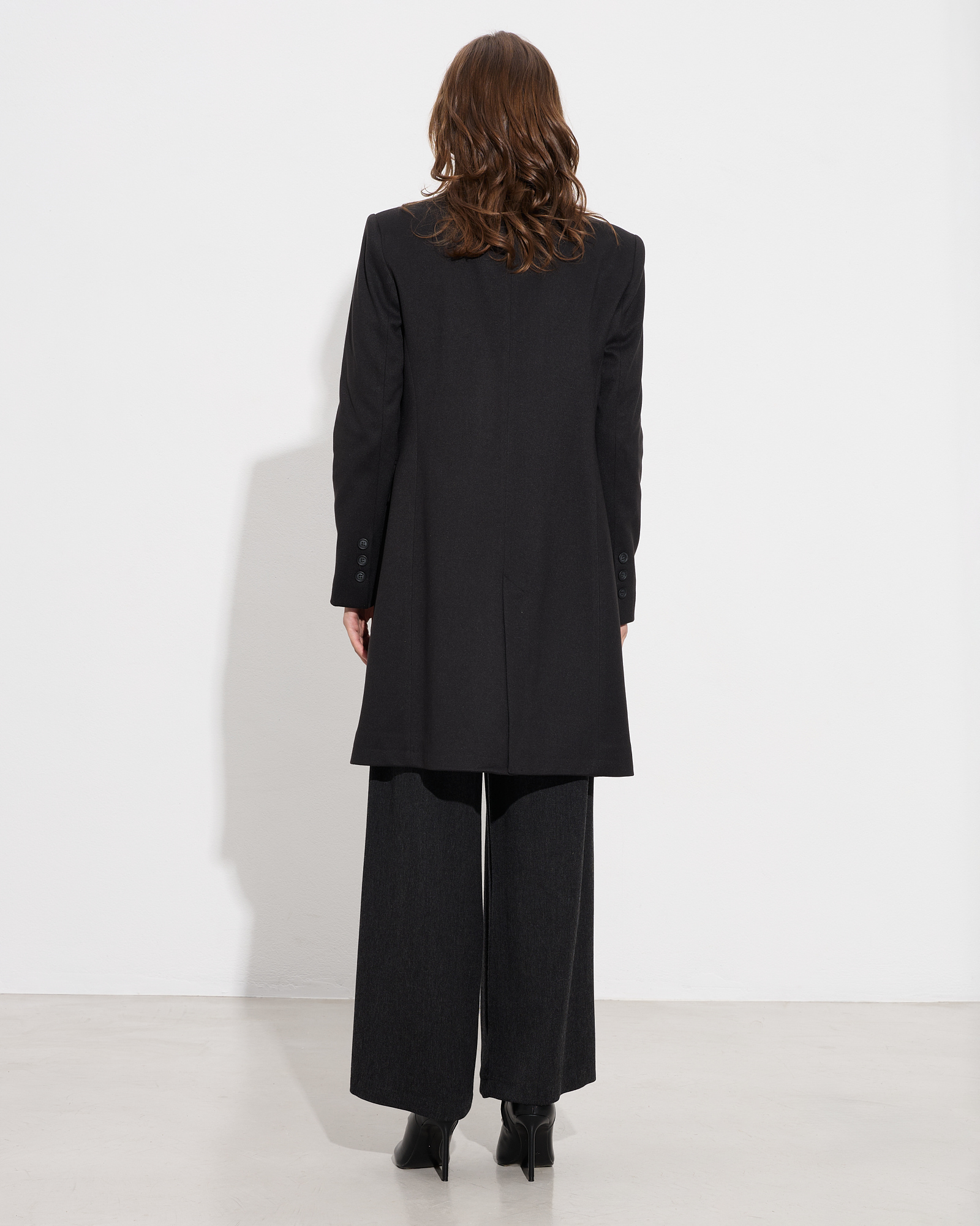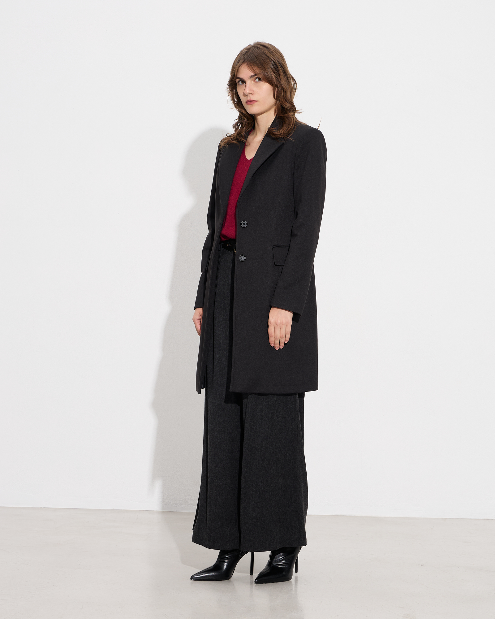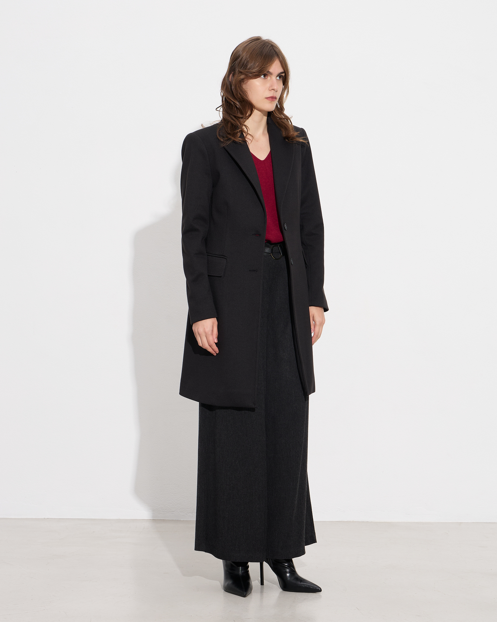 Παλτό με γιακά με πέτο, μακρύ μανίκι, βάτες στους ώμους, πλαϊνές τσέπες με καπάκι, κλείσιμο μπροστά με κουμπιά, άνοιγμα στο κάτω μέρος πίσω, εσωερική φόδρα, σε κανονική γραμμή
