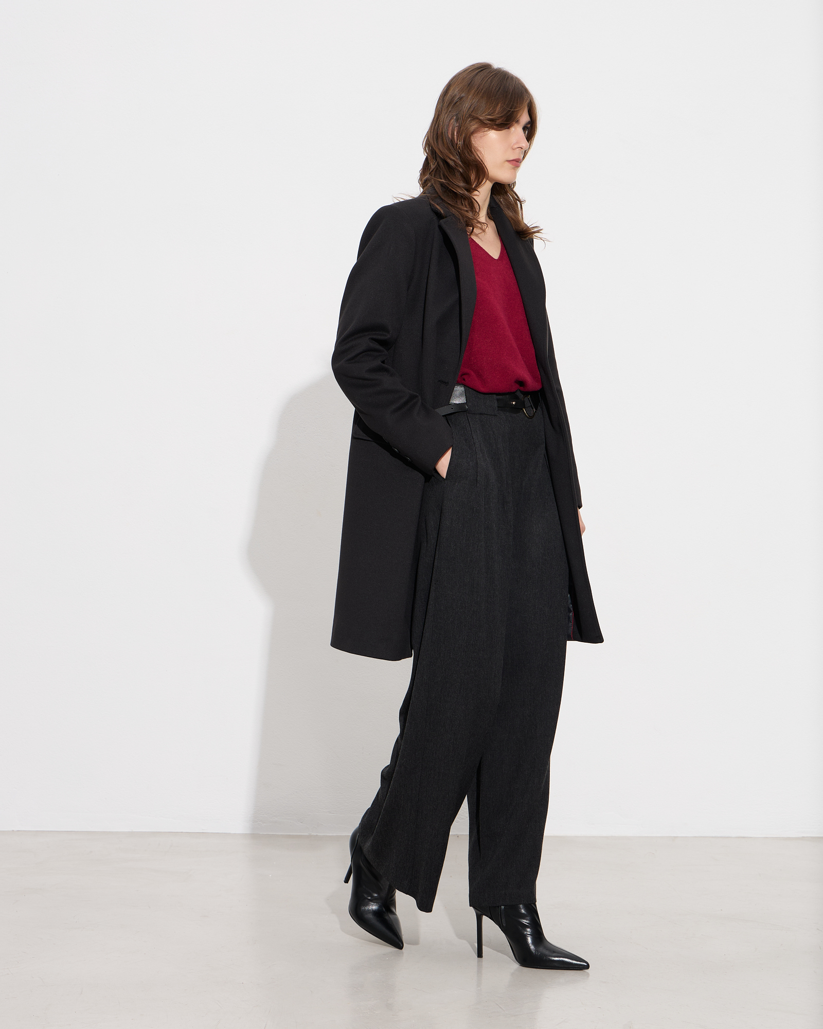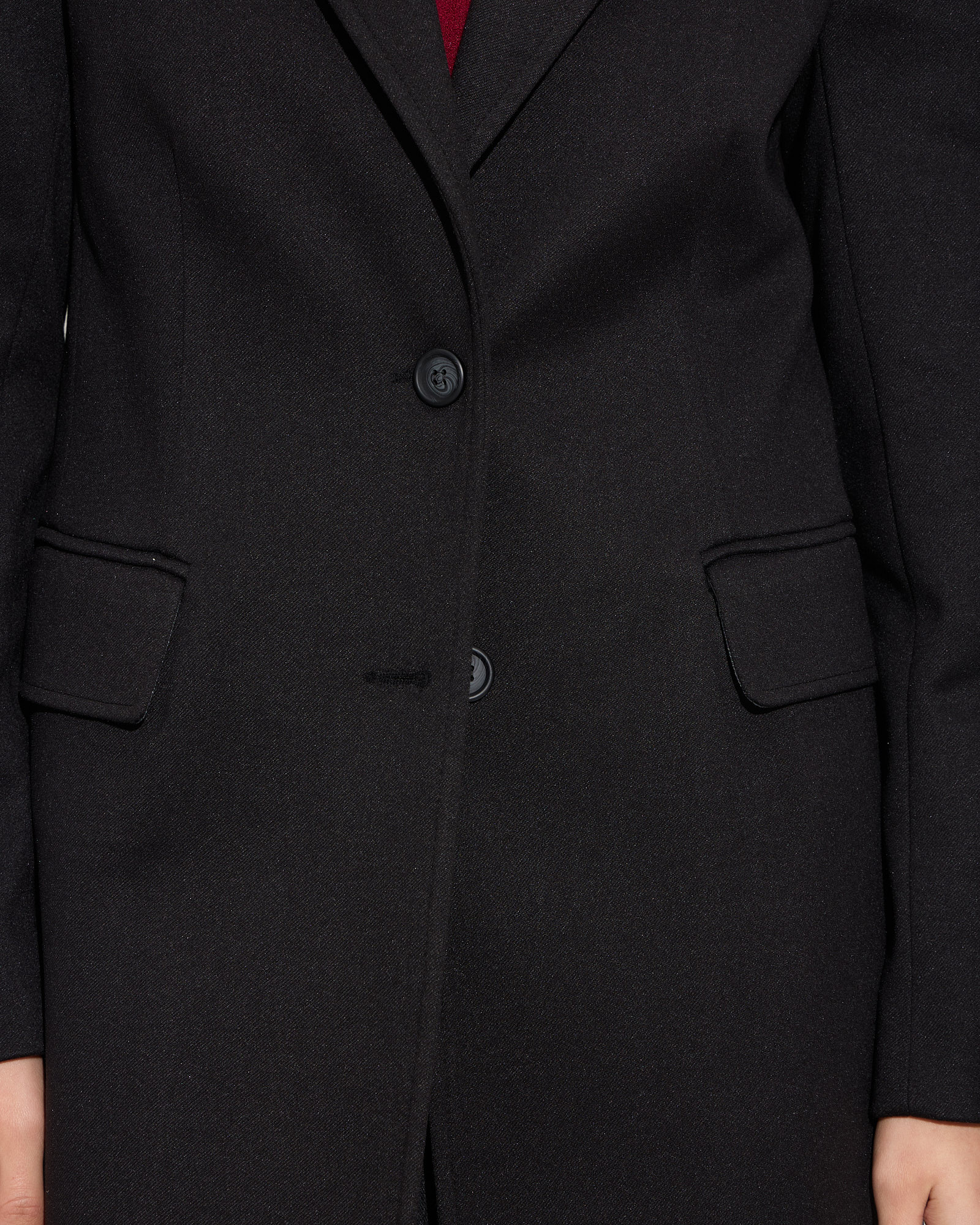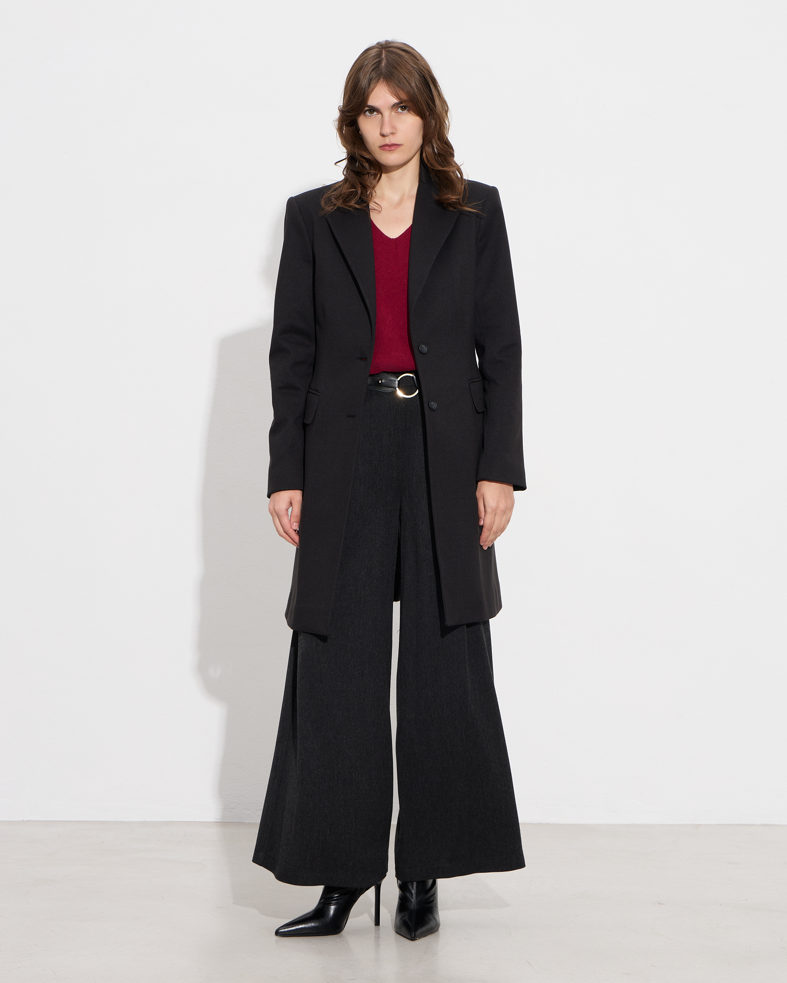 Παλτό με γιακά με πέτο, μακρύ μανίκι, βάτες στους ώμους, πλαϊνές τσέπες με καπάκι, κλείσιμο μπροστά με κουμπιά, άνοιγμα στο κάτω μέρος πίσω, εσωερική φόδρα, σε κανονική γραμμή