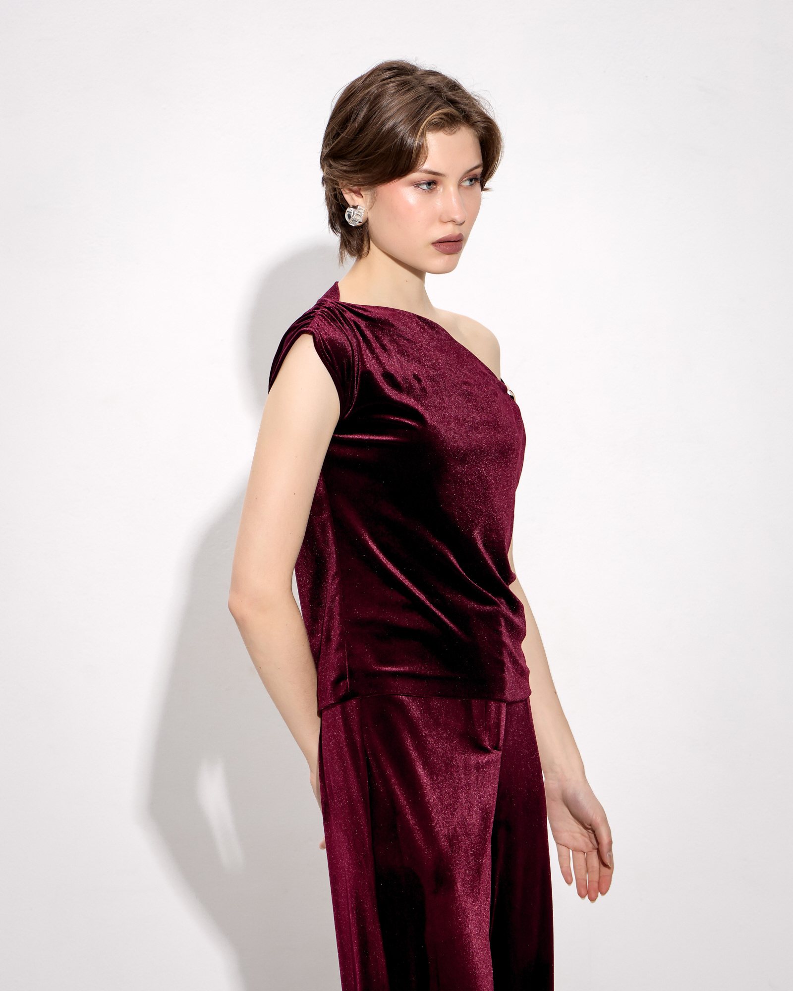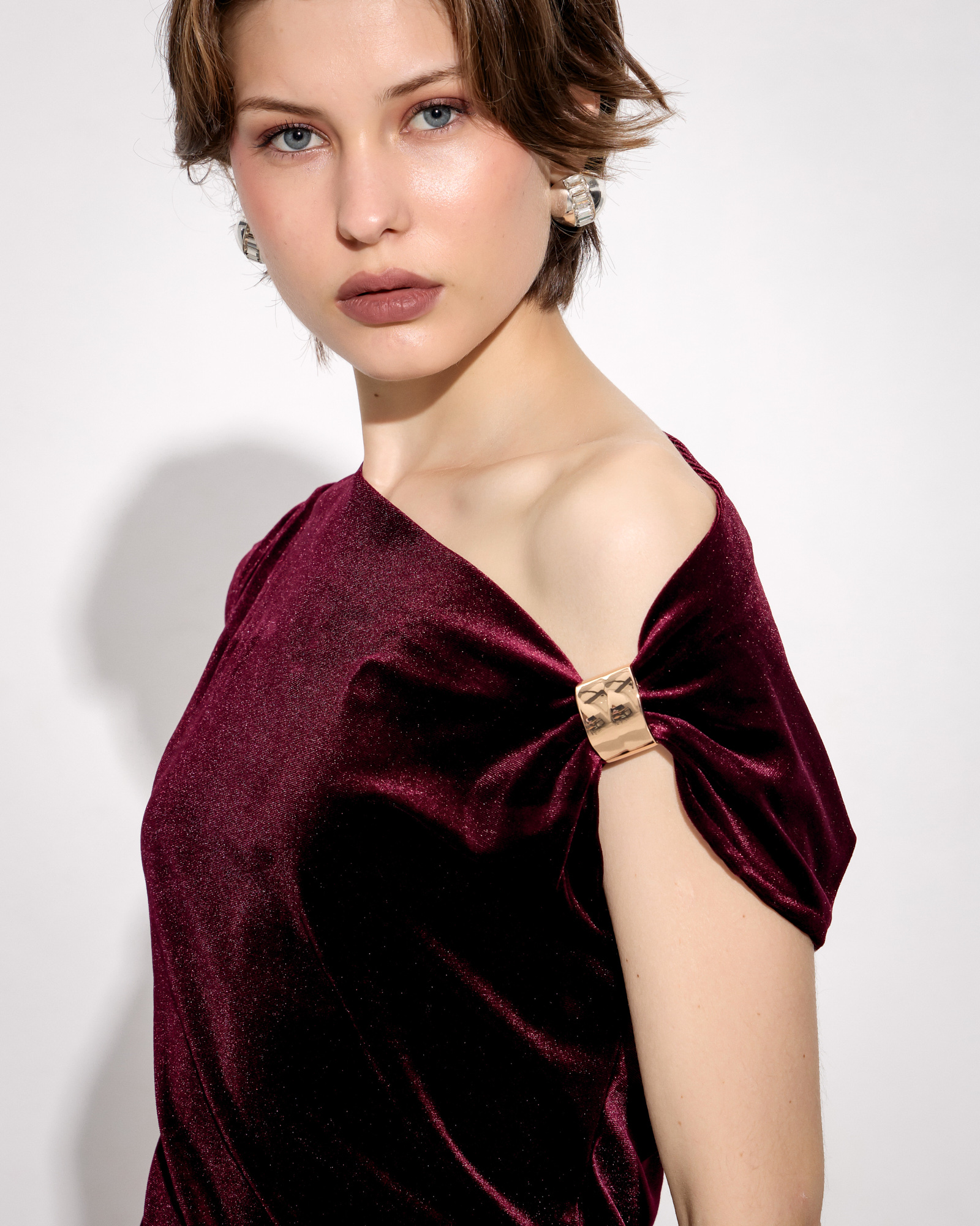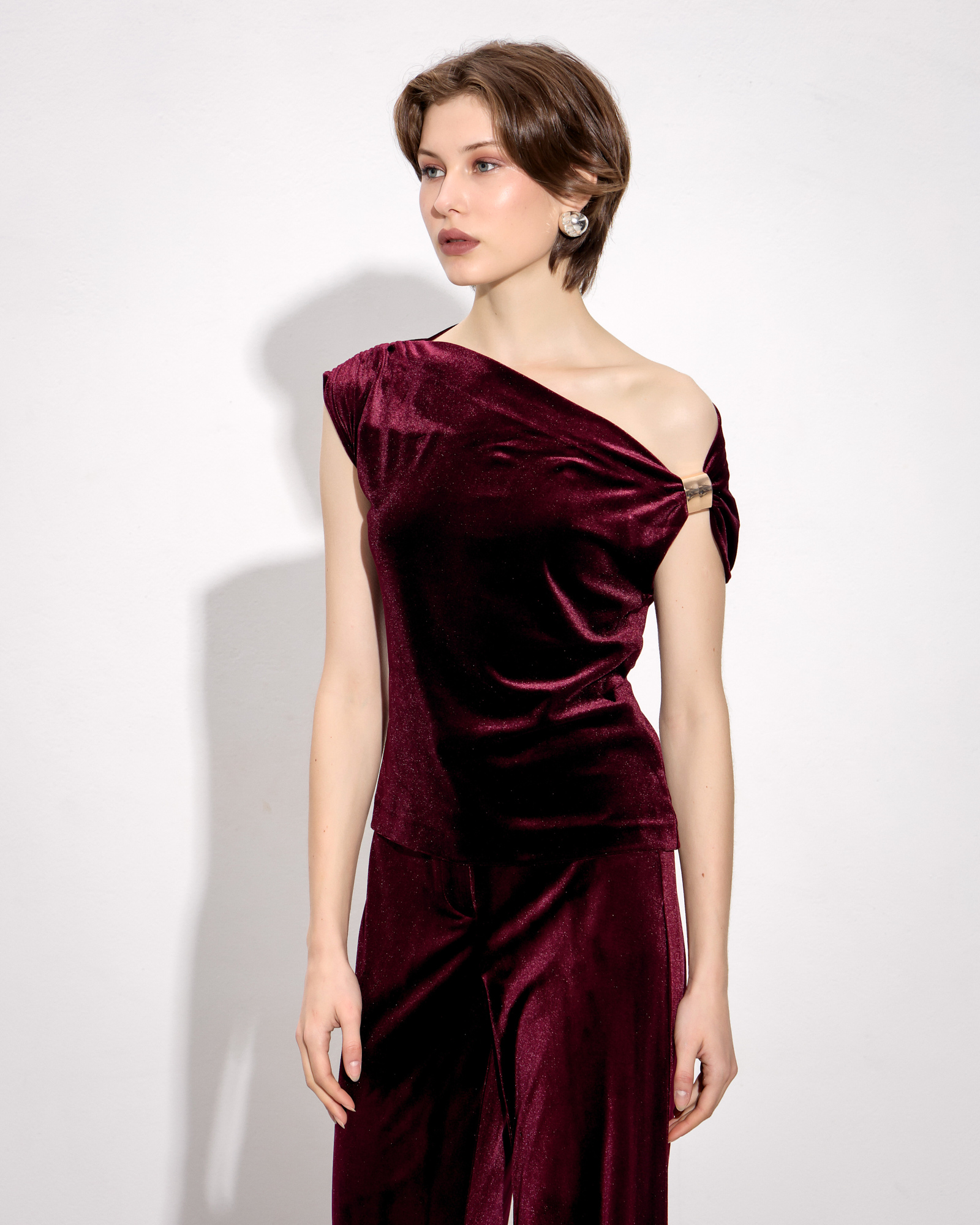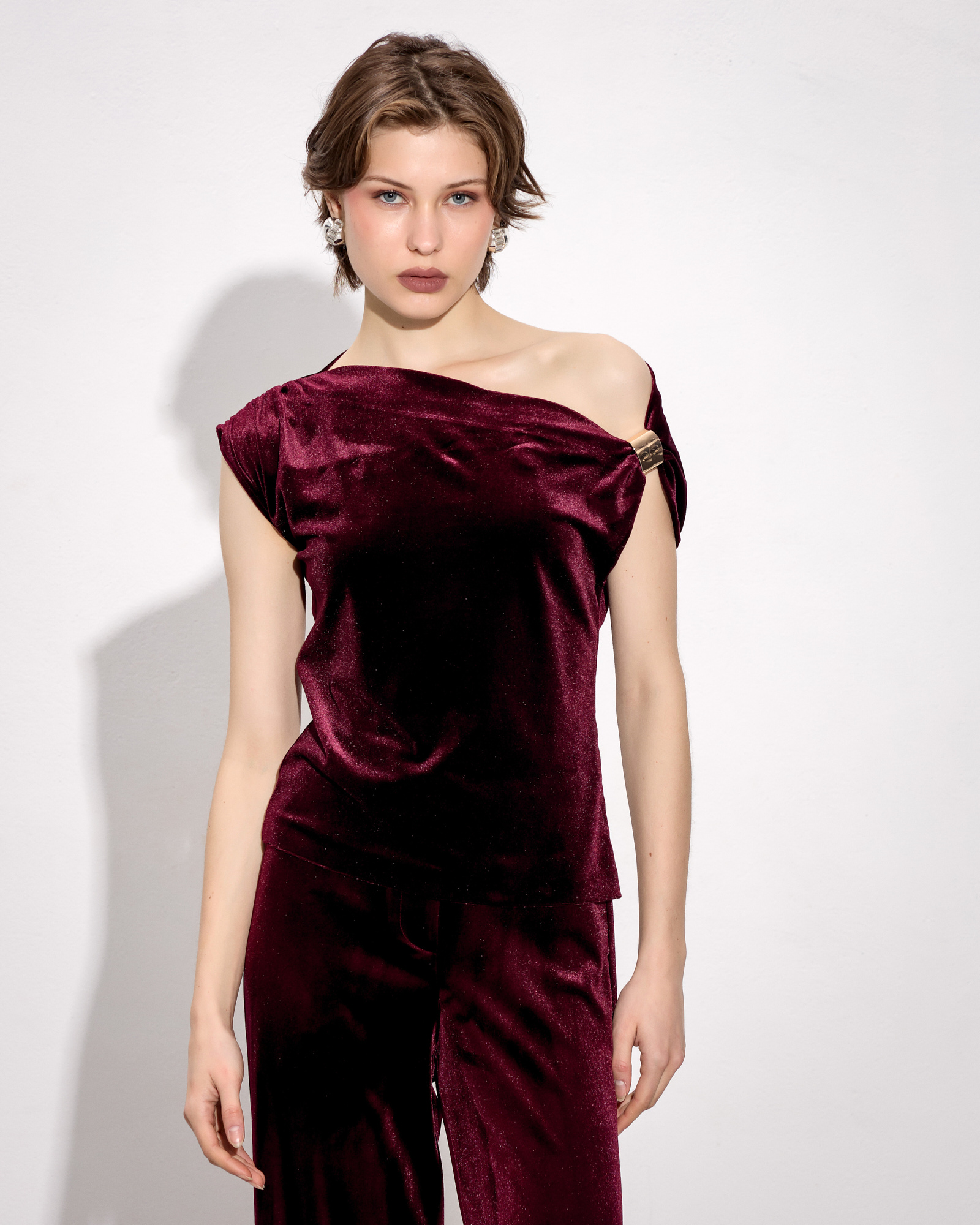 Μπλούζα βελούδο αμάνικη, ασύμμετρο ντεκολτέ με λεπτομέρεια μεταλλικό απλικέ στον ώμο, σε κανονική εφαρμογή
