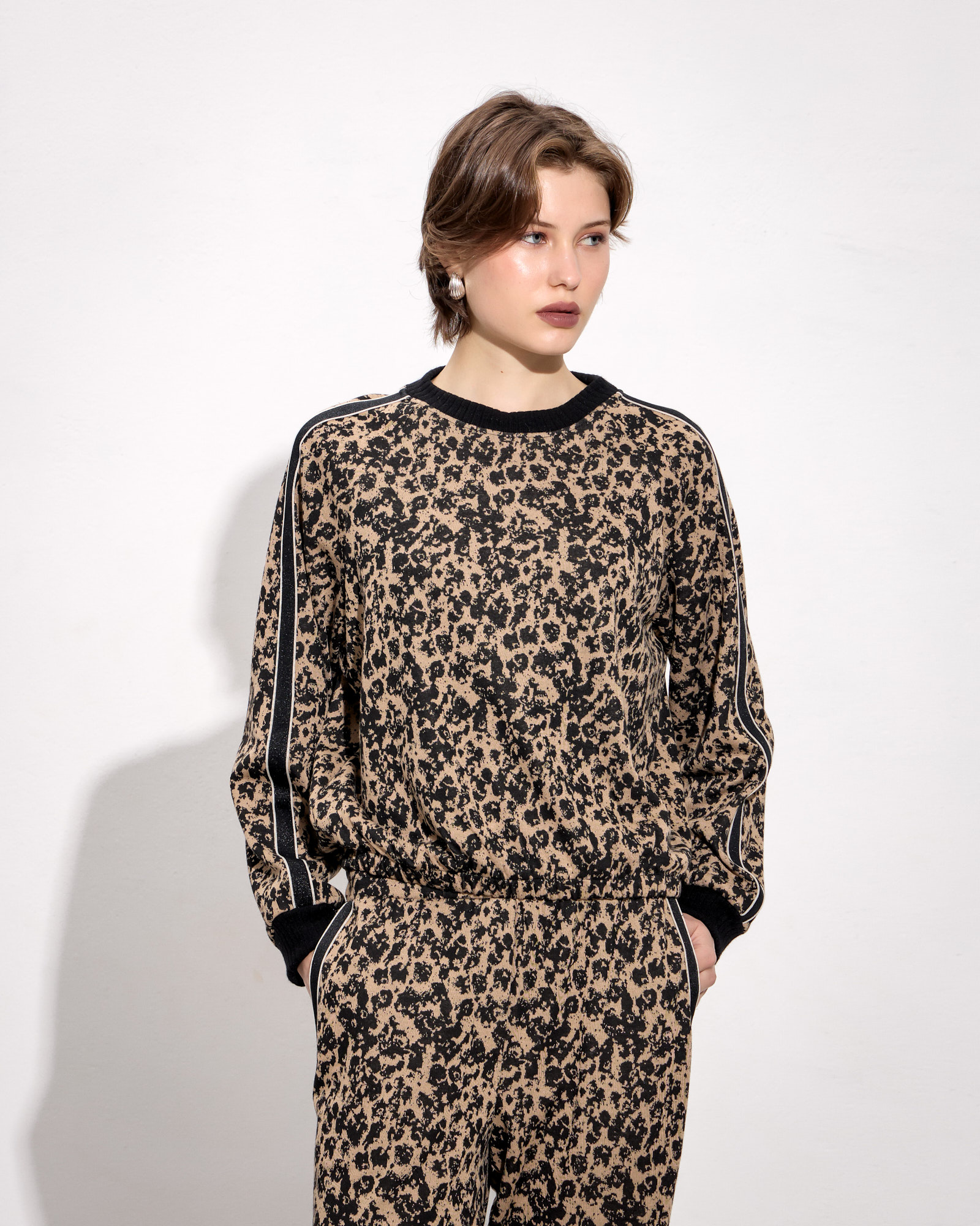 Μπλούζα λέοπαρ με στρογγυλή λαιμόκοψη, μακρύ μανίκι με λεπτομέρεια τρέσας,μαλακό ύφασμα, κανονική εφαρμογή