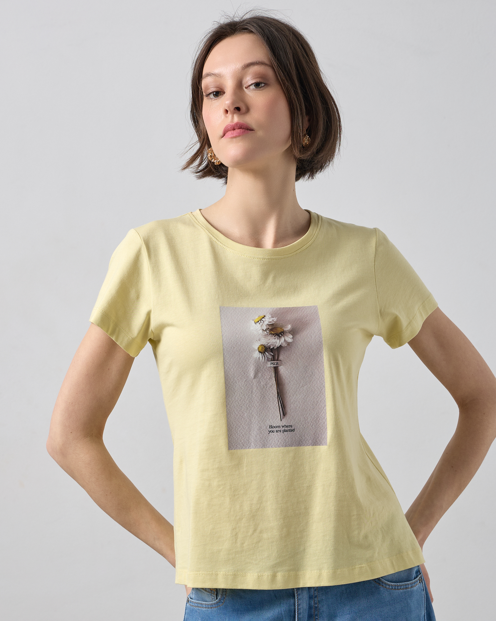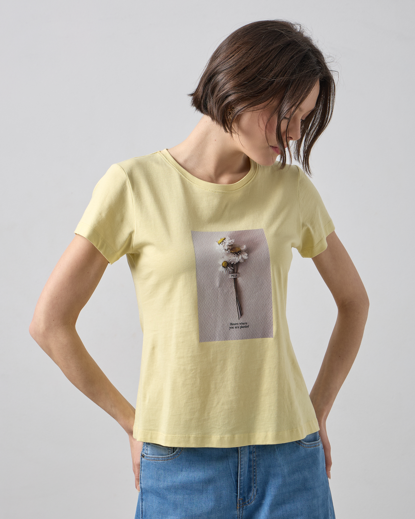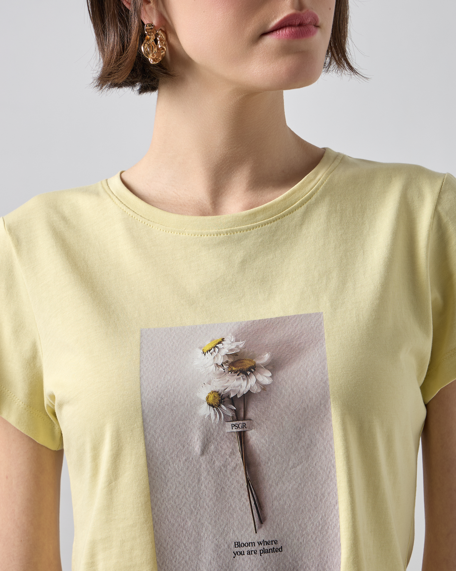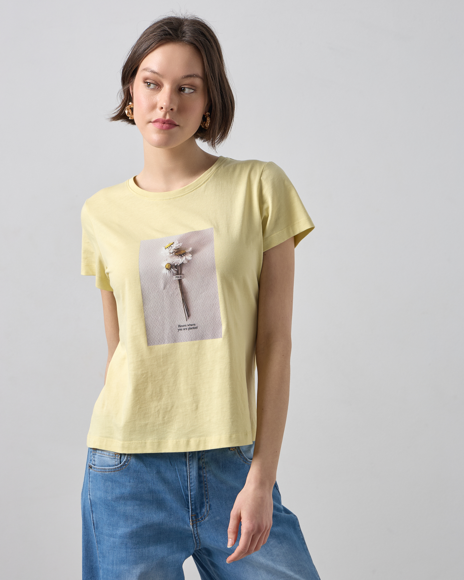 Μπλούζα κοντομάνικη με στρογγυλή λαιμόκοψη, στάμπα με λουλούδι σε βαμβακερό ύφασμα, σε κανονική γραμμή