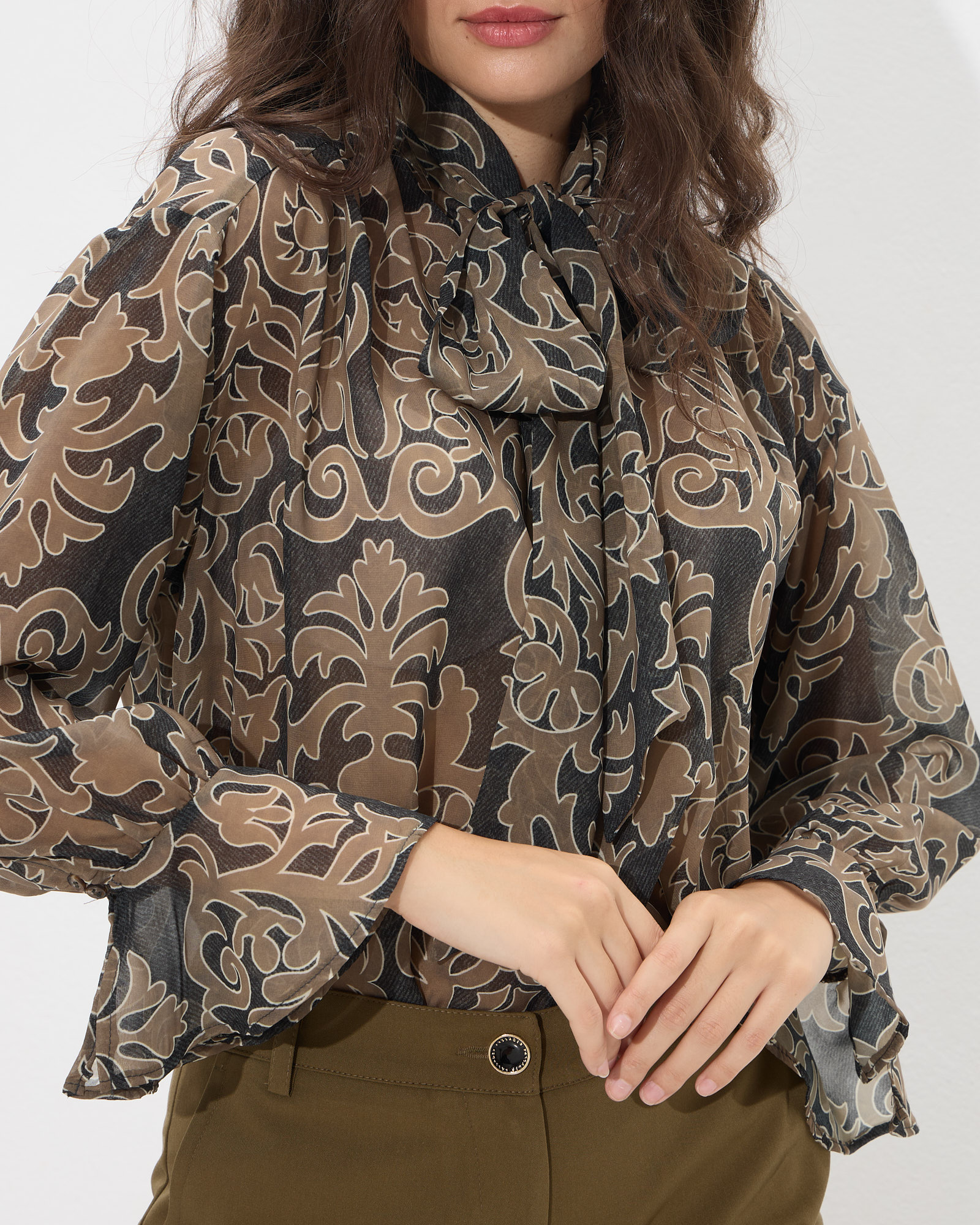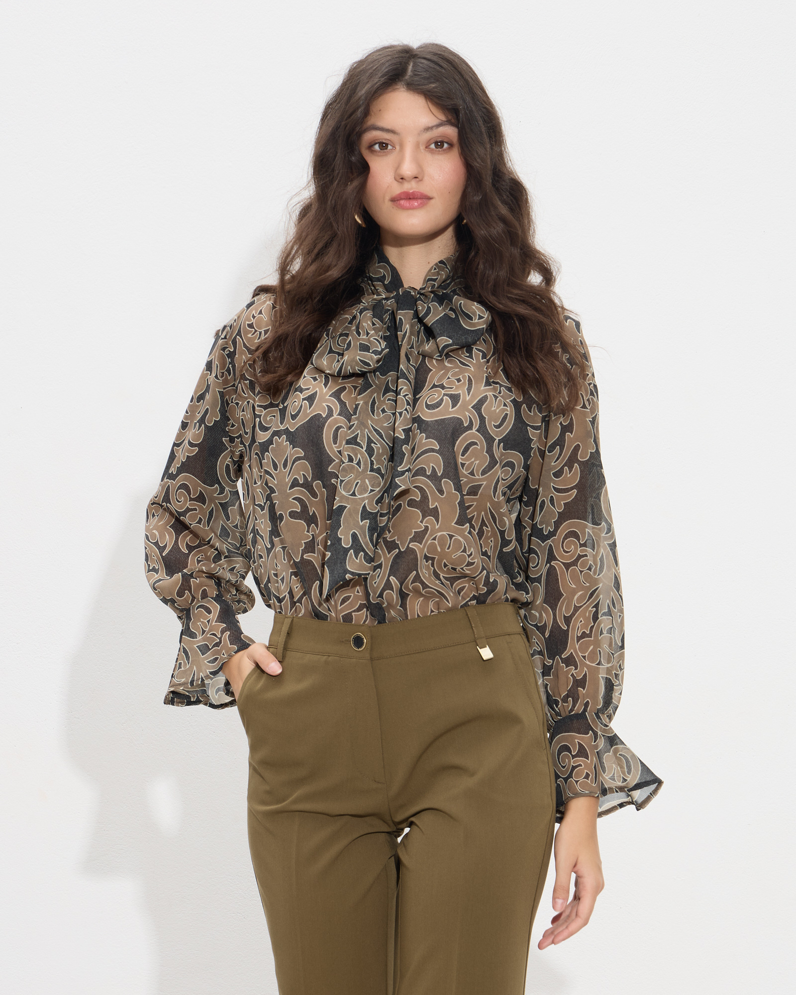 Μπλούζα εμπριμέ, λαιμόκοψη με δέσιμο σε φιόγκο, μακρύ μανίκι με βολάν στο τελείωμα, σε άνετη γραμμή