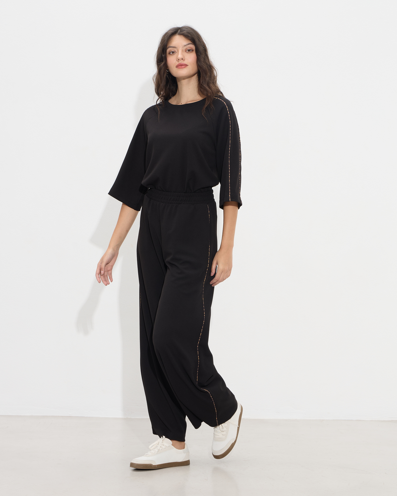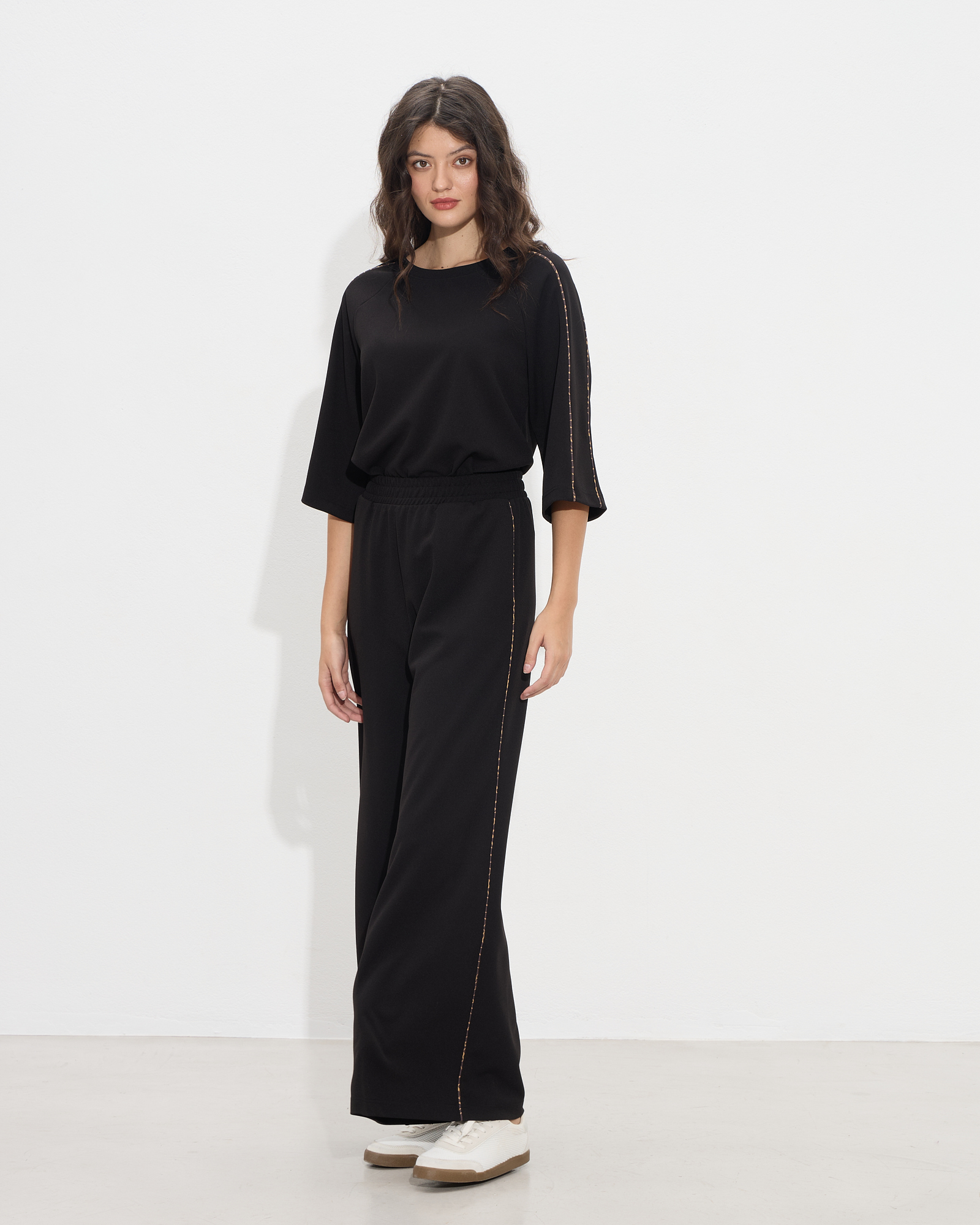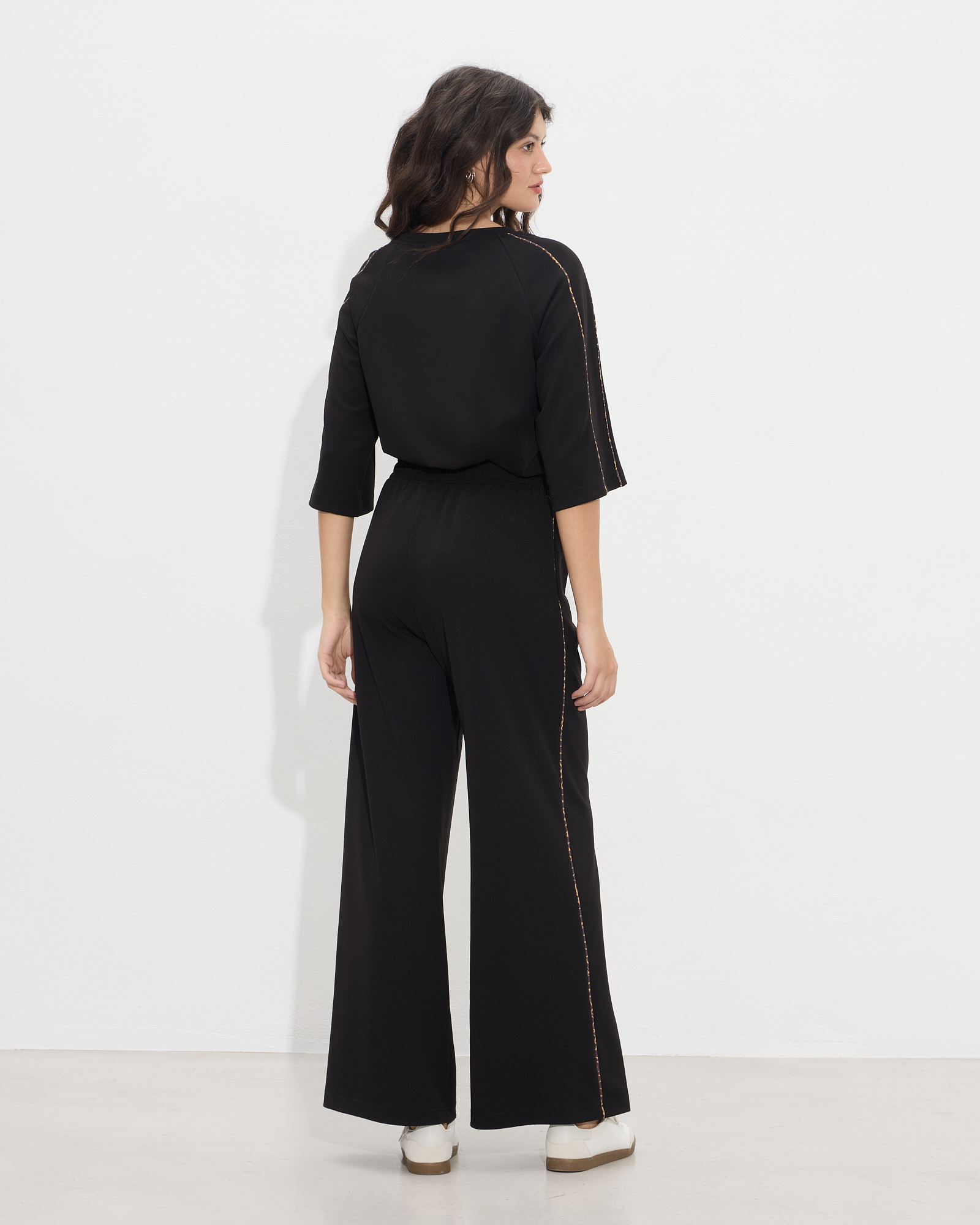 Παντελόνα ψηλόμεση με λάστιχο στη μέση, πλαϊνές τσέπες, λεπτομέρεια με λεοπάρ ρέλι, σε κανονική γραμμή