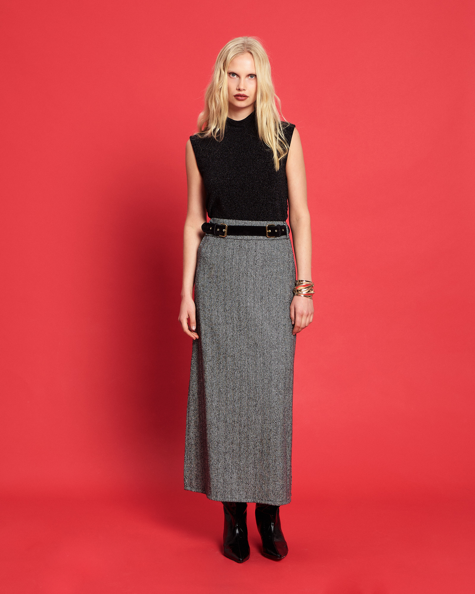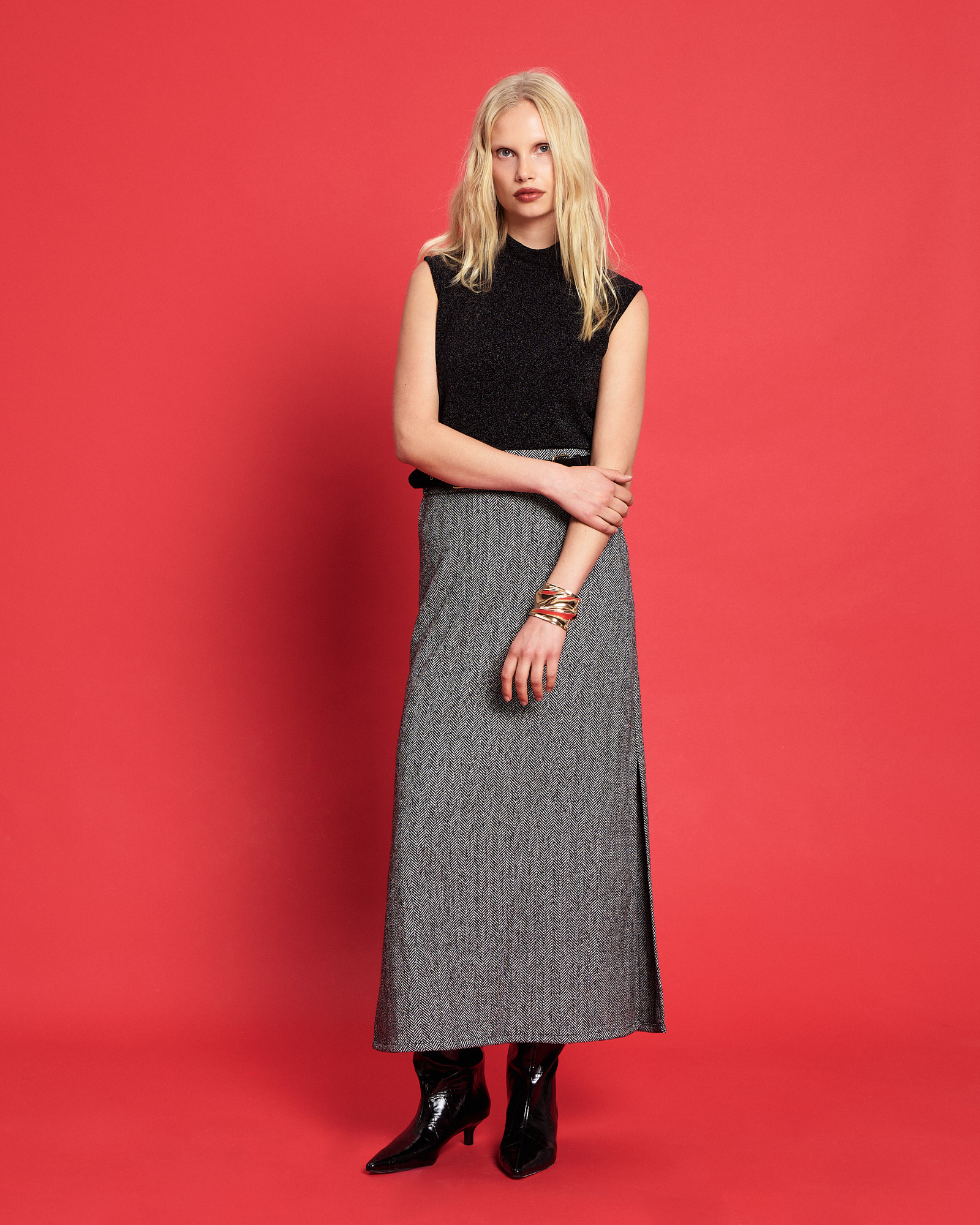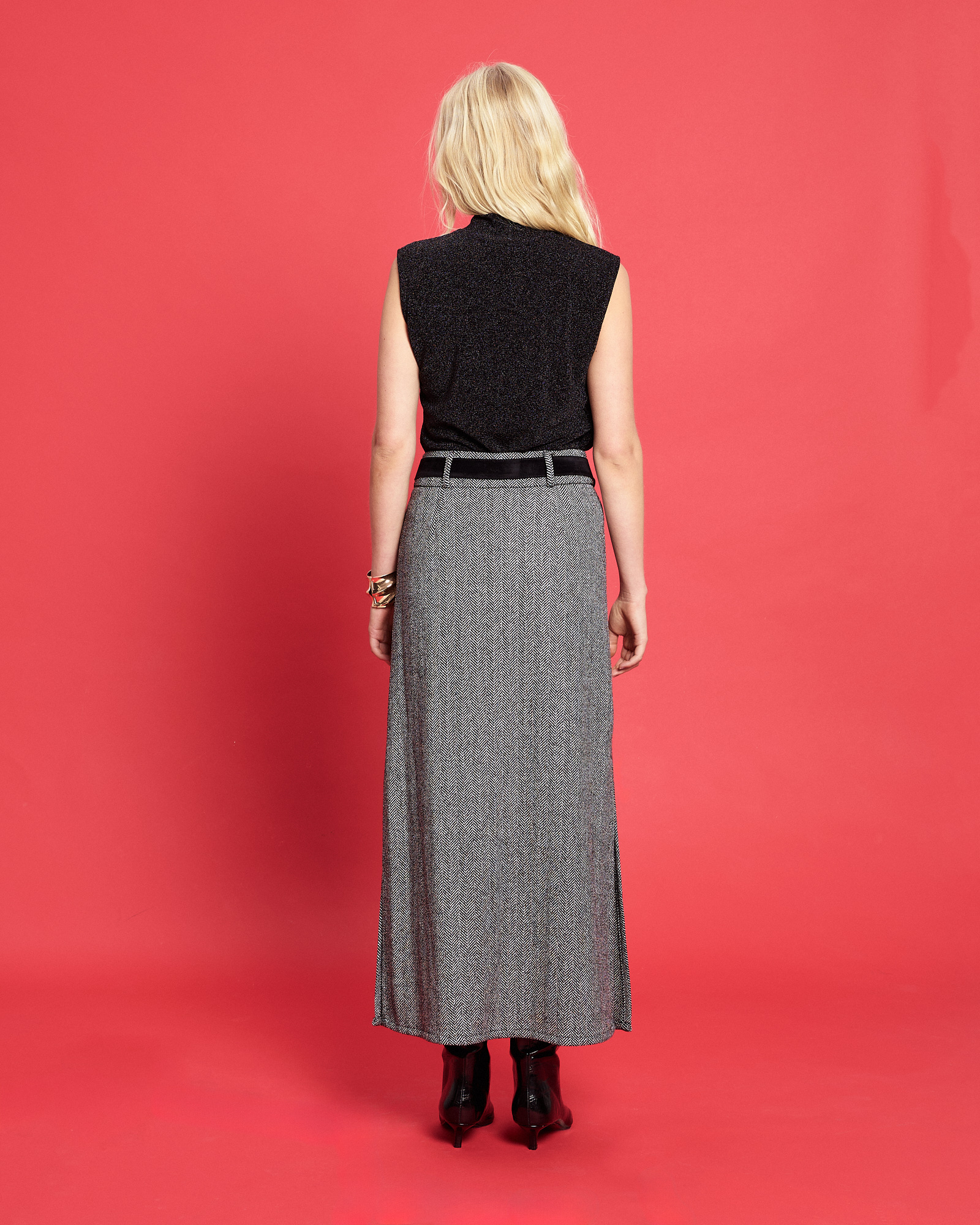 Φούστα midi ψηλόμεση, ψαροκόκκαλο, κλείσιμο με φερμουάρ στο πλάι, ζώνη, με σκισίματα, σε απαλή υφή, σε κανονική εφαρμογή