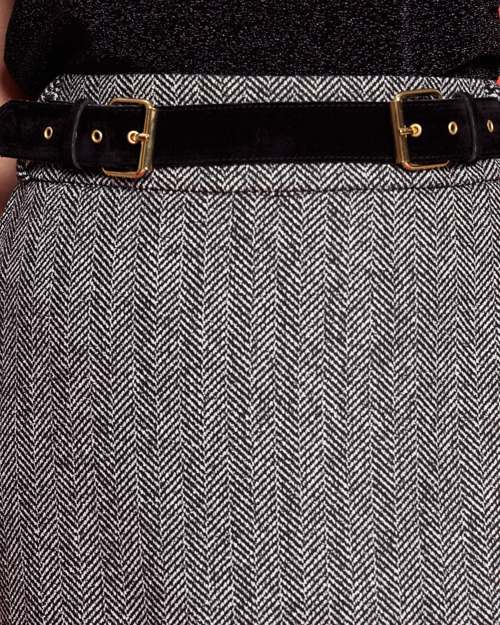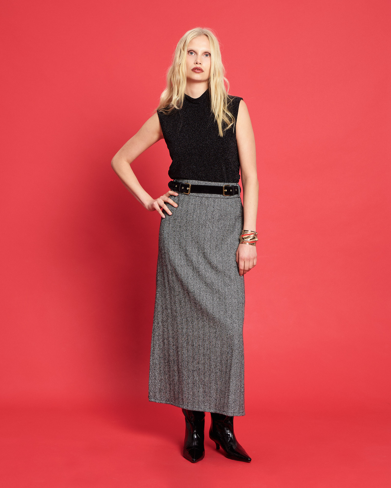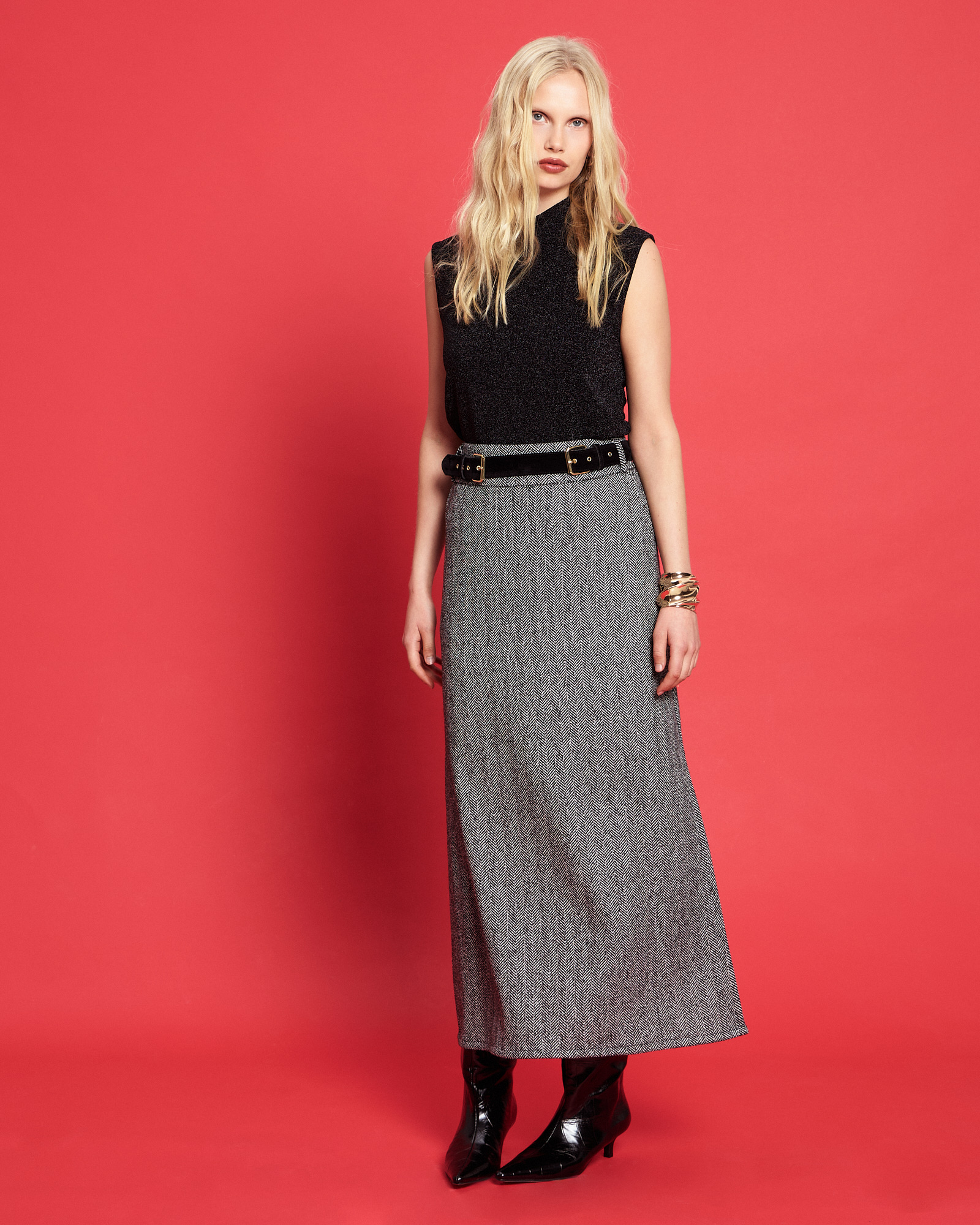 Φούστα midi ψηλόμεση, ψαροκόκκαλο, κλείσιμο με φερμουάρ στο πλάι, ζώνη, με σκισίματα, σε απαλή υφή, σε κανονική εφαρμογή