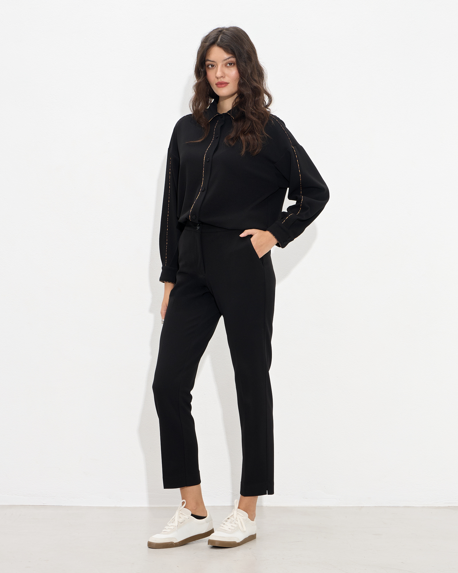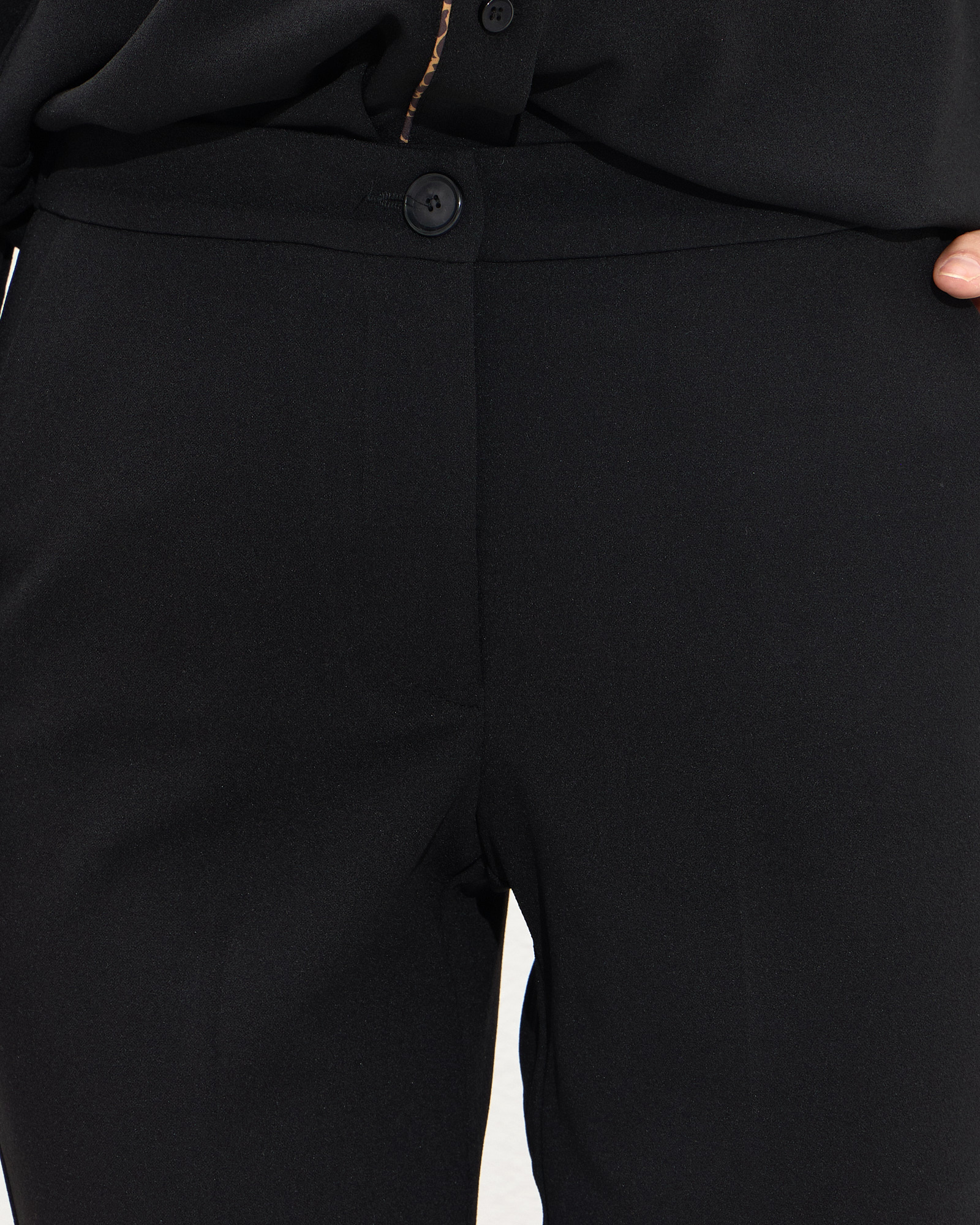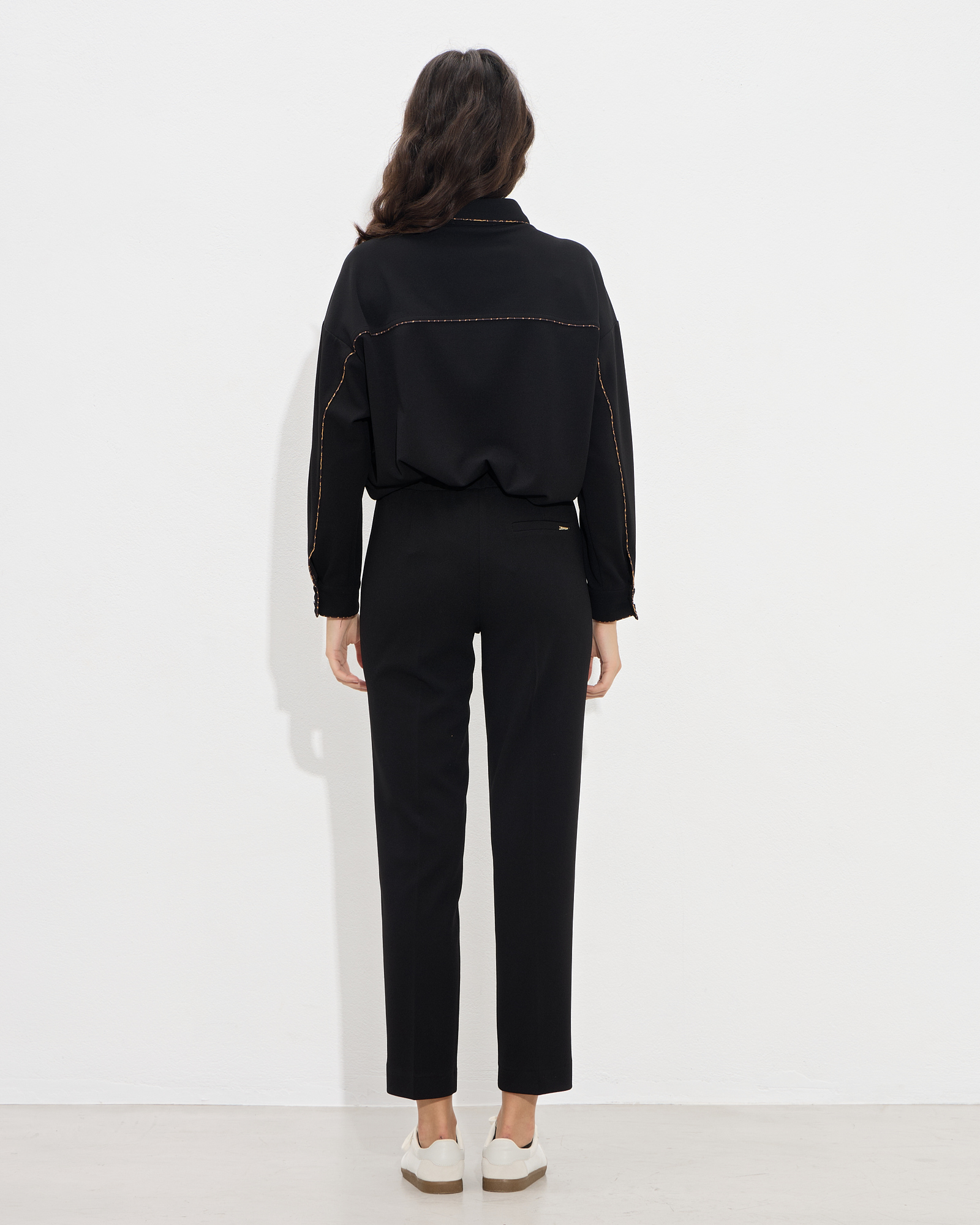 Παντελόνι cigarette ψηλόμεσο με λάστιχο στο πίσω μέρος, κλείσιμο με κουμπί και φερμουάρ μπροστά, πλαϊνές τσέπες, σε ελαστικό πανί, σε κανονική γραμμή