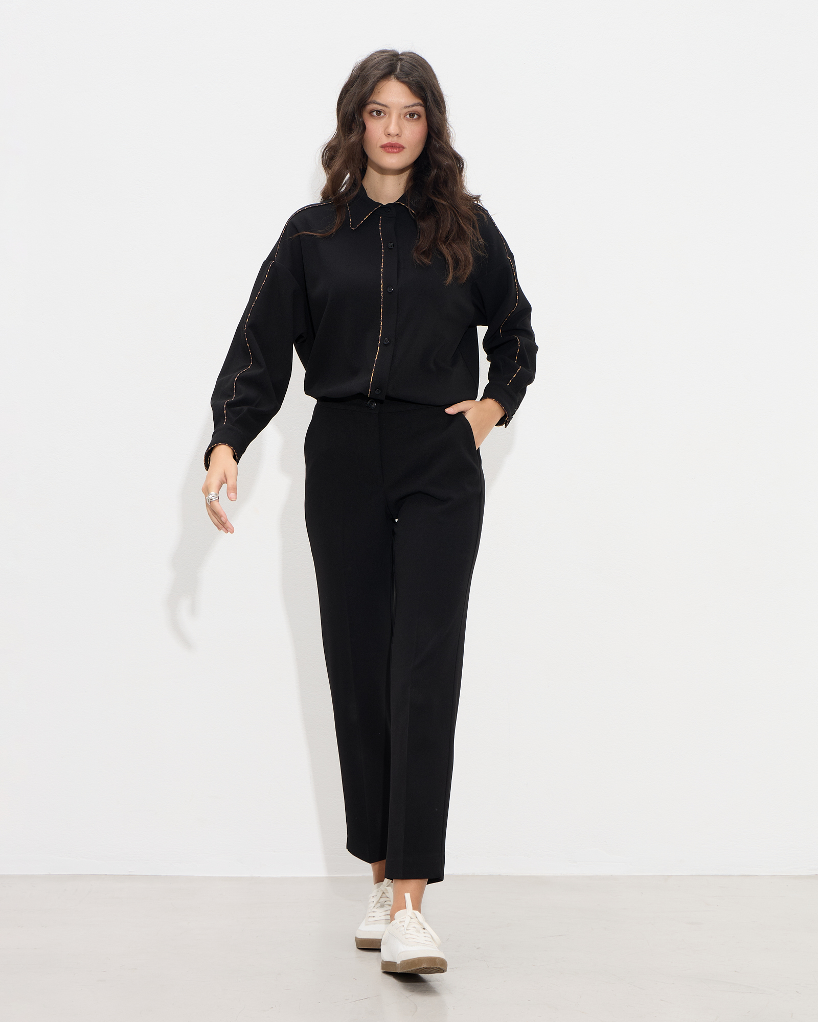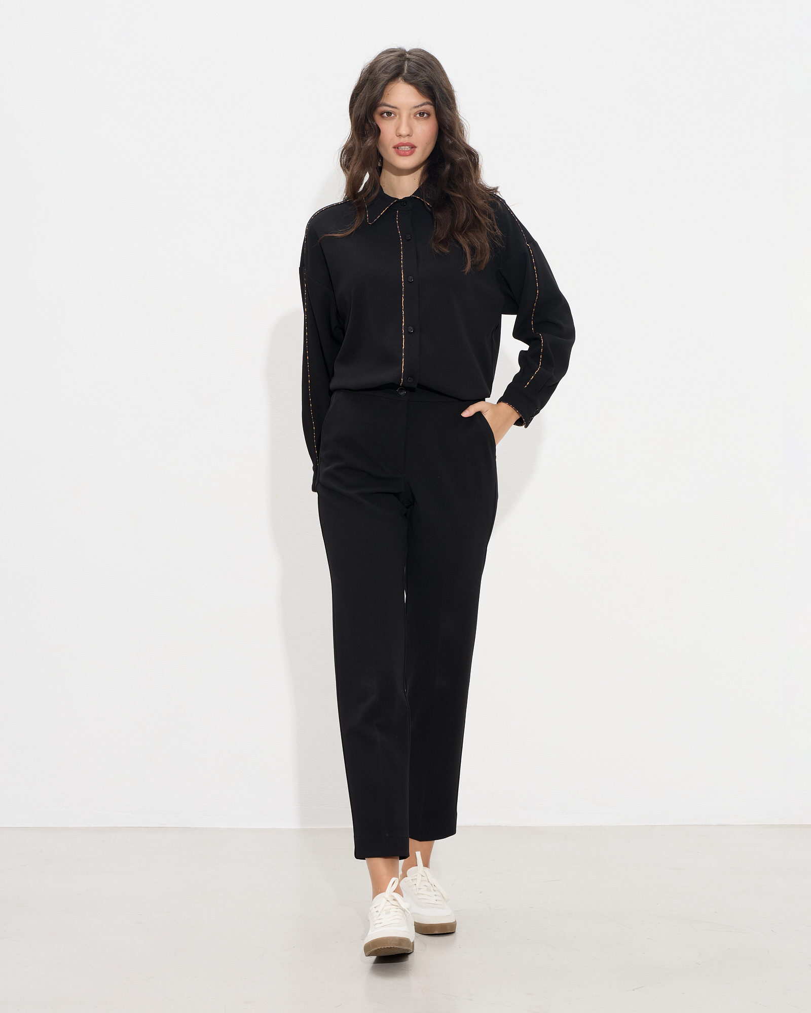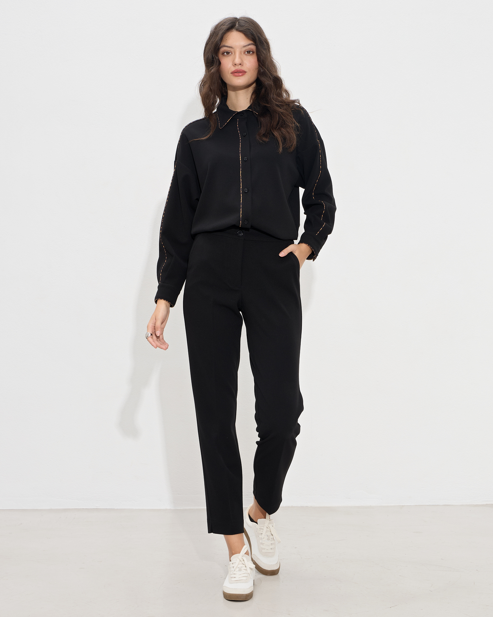 Παντελόνι cigarette ψηλόμεσο με λάστιχο στο πίσω μέρος, κλείσιμο με κουμπί και φερμουάρ μπροστά, πλαϊνές τσέπες, σε ελαστικό πανί, σε κανονική γραμμή